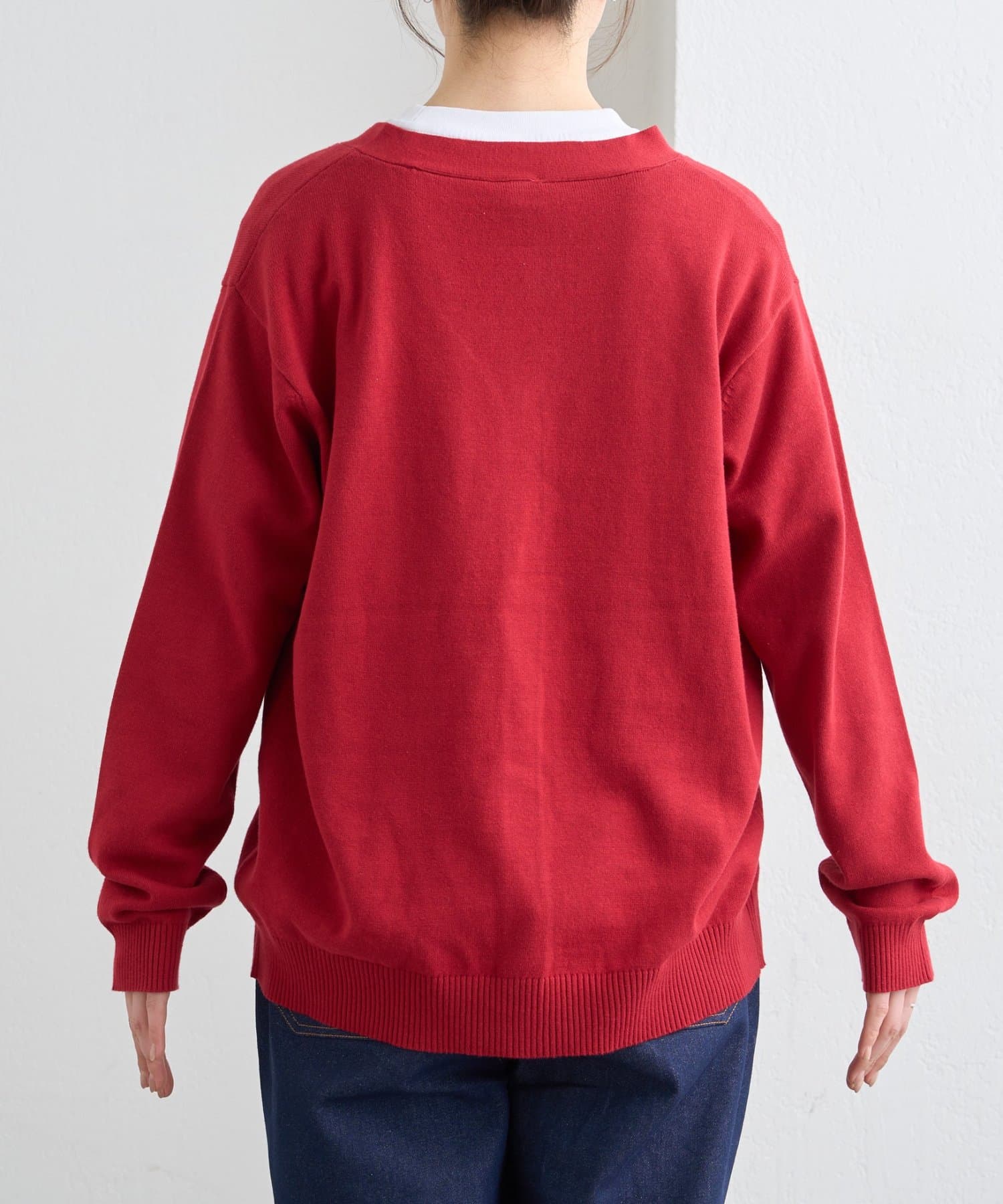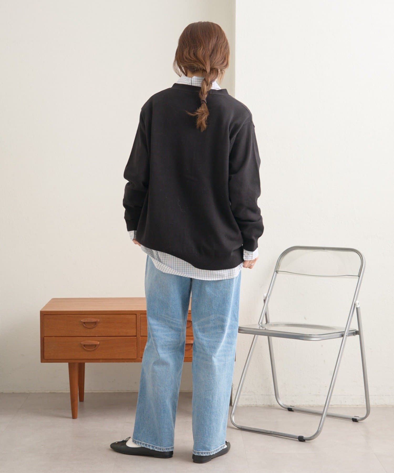 シャツと合わせれば、Vネックラインが首元をすっきり見せ、きれいめな印象にも対応。