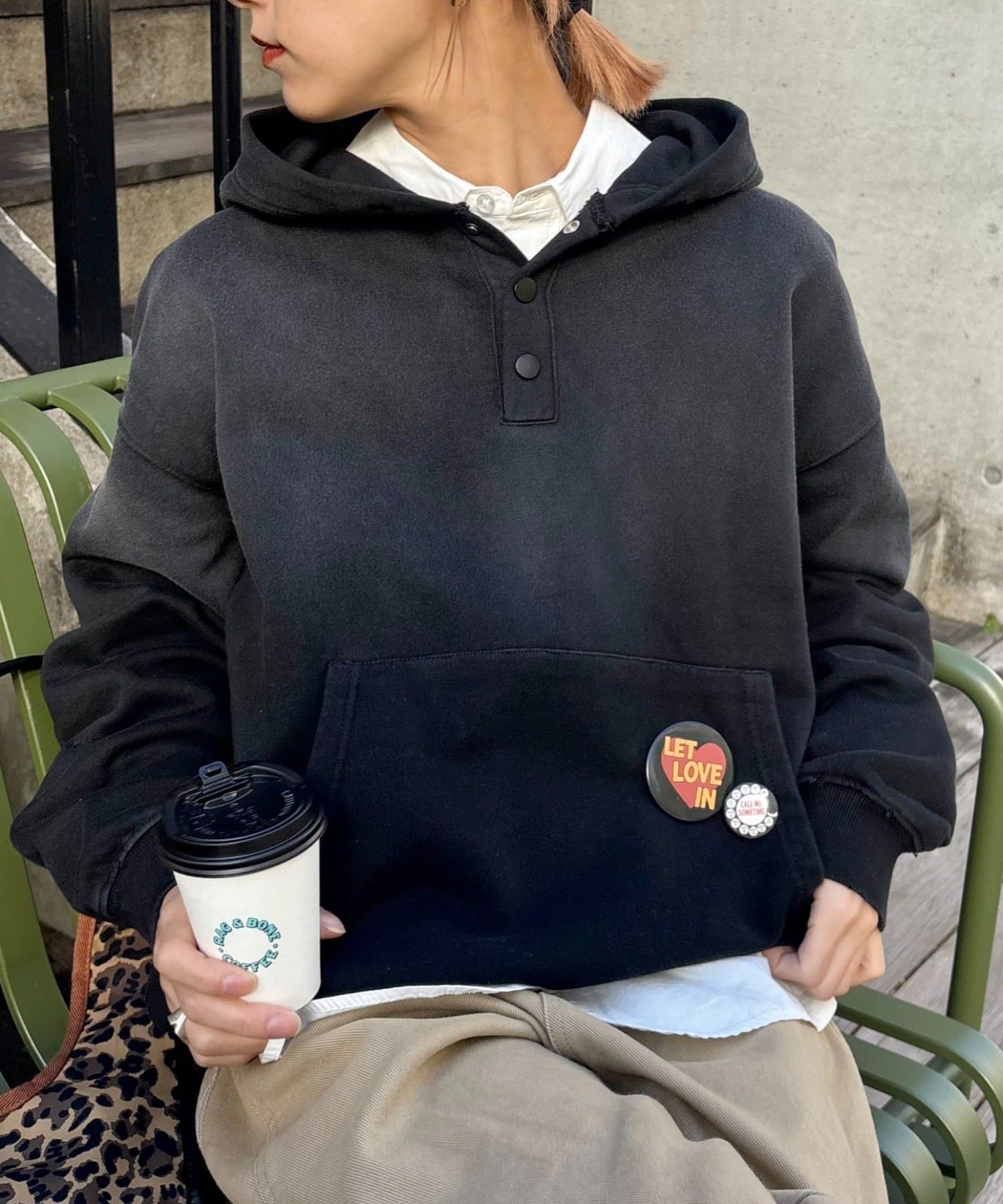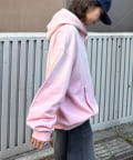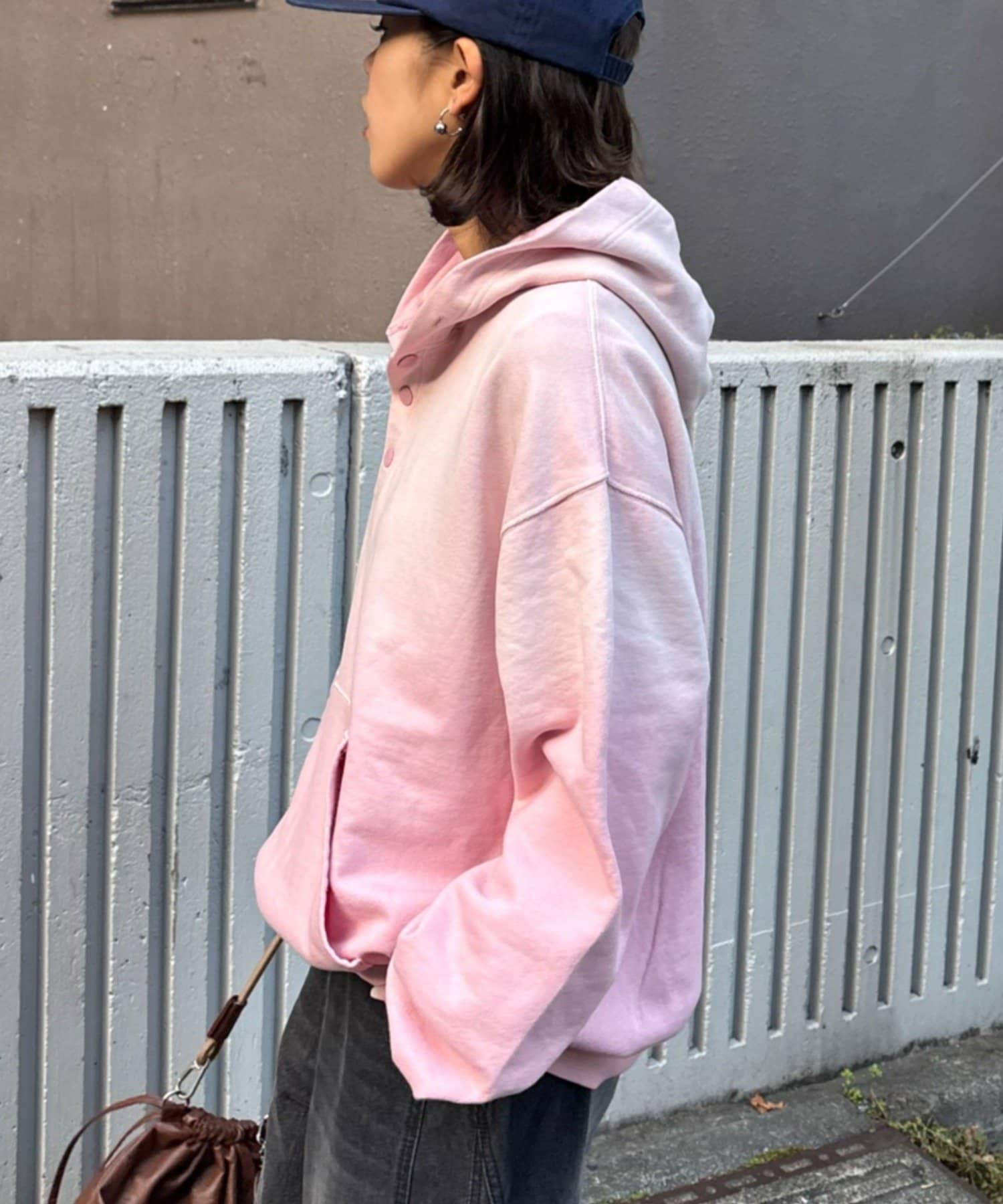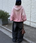 カジュアルな印象の強いフーディを、ヘンリーネックとスプレー加工で大人可愛い印象に仕上げました。