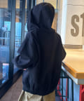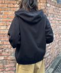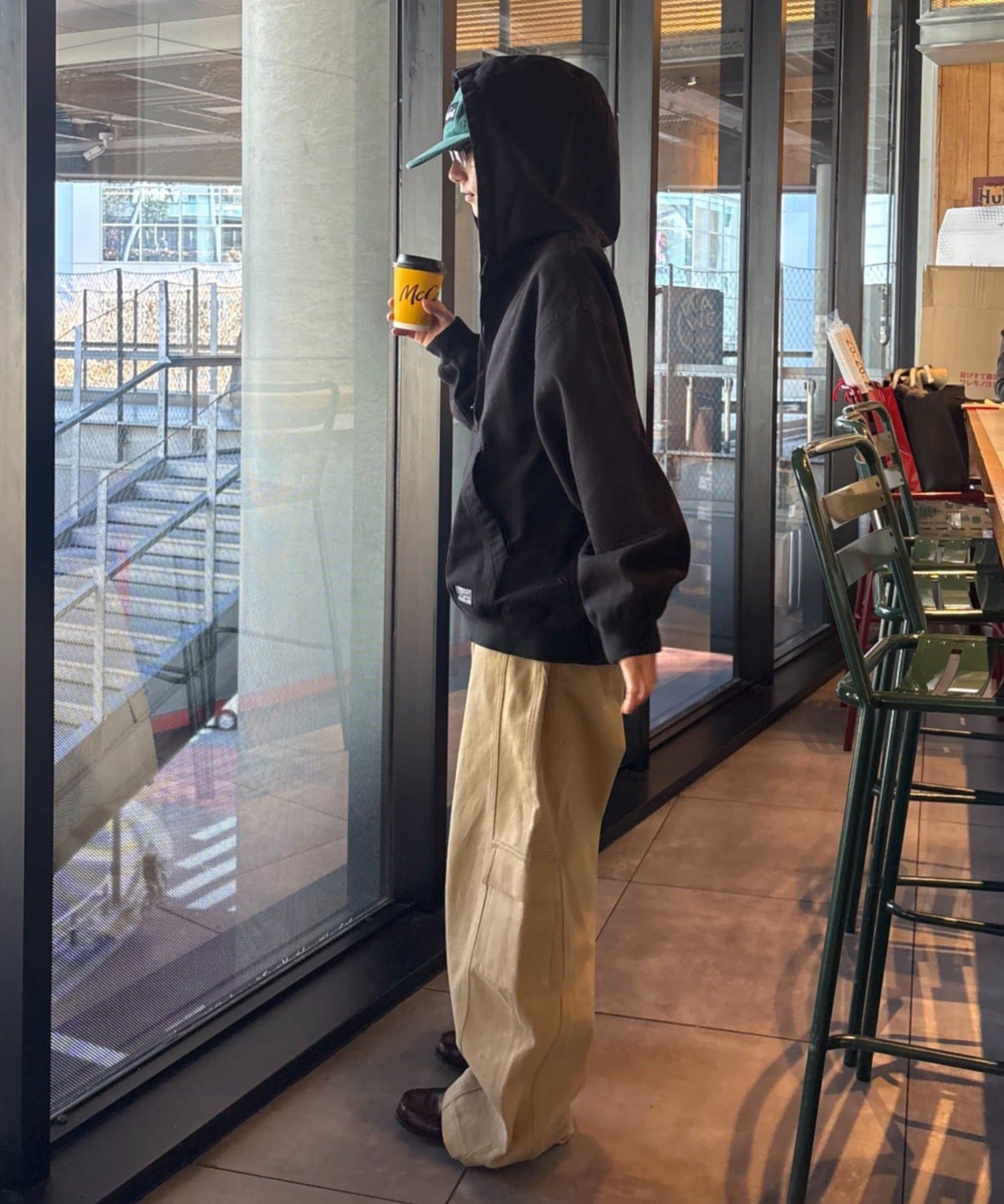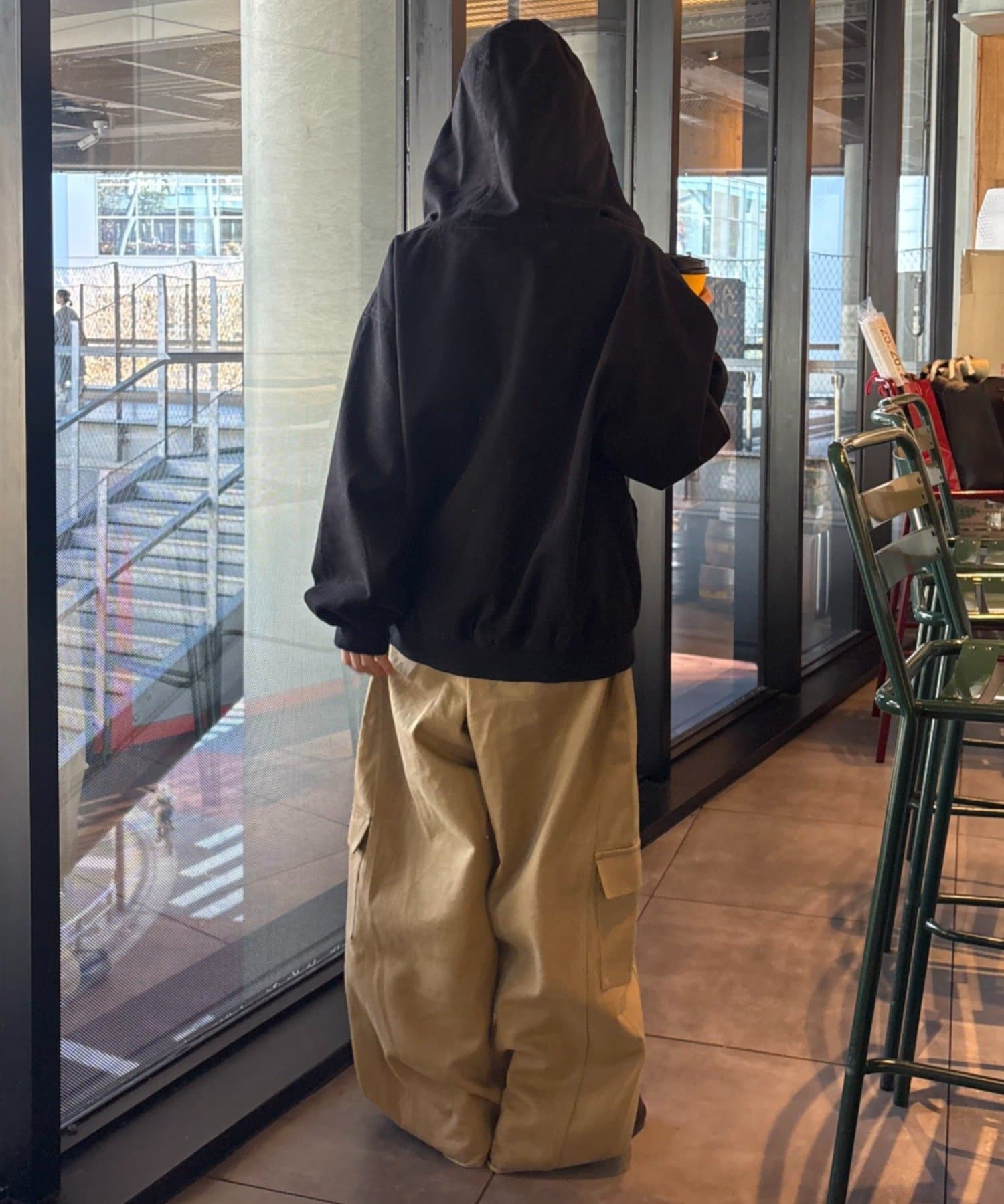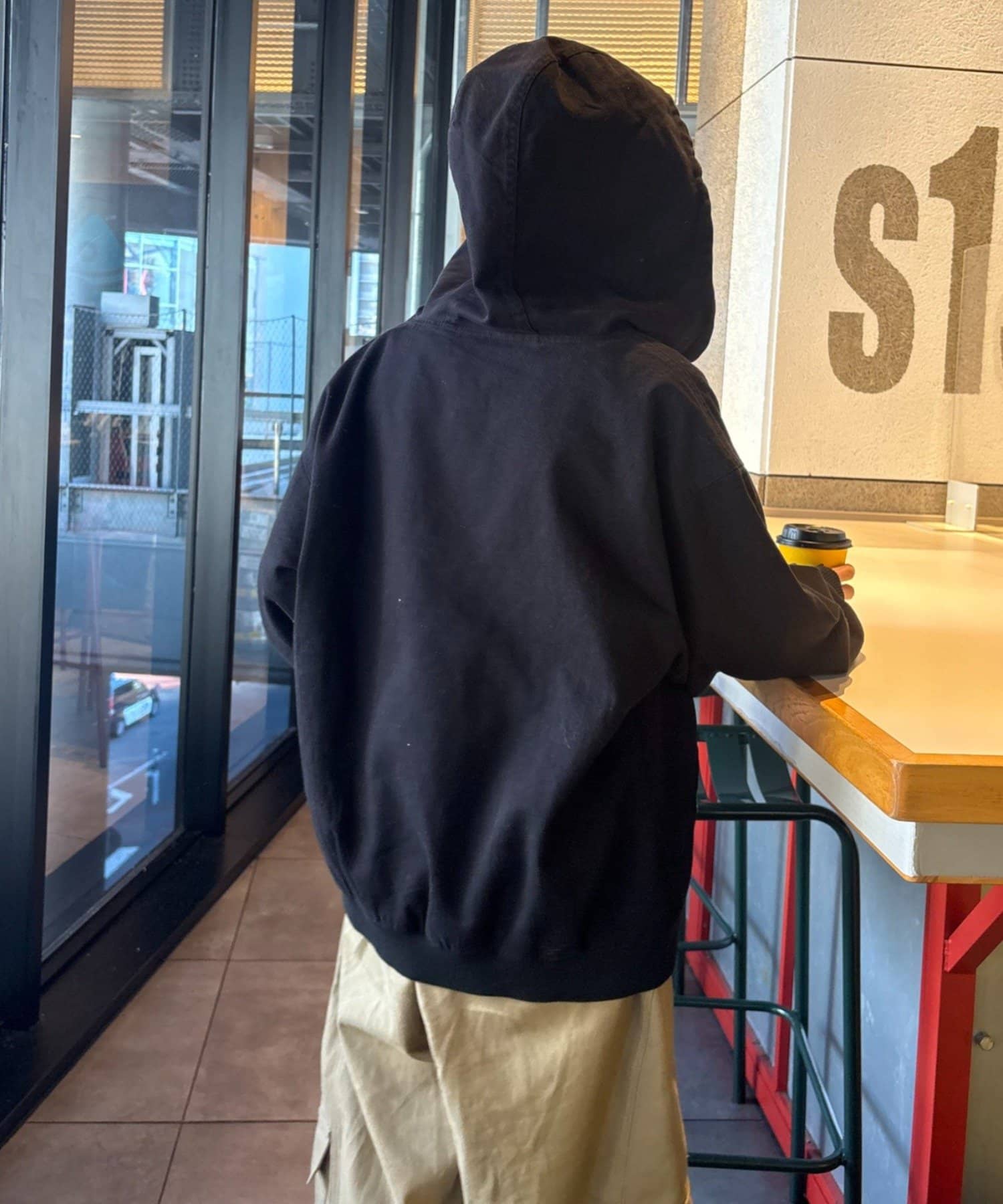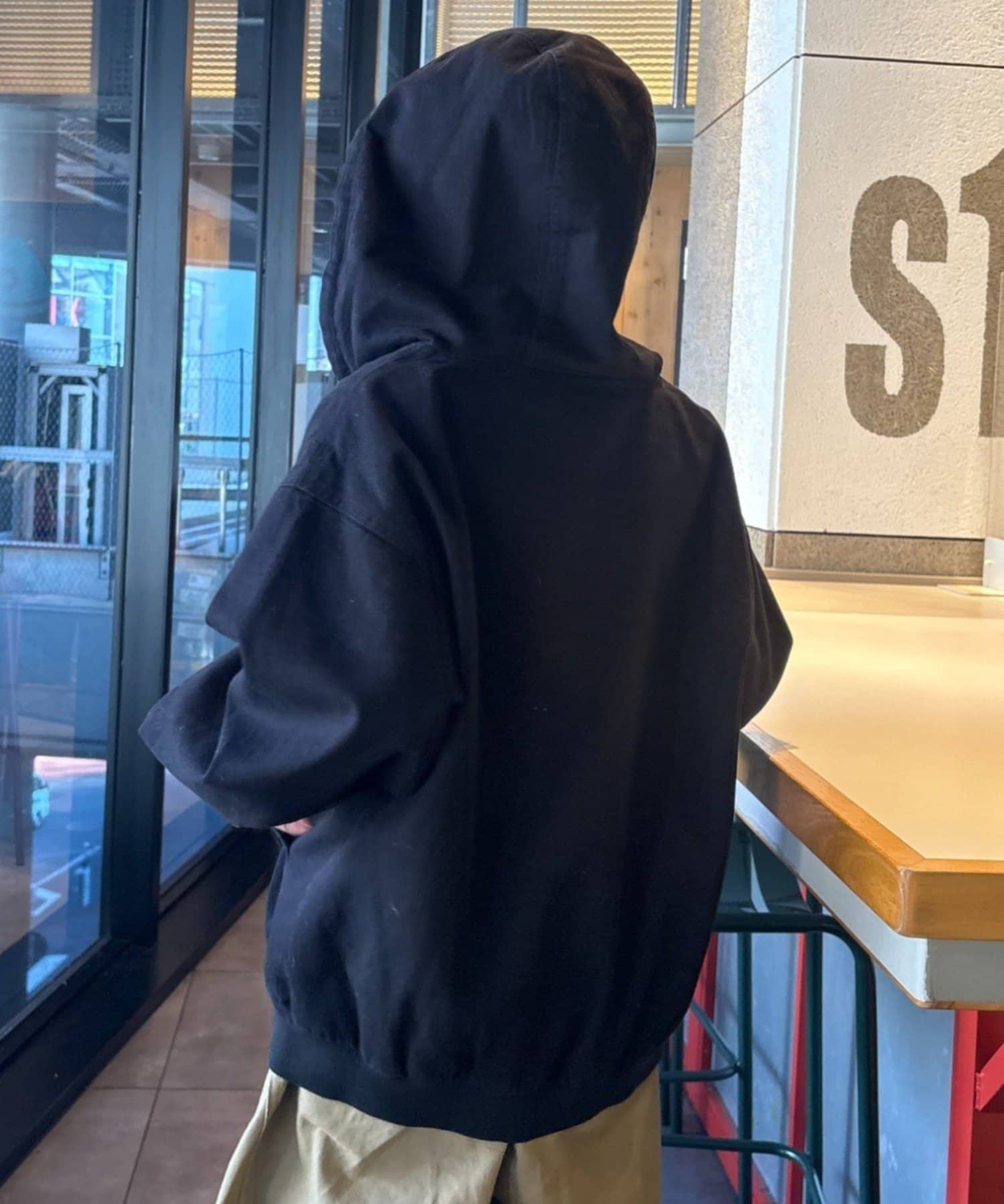 フードの紐がアクセントになり、後ろ姿もおしゃれに決まります。
