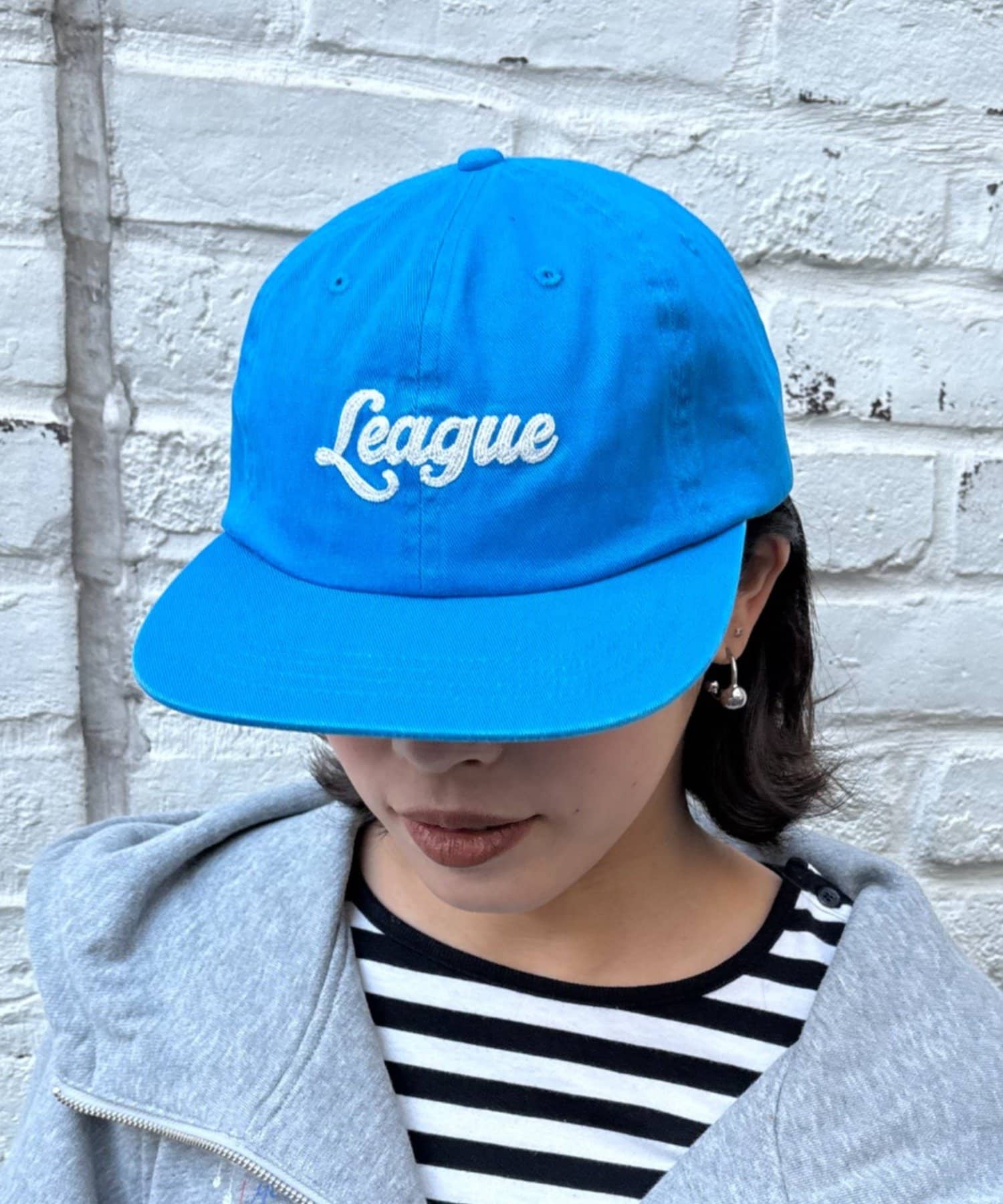 鮮やかなカラーが目を引くキャップ。フロントには「League」のロゴが刺繍されており、キャッチーでカジュアルな印象を与えます。