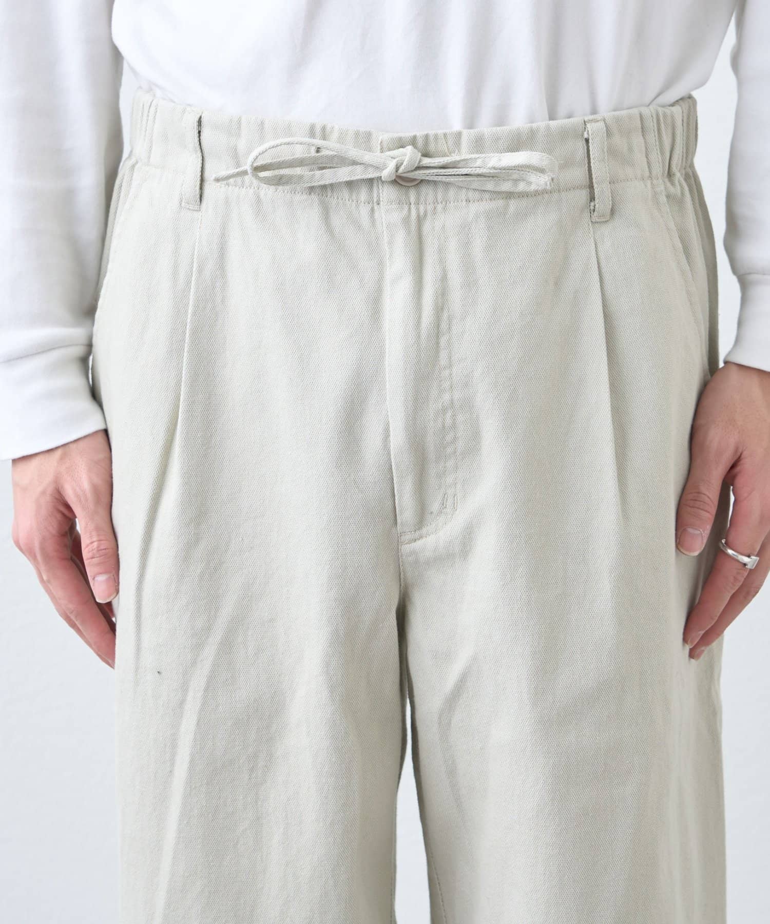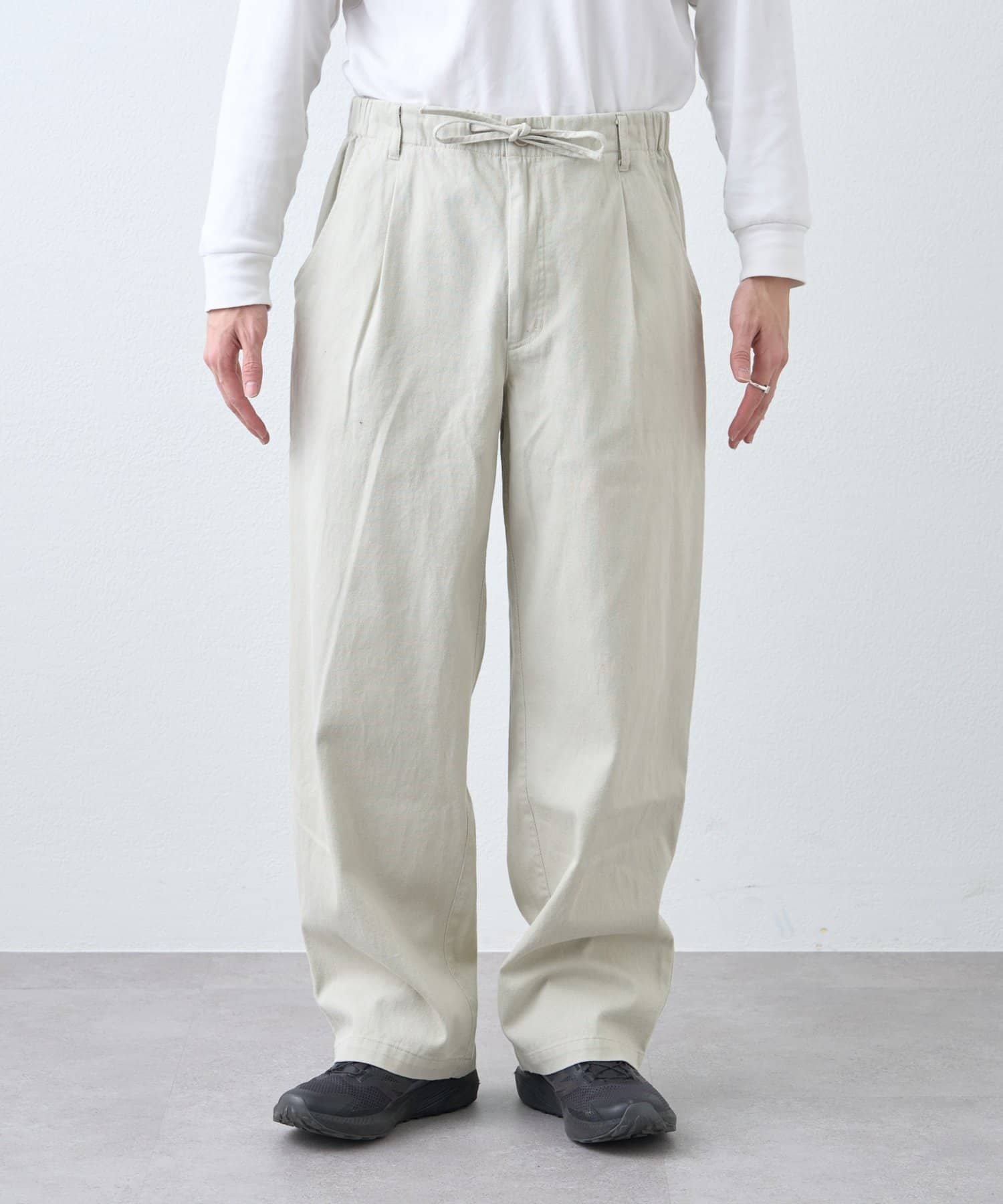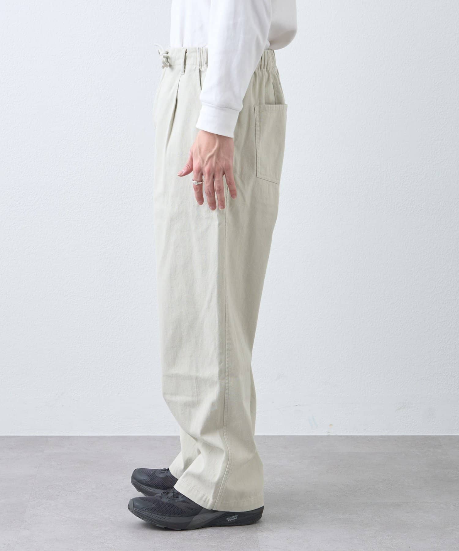 ウエストはゴム仕様でストレスなく着用でき、デイリーに使いやすい一本です。