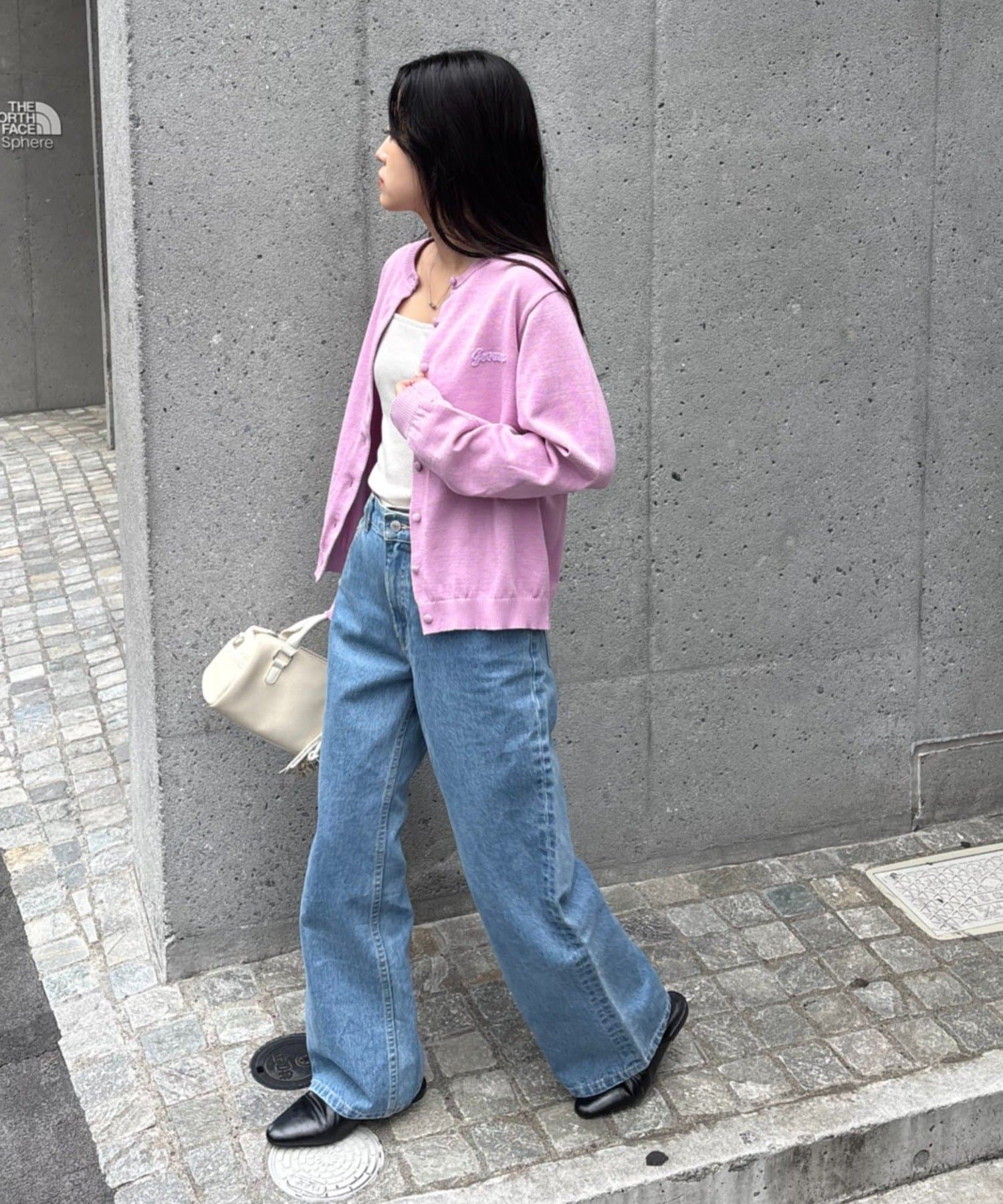 刺繍ロゴやボタンなどいつものコーデにちょっと甘めを足してみて◎