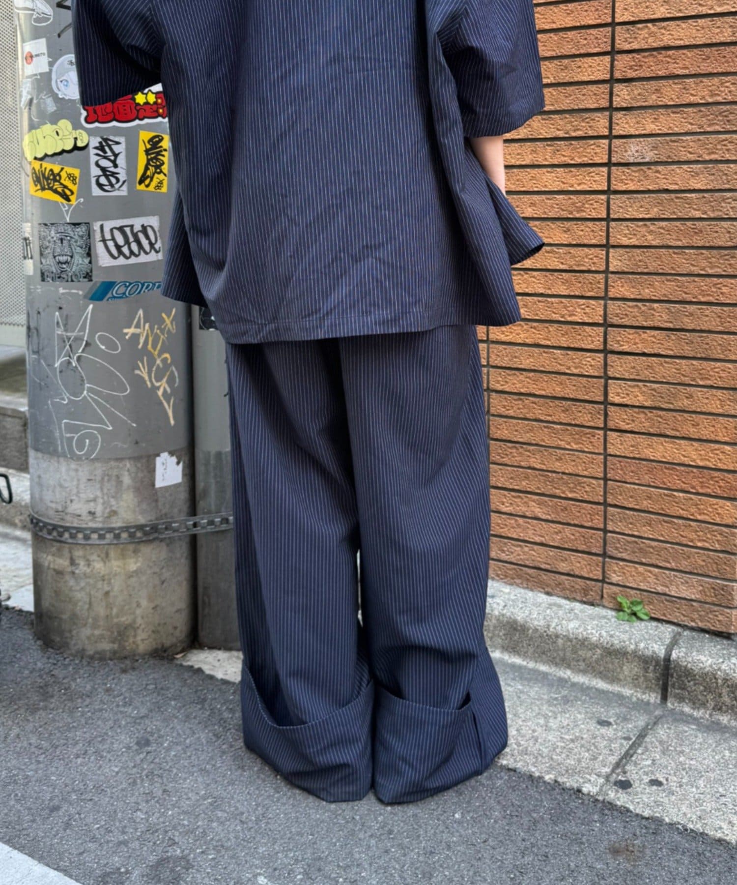 ピンストライプを活かし、シャツを羽織って少しきれいめに寄せるスタイルもお洒落。