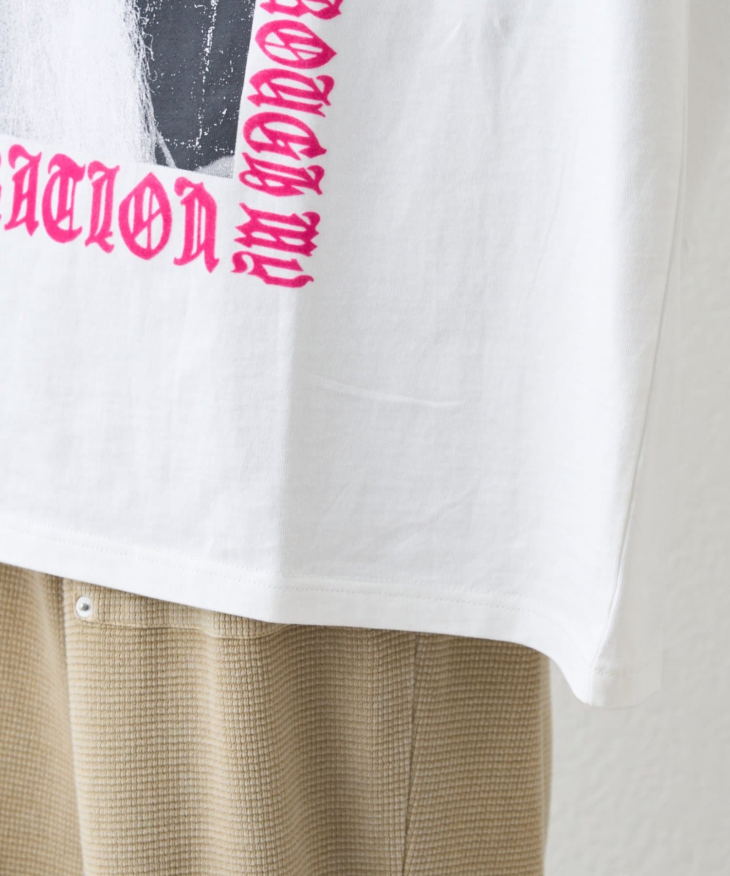 大胆なグラフィックが目を引くTシャツ。モノクロ写真に重ねられた鮮やかな文字の組み合わせが、強烈なインパクトを与えます。