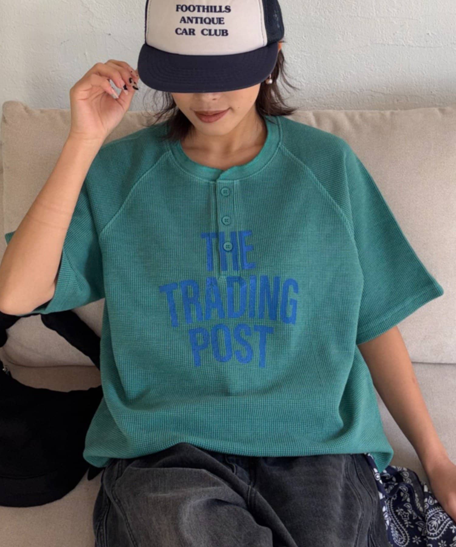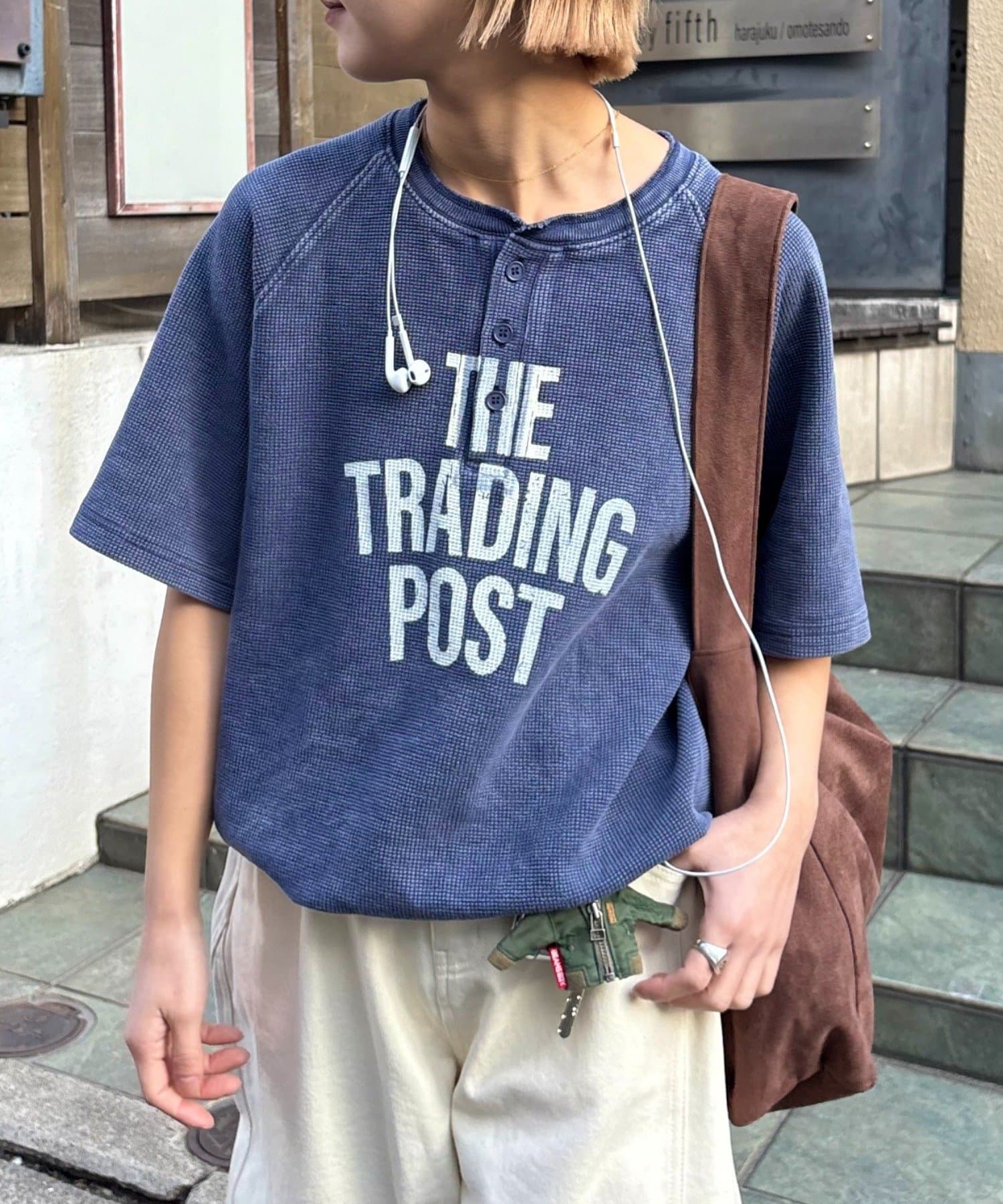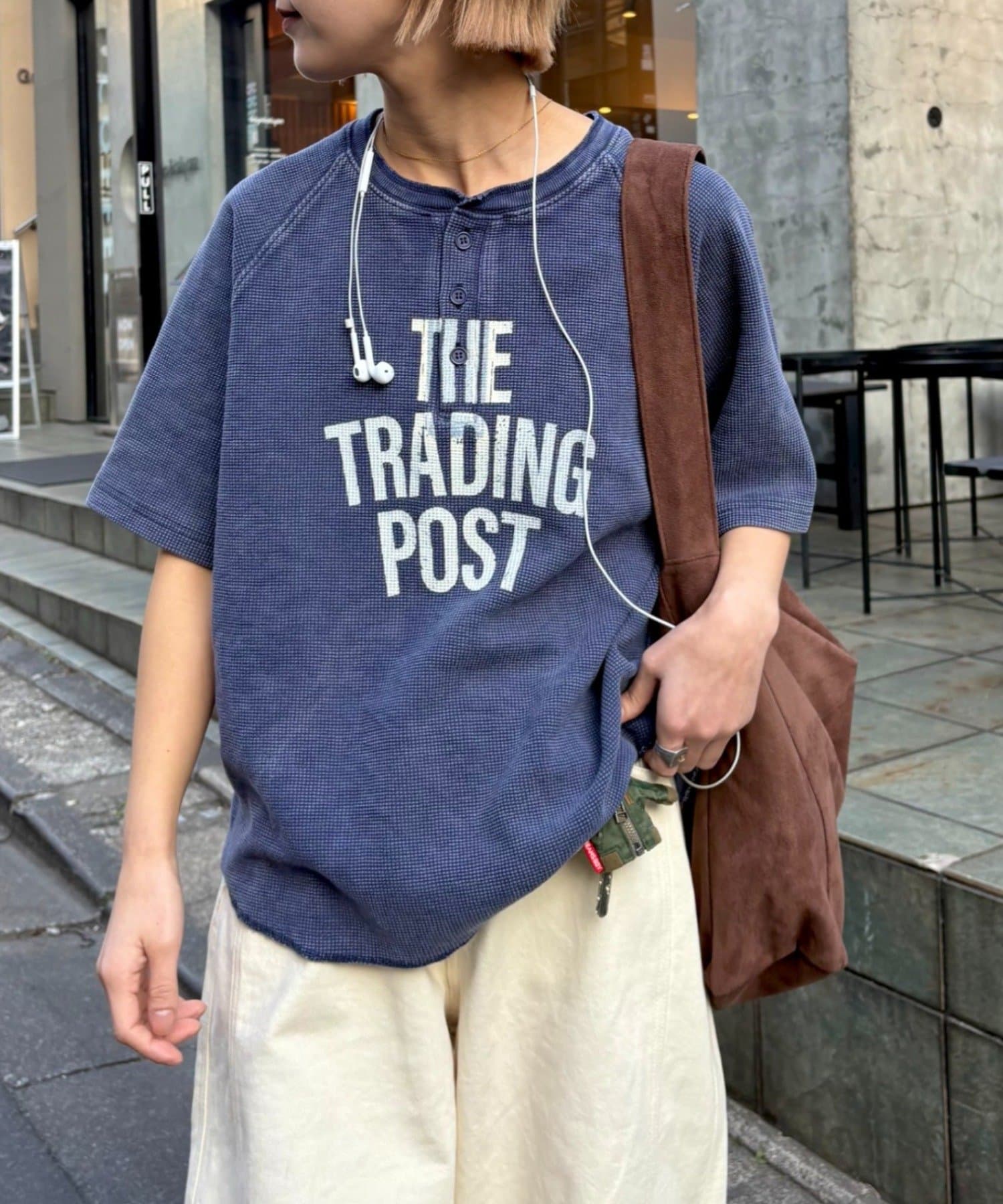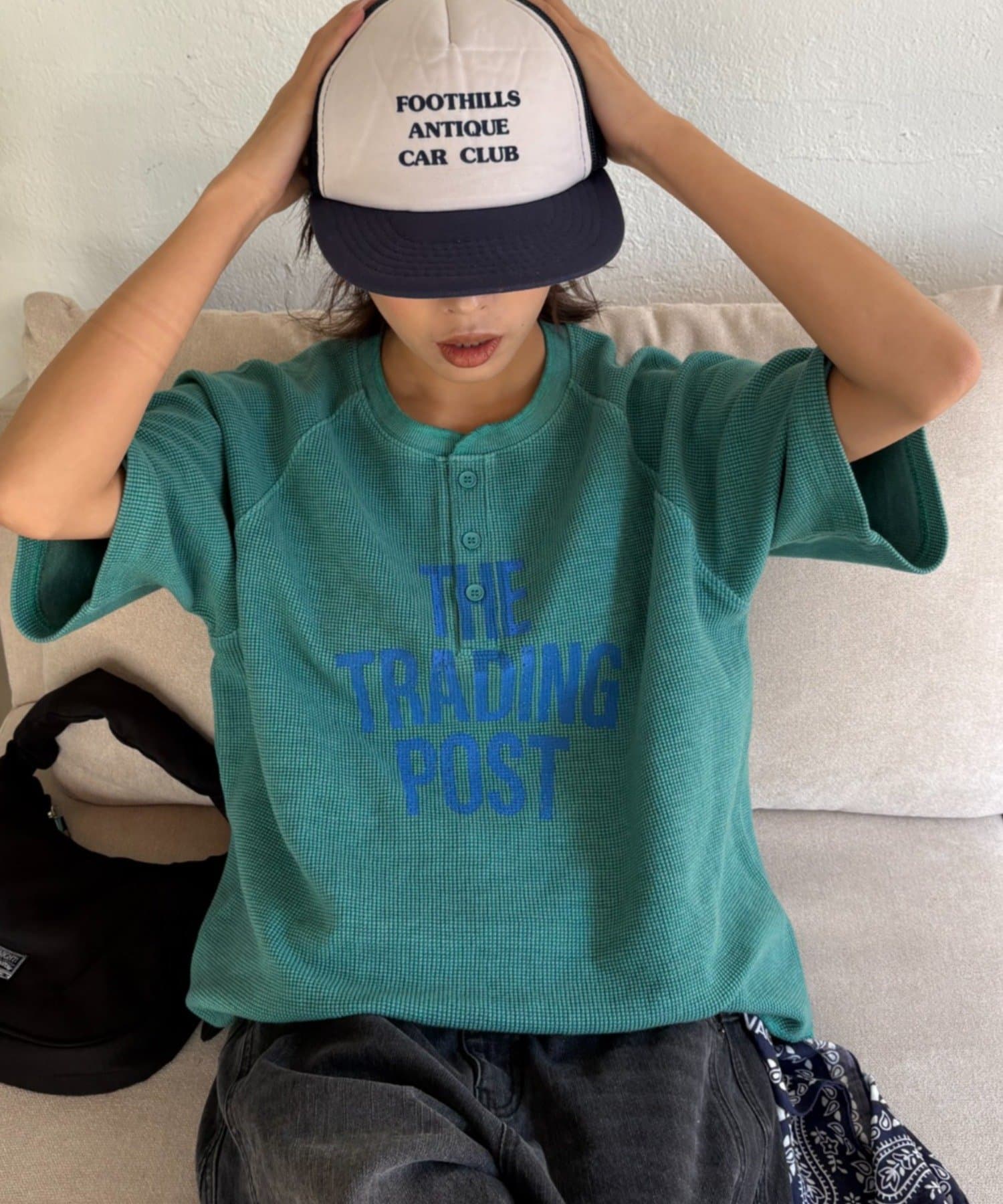 古着のような風合いのワッフル生地に、かすれたロゴプリントがこなれ感を演出します。