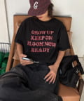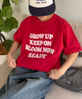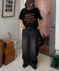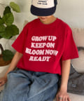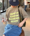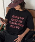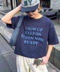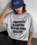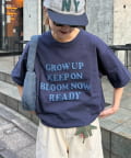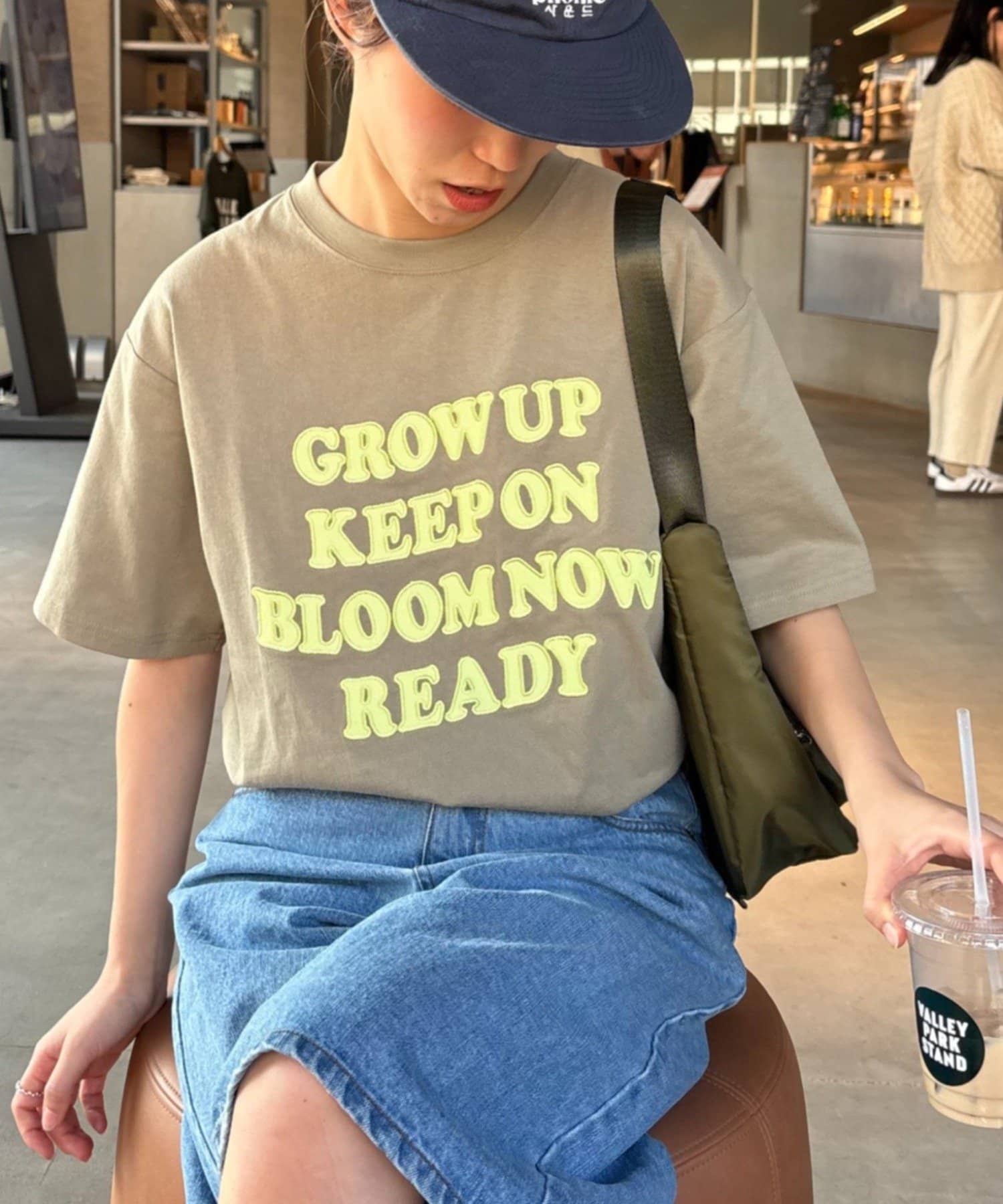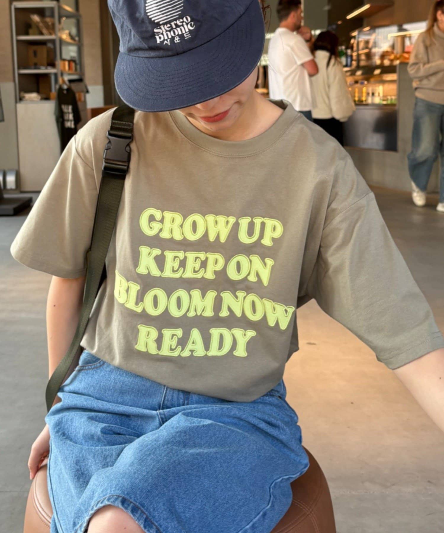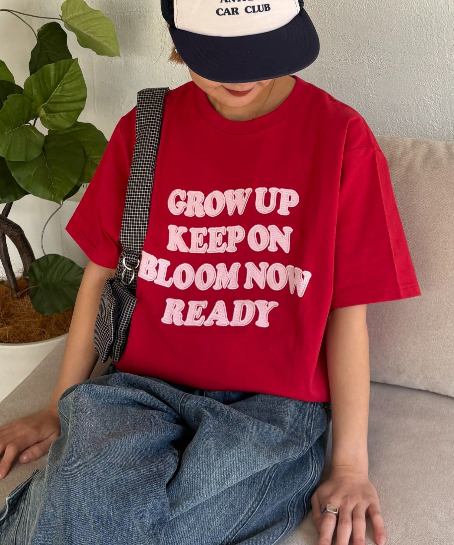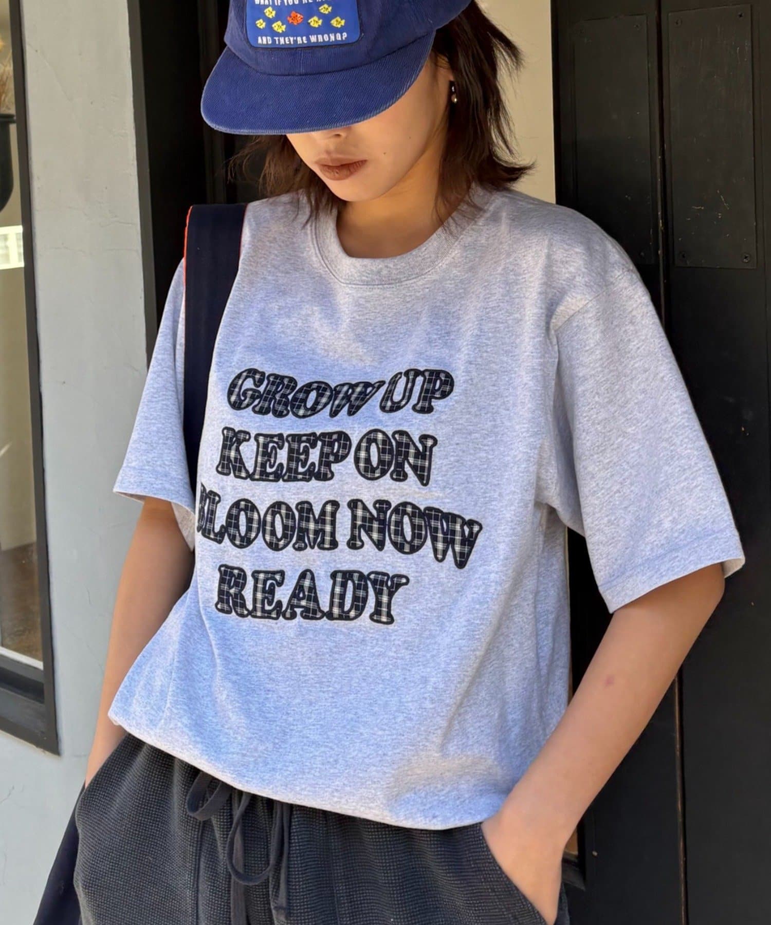 フロントに大きくアップリケされた英字メッセージが目を引くTシャツ。