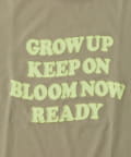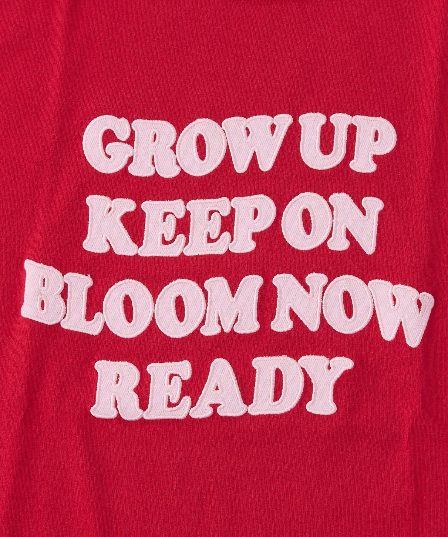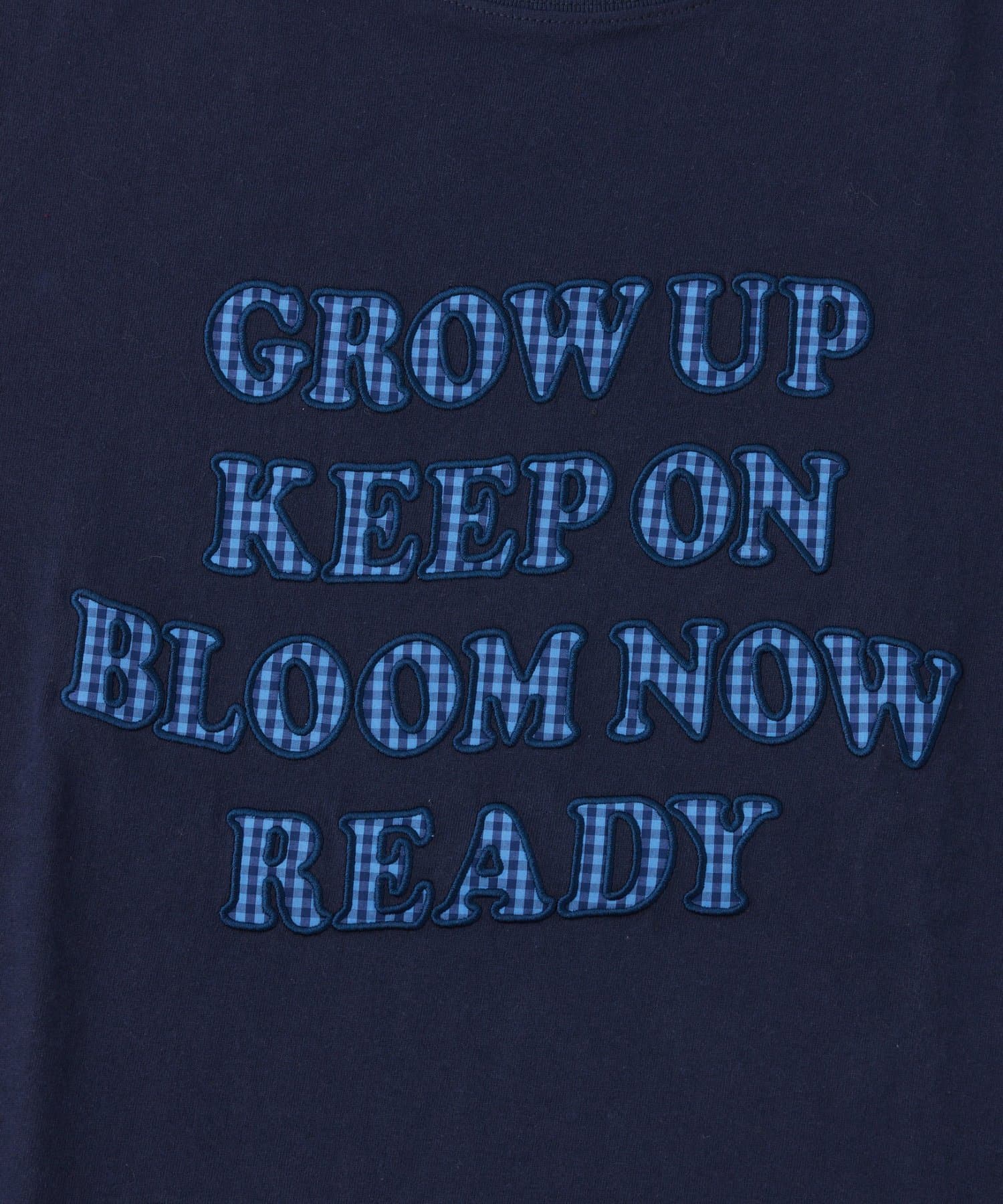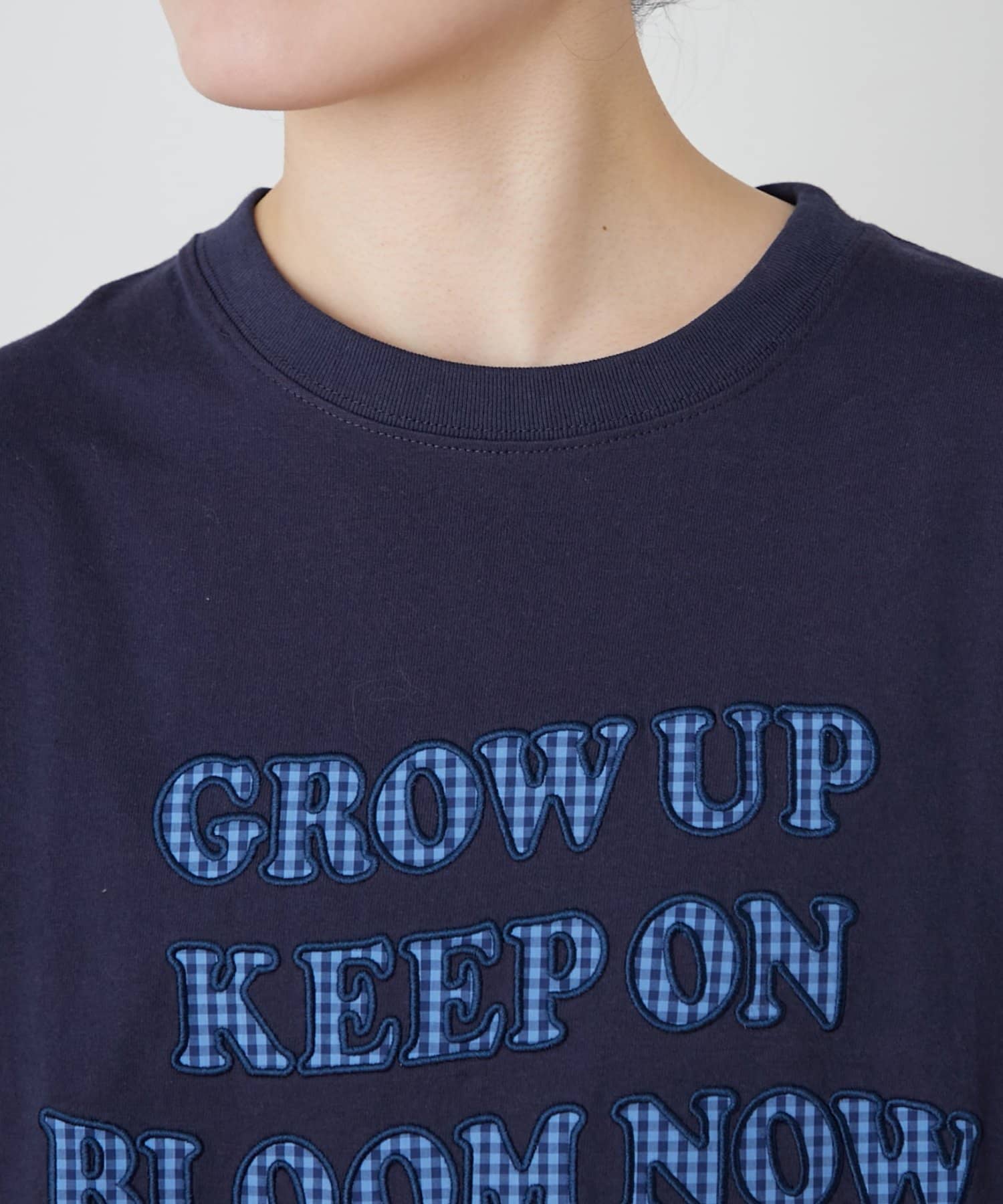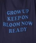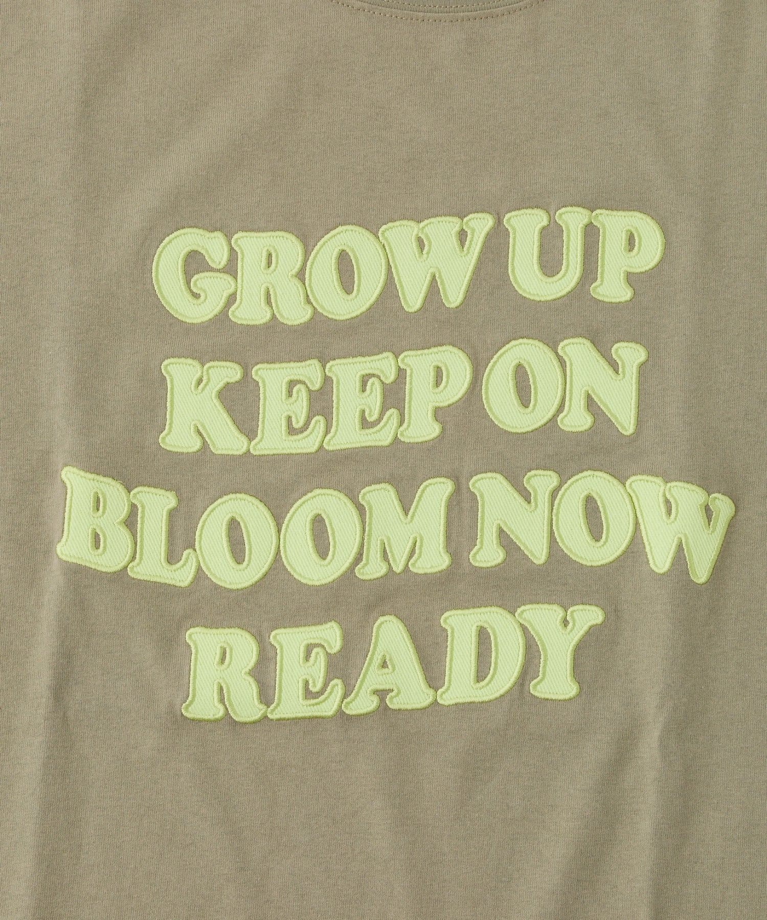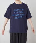 フロントに大きくアップリケされた英字メッセージが目を引くTシャツ。