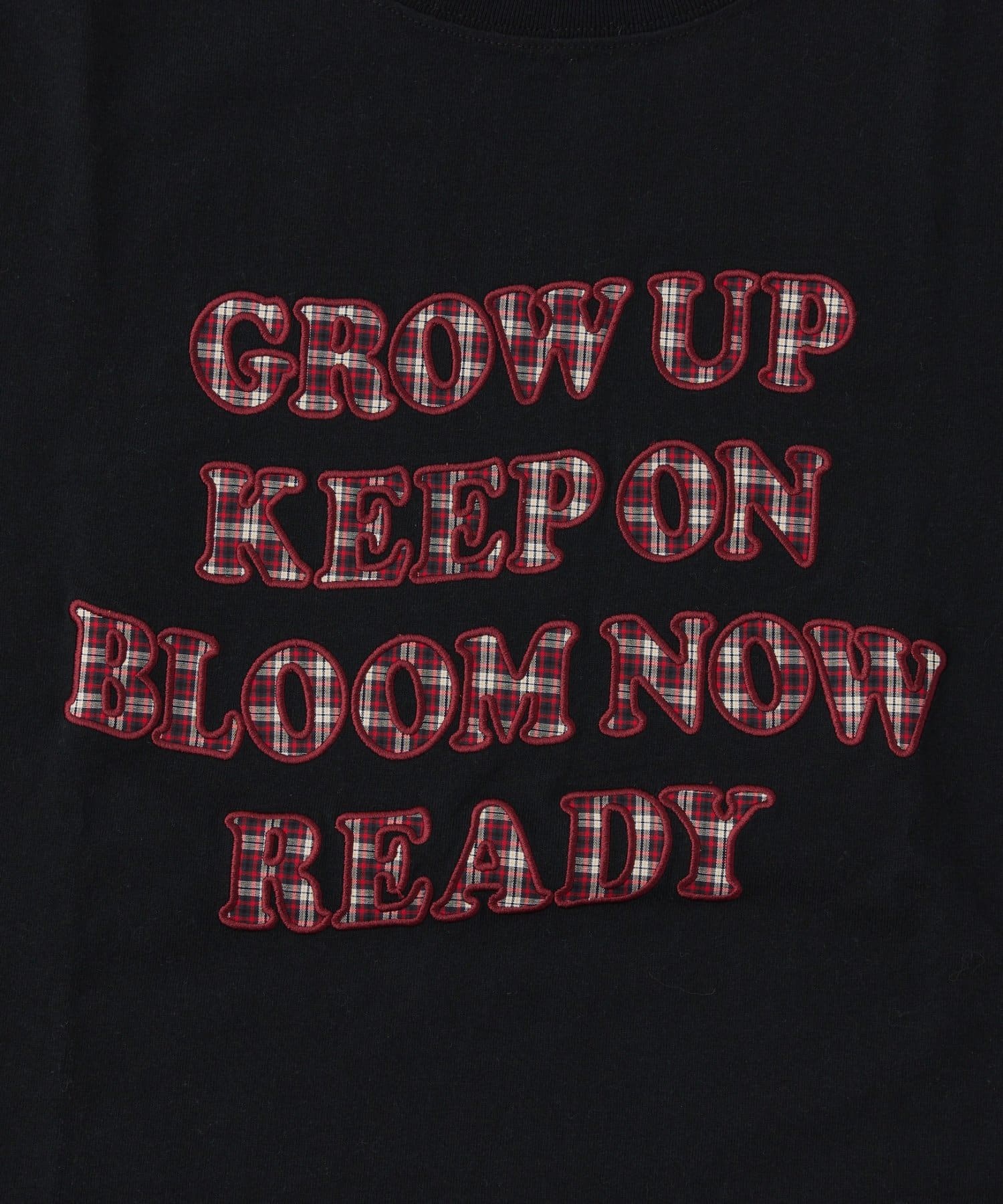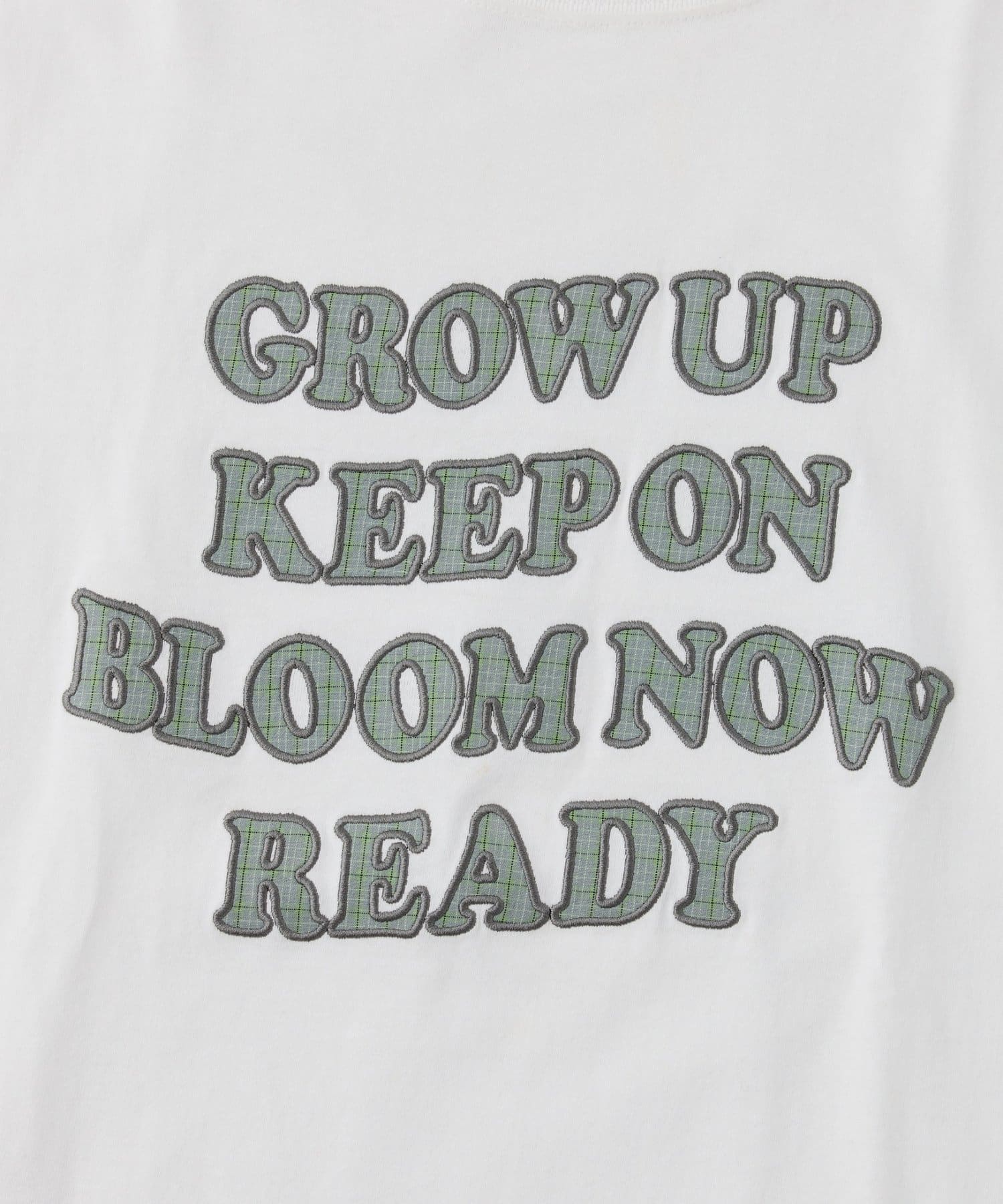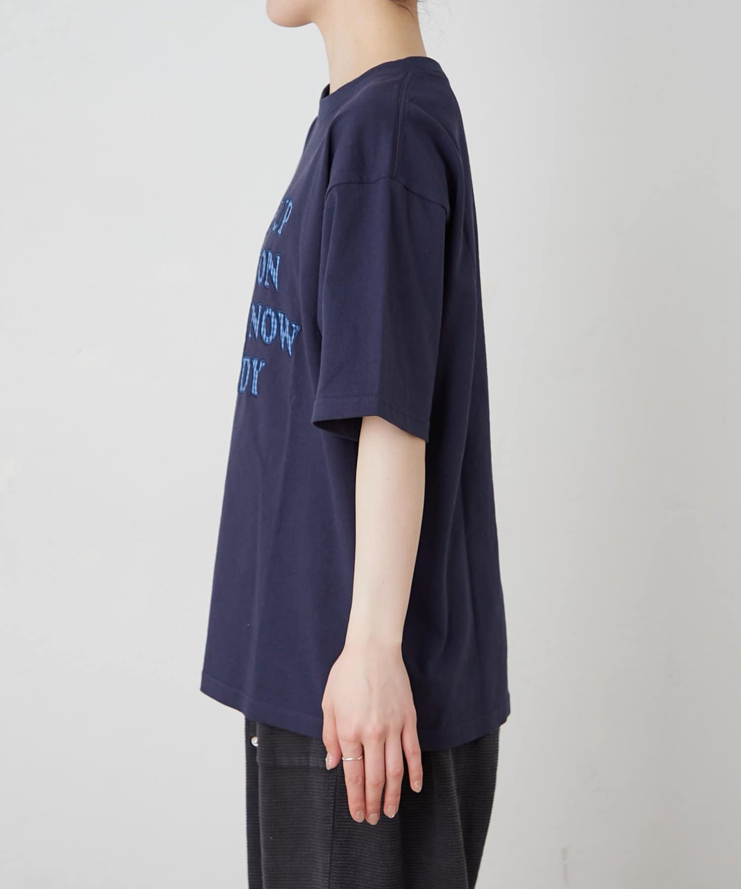 フロントに大きくアップリケされた英字メッセージが目を引くTシャツ。