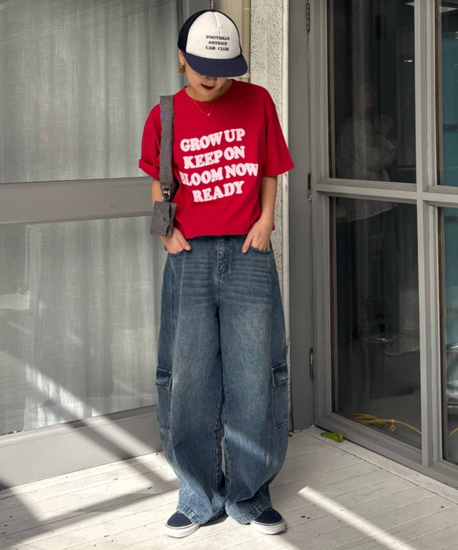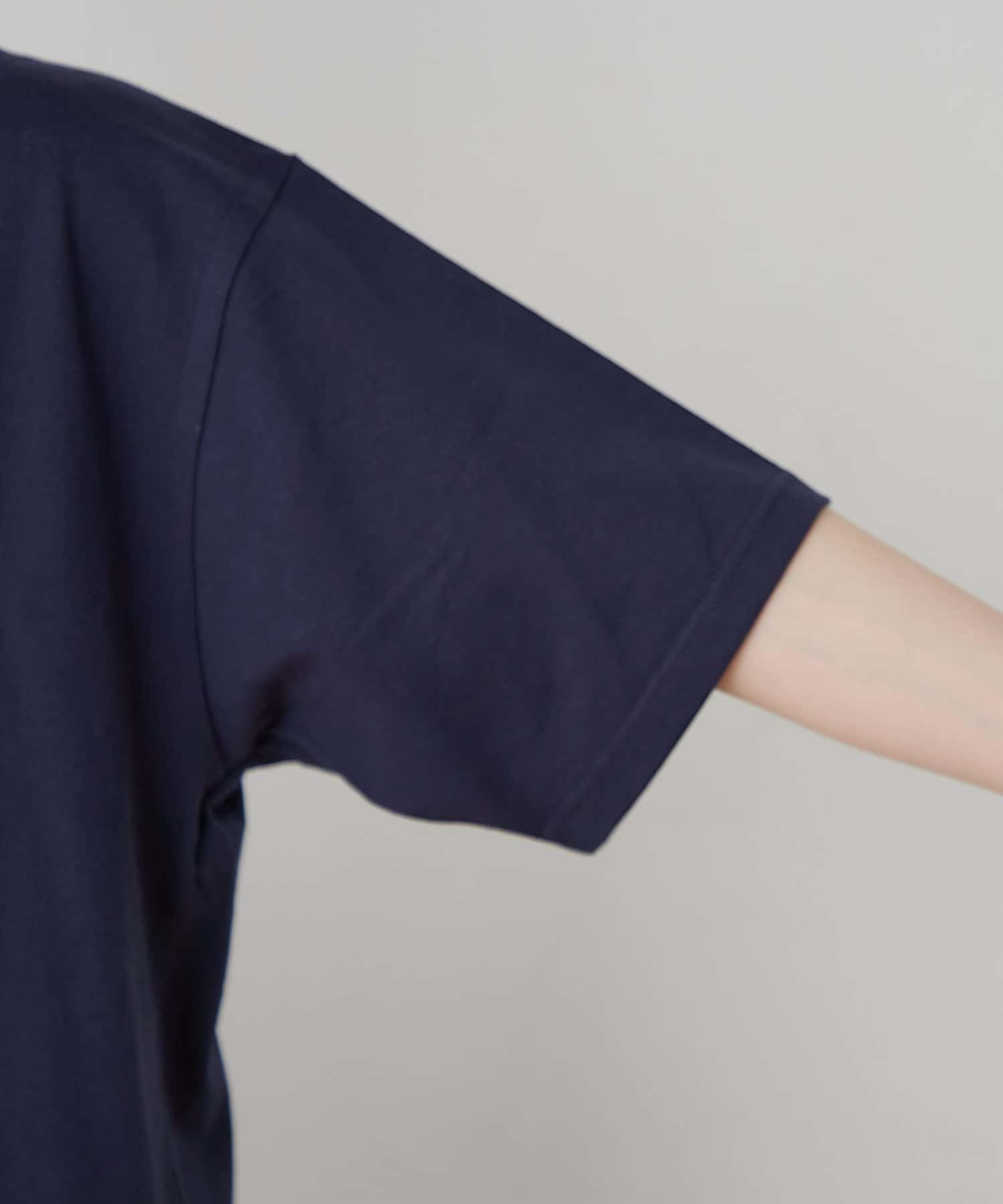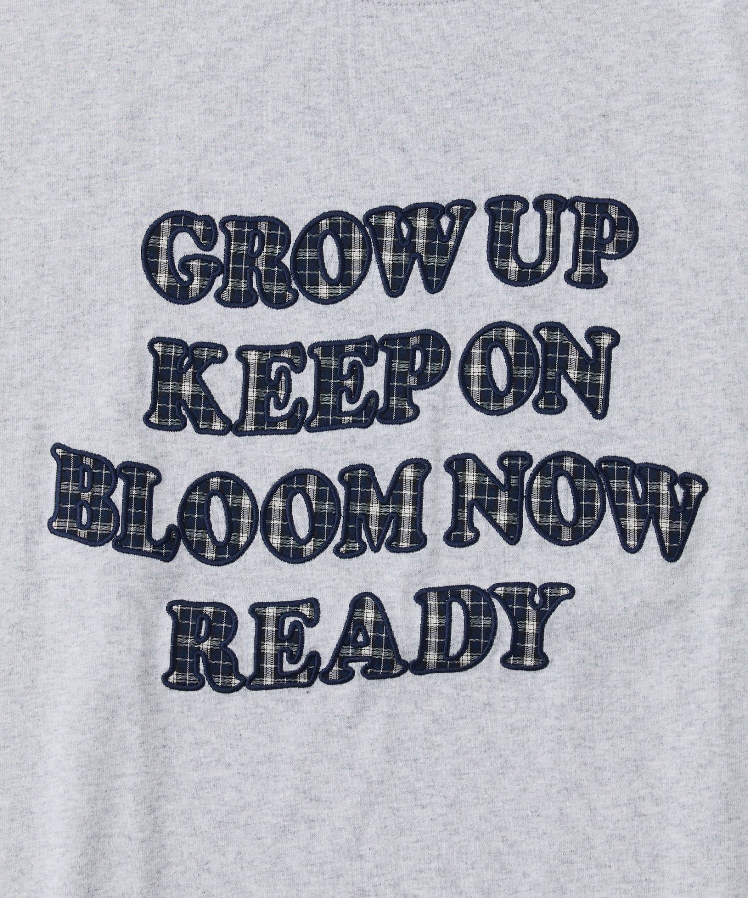 フロントに大きくアップリケされた英字メッセージが目を引くTシャツ。
