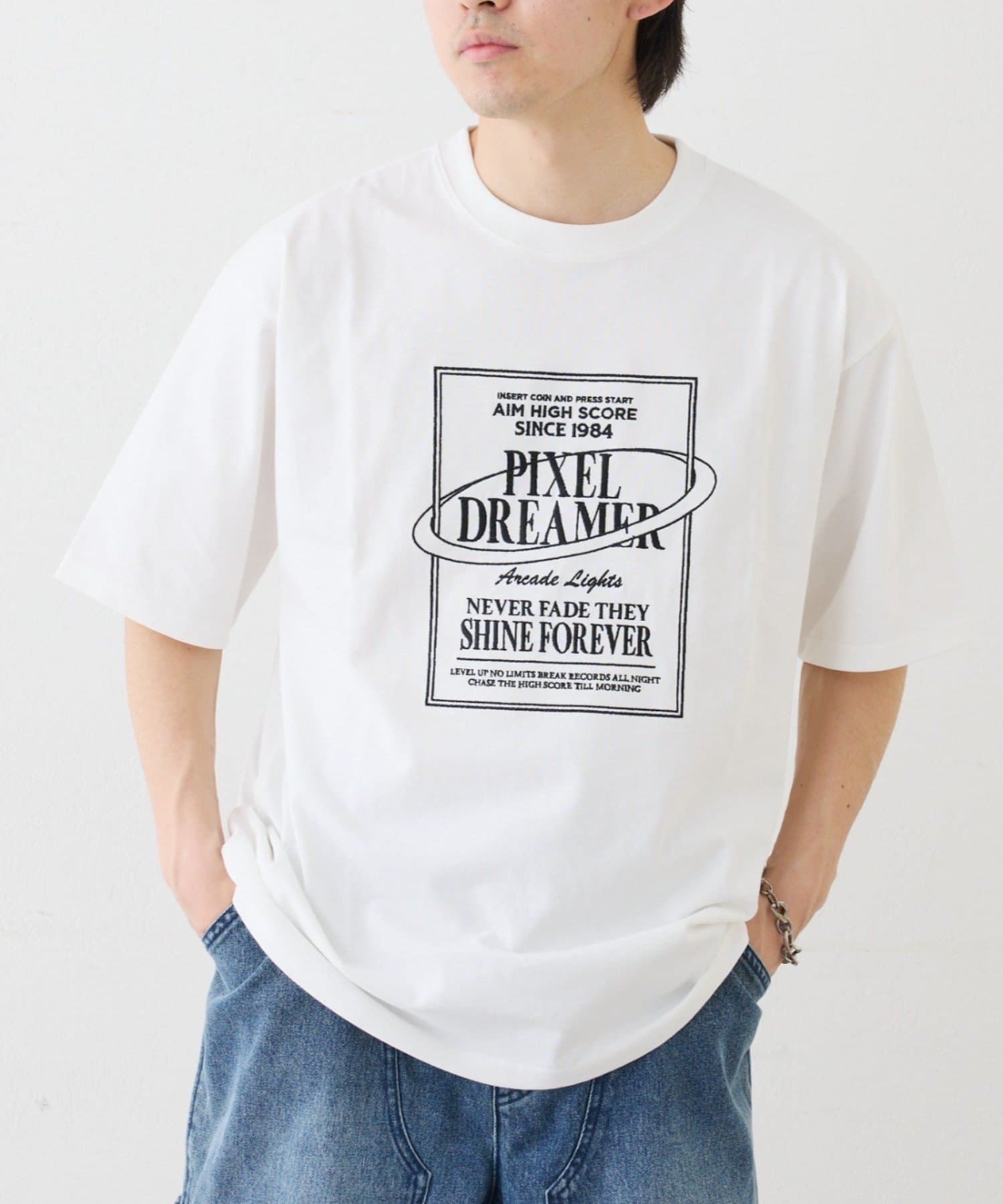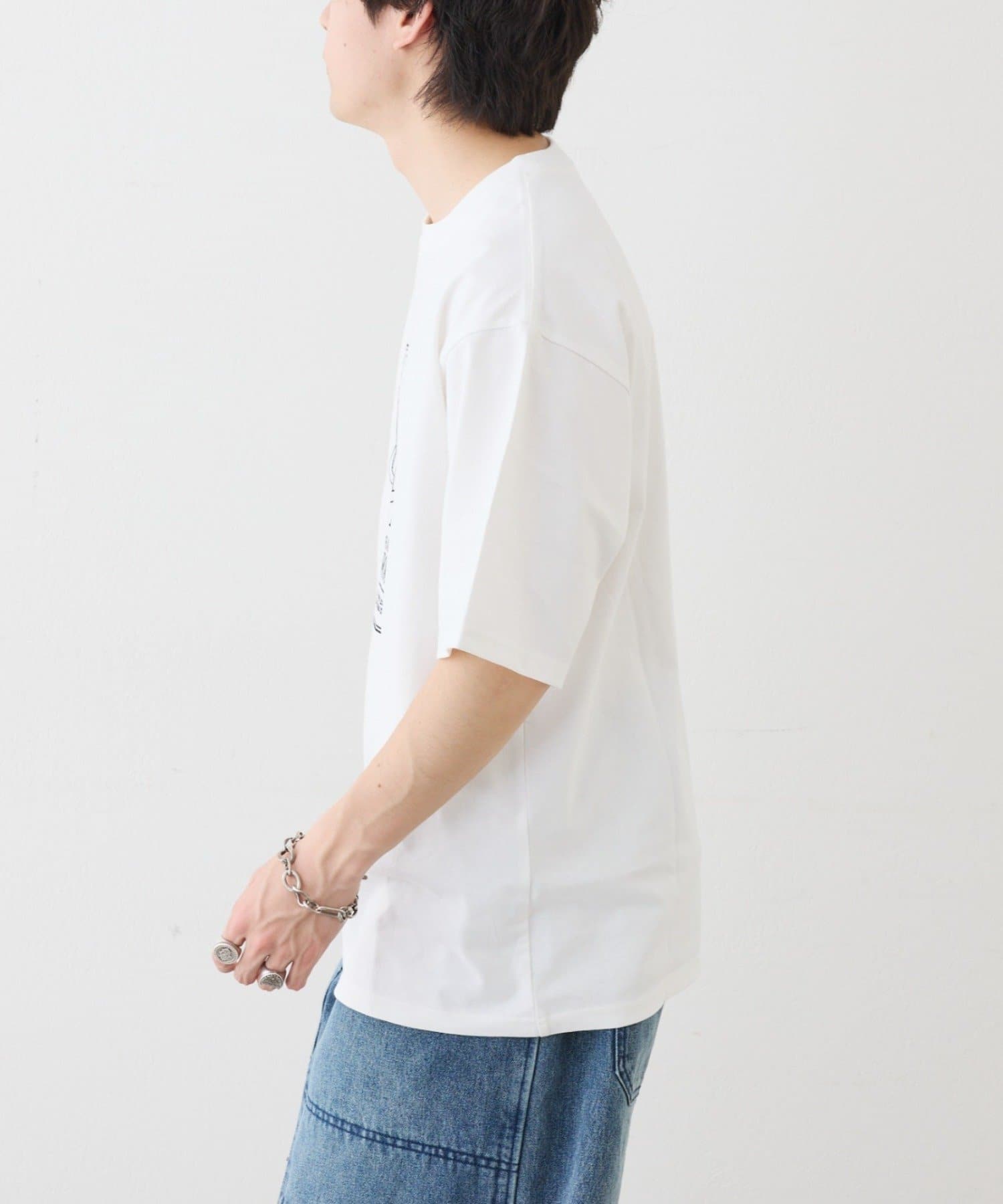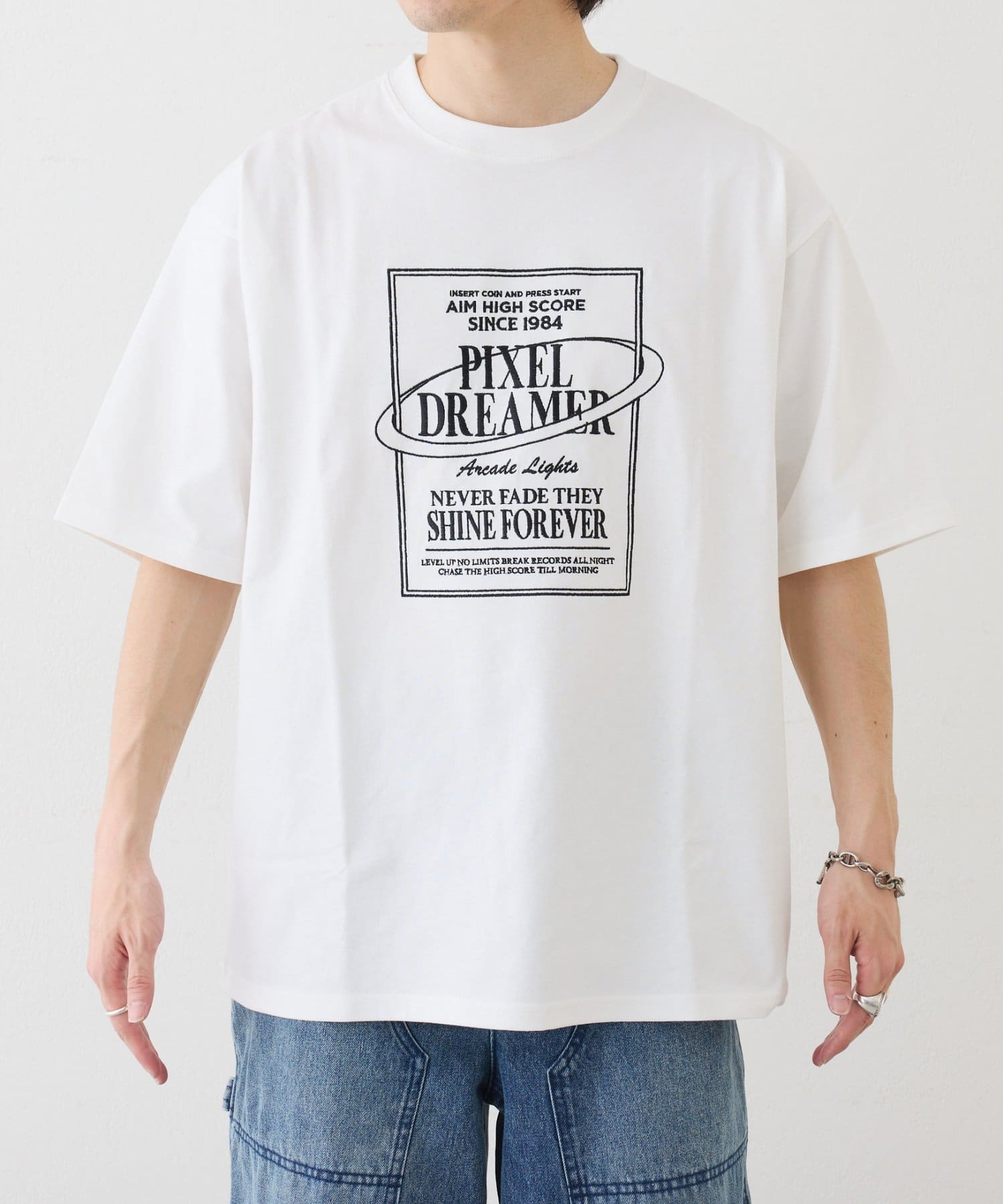 Tシャツのグラフィックが活きるようにアクセサリーは、シンプルなネックレスやピアスをプラスすると、より洗練された印象になります。