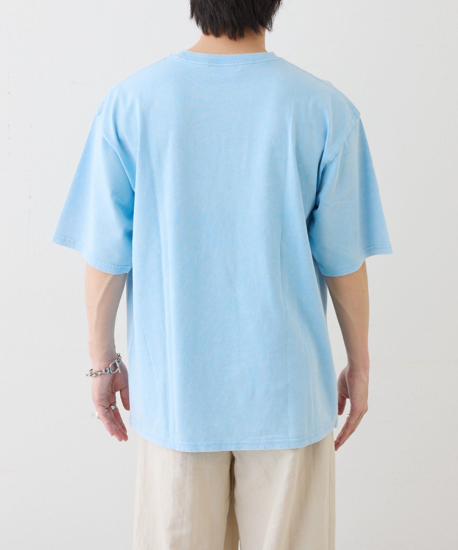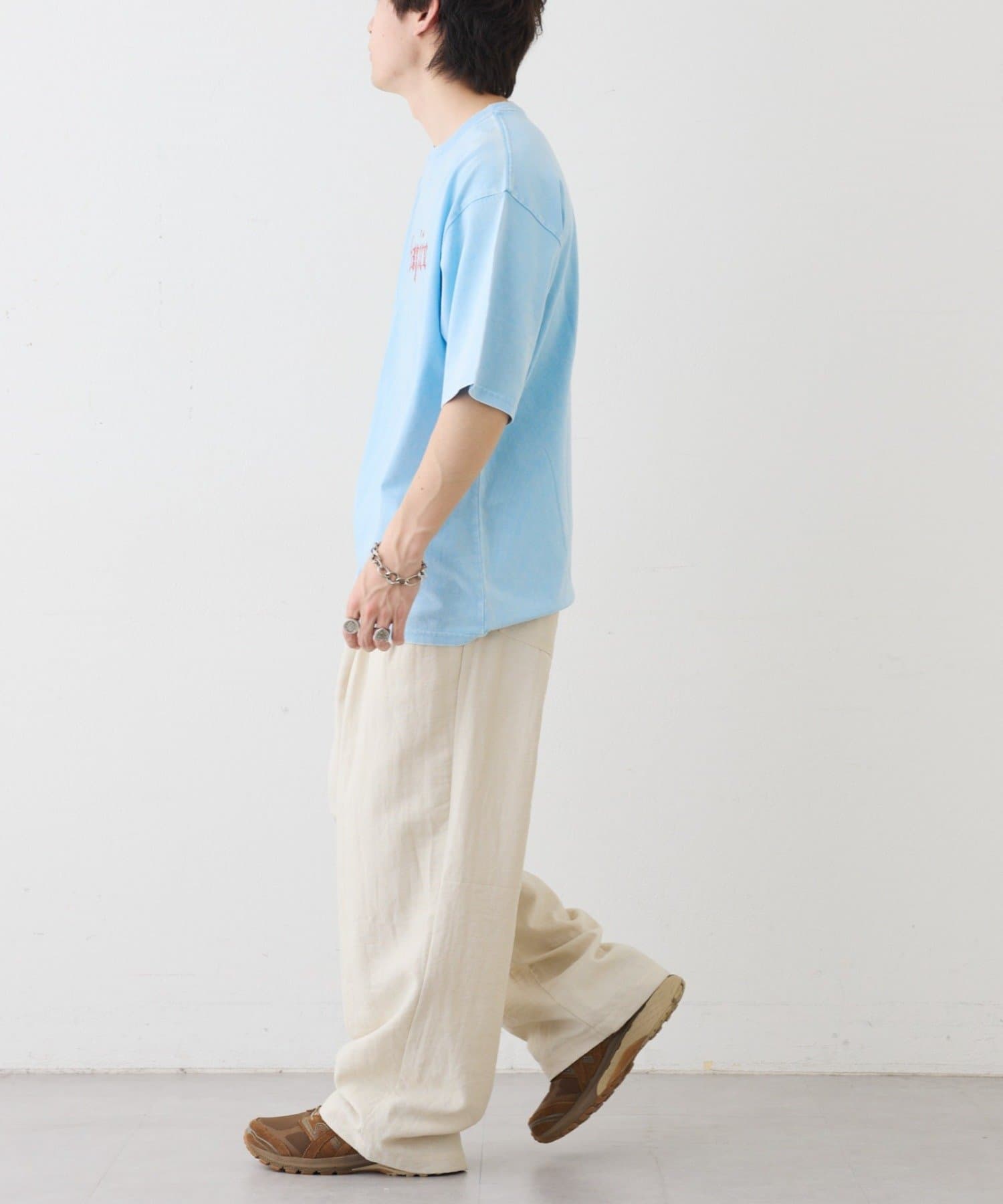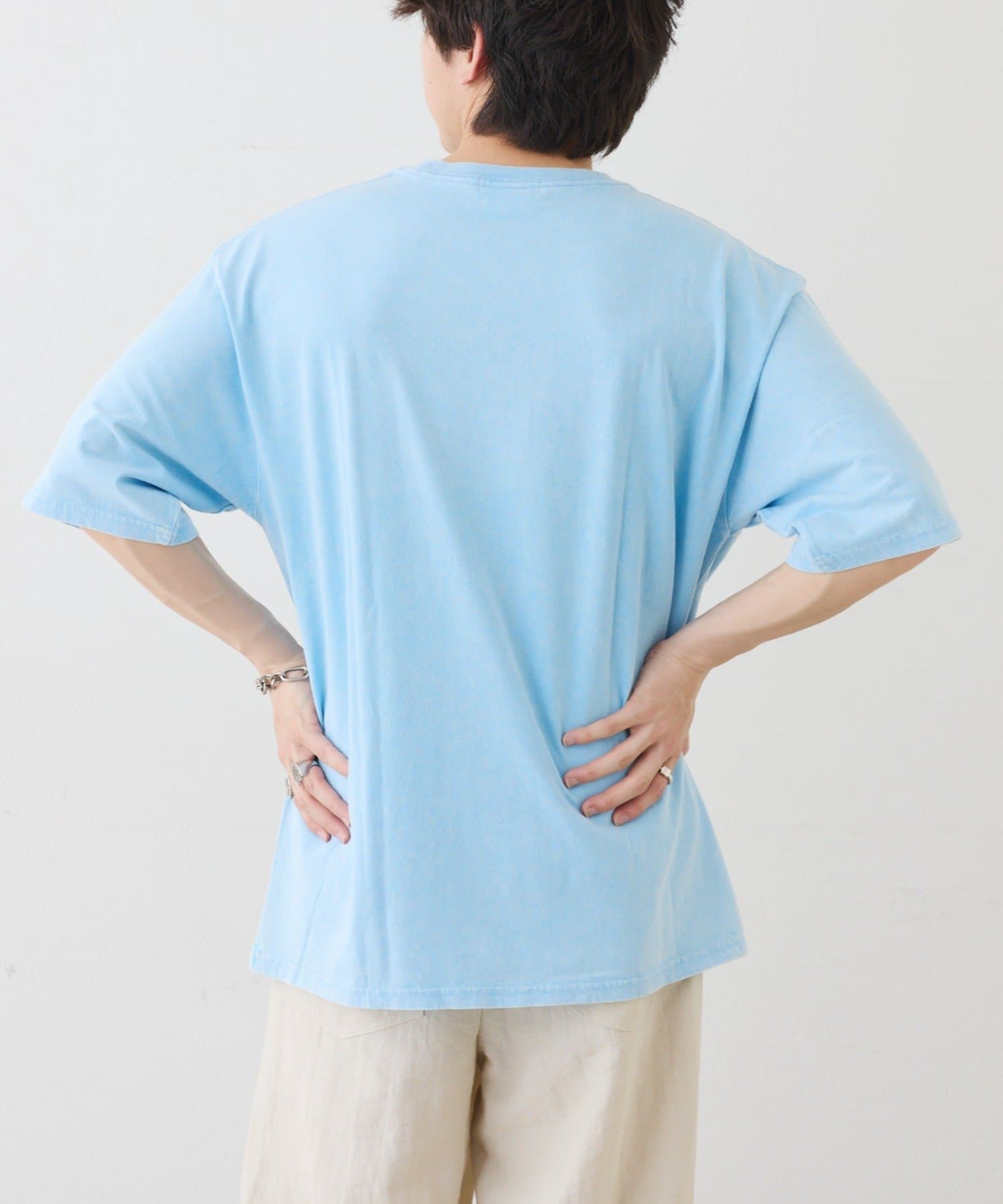 Tシャツのグラフィックが活きるようにアクセサリーは、シンプルなネックレスやピアスをプラスすると、より洗練された印象になります。