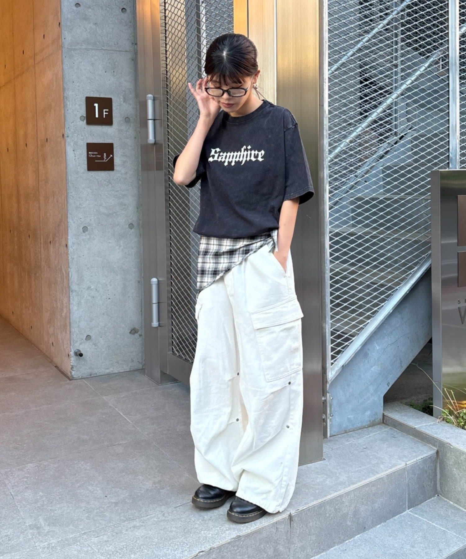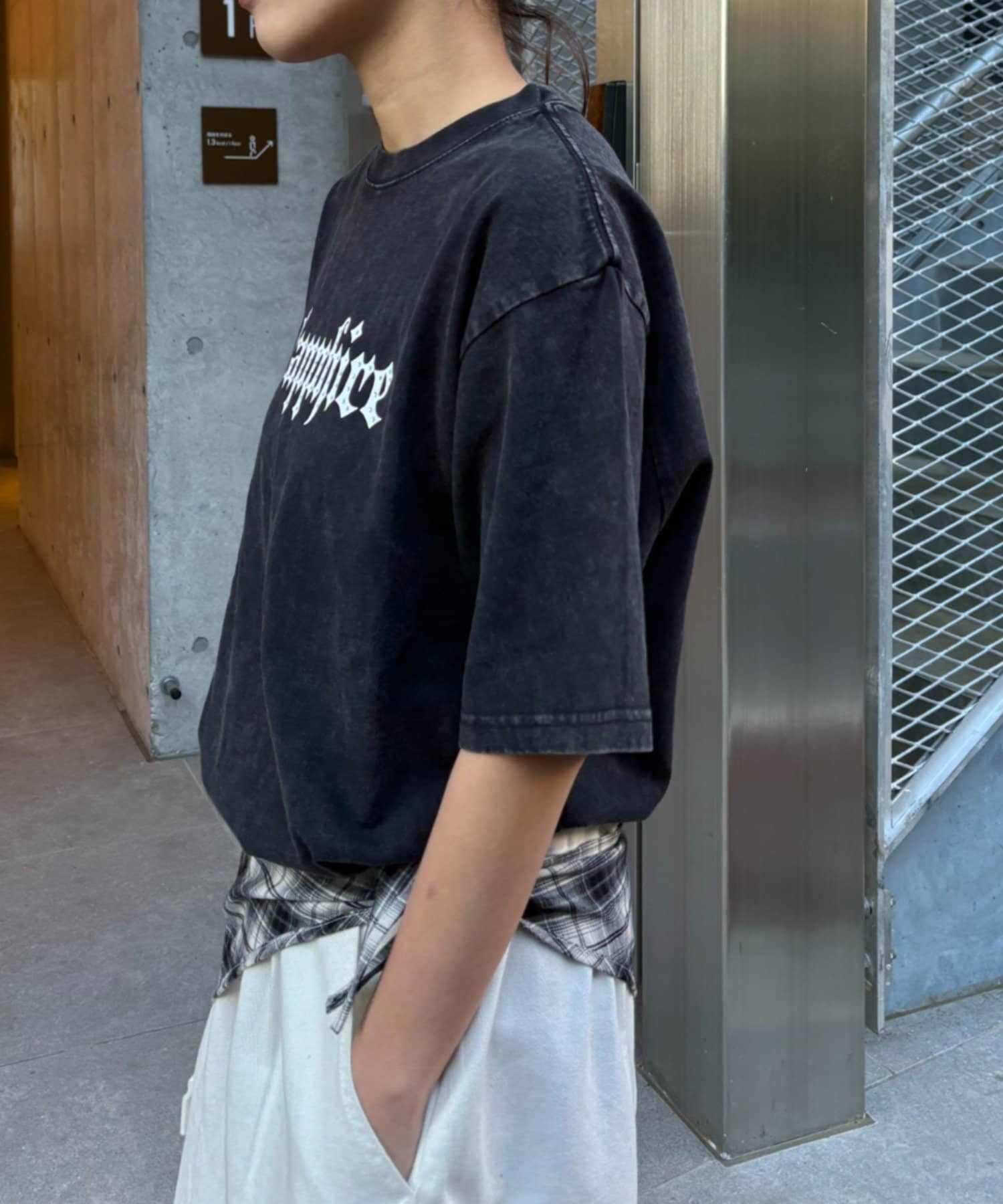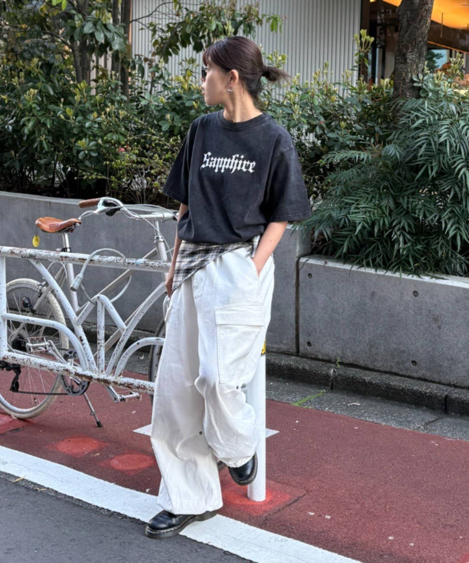 Tシャツのグラフィックが活きるようにアクセサリーは、シンプルなネックレスやピアスをプラスすると、より洗練された印象になります。