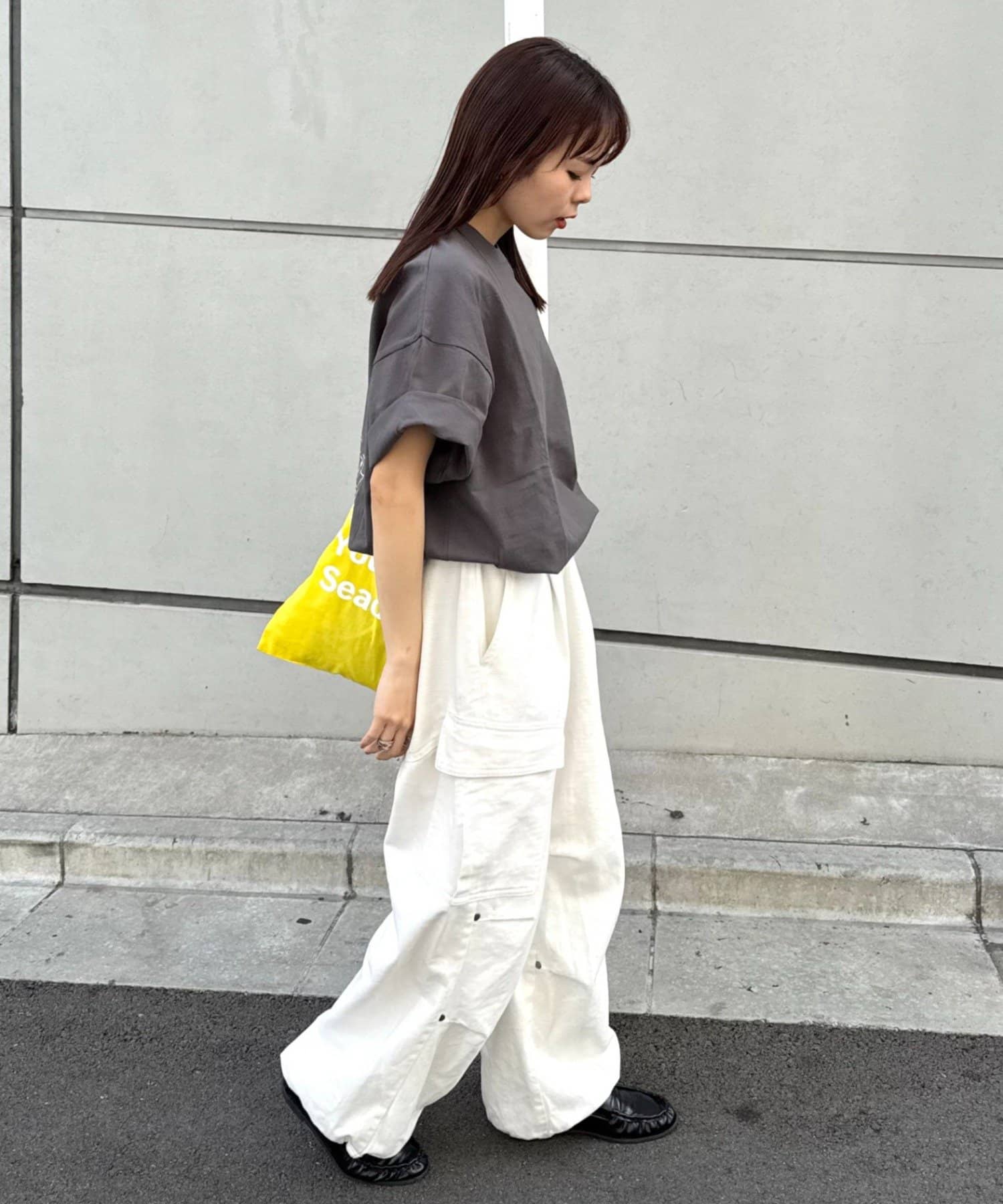 スラックスやワイドパンツと合わせて、きれいめコーデの外しとしても◎