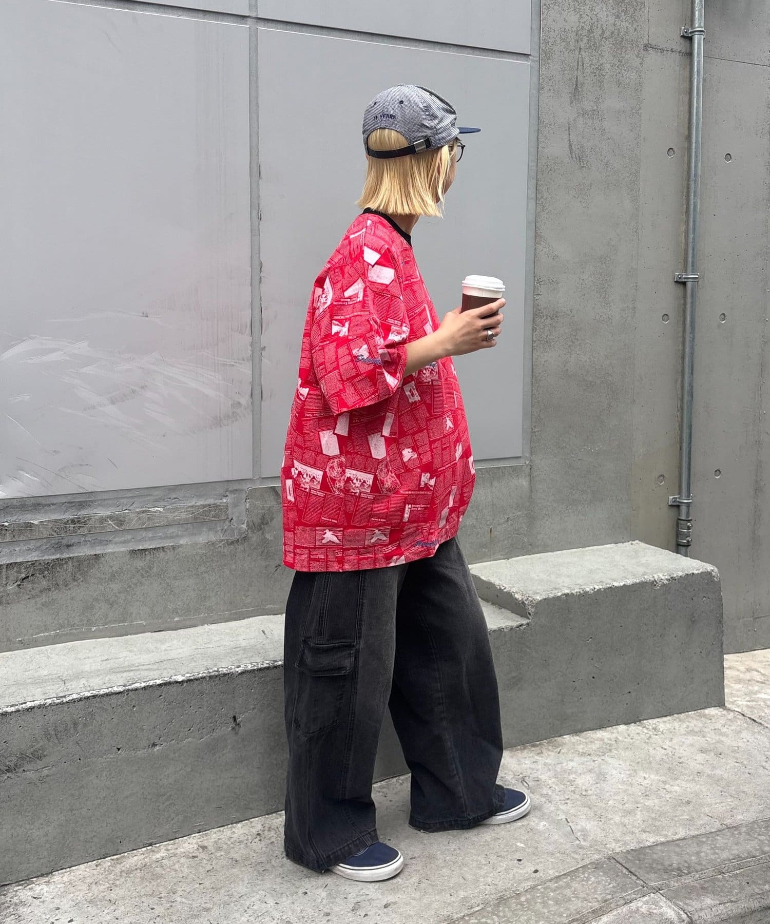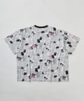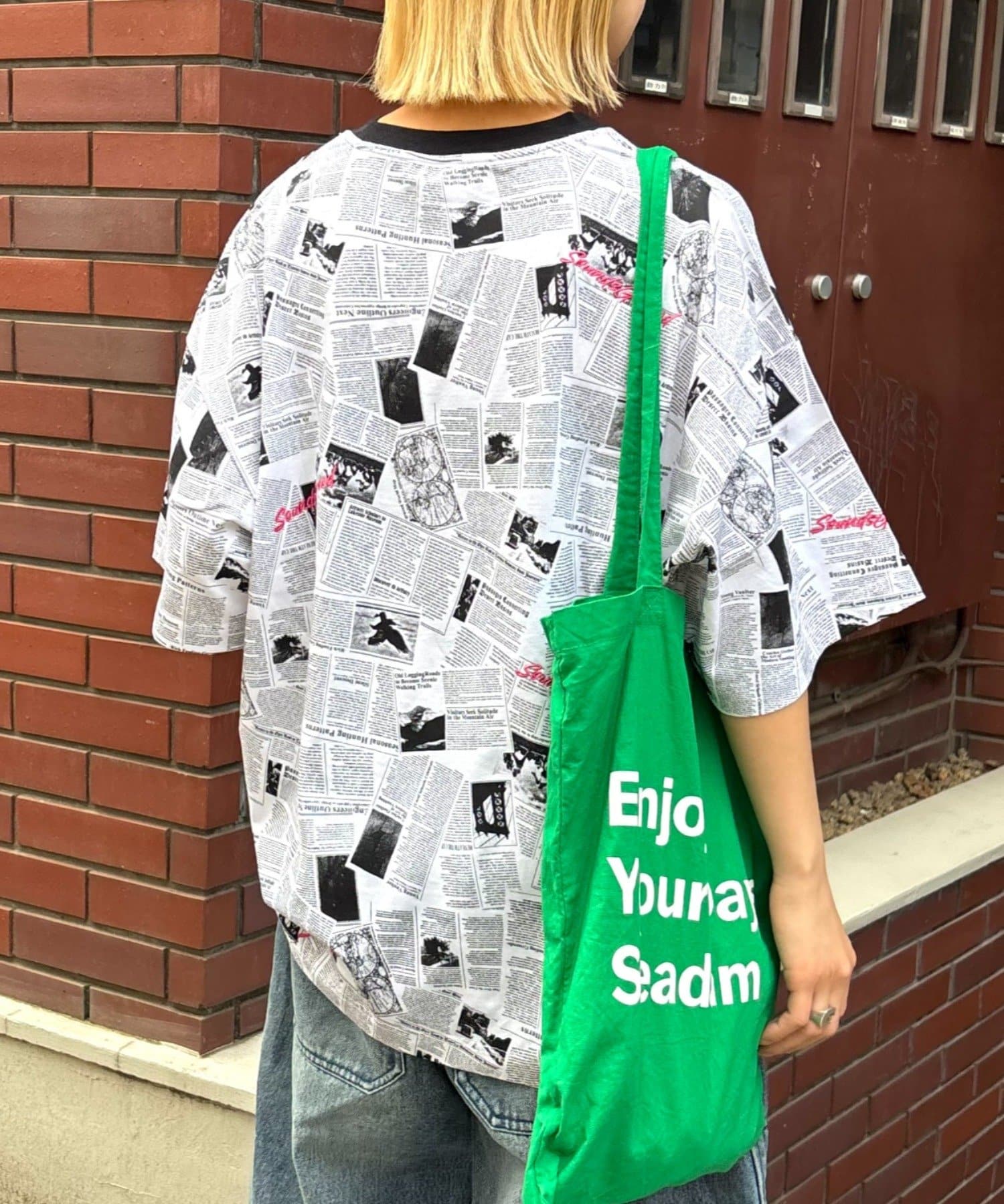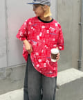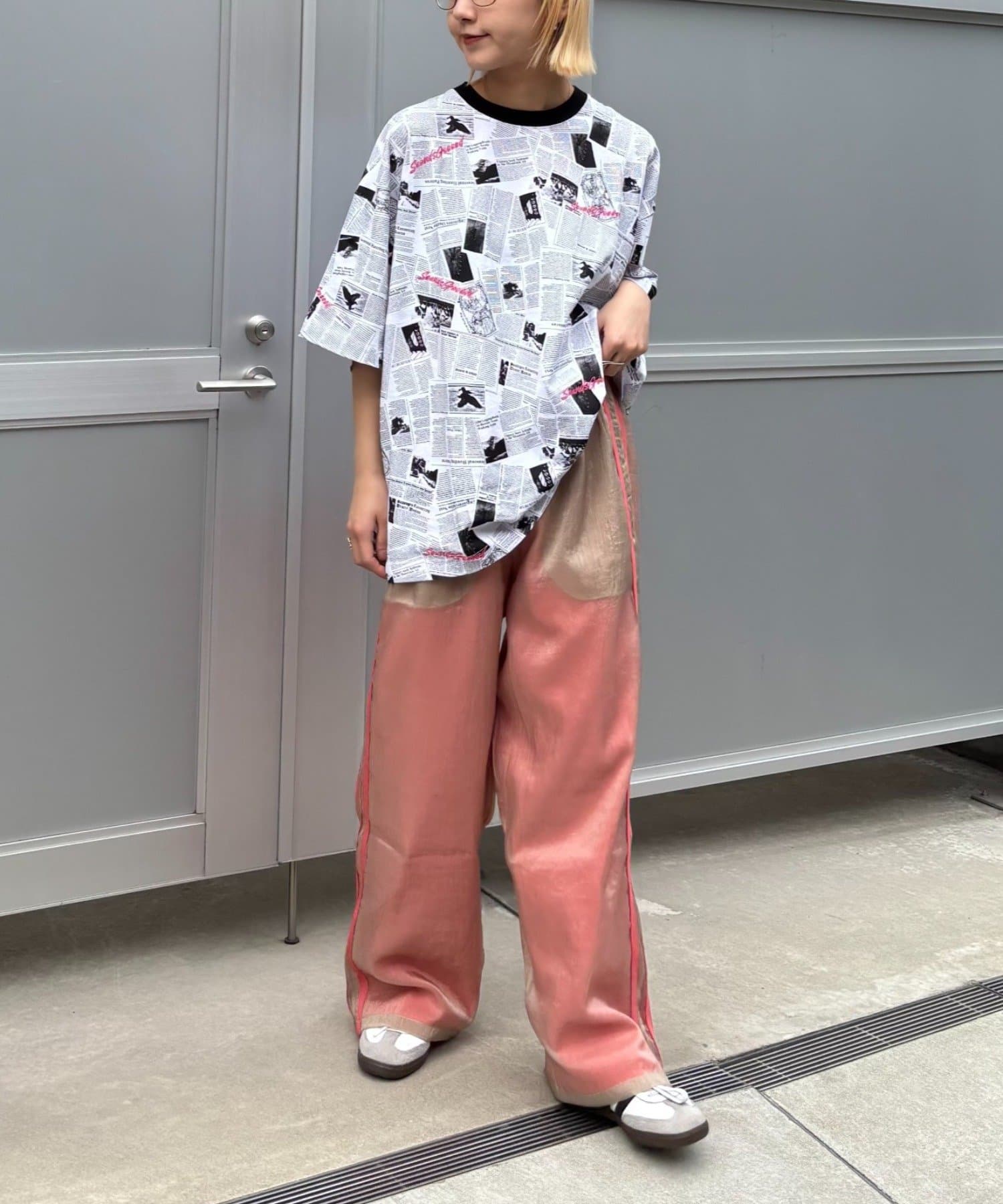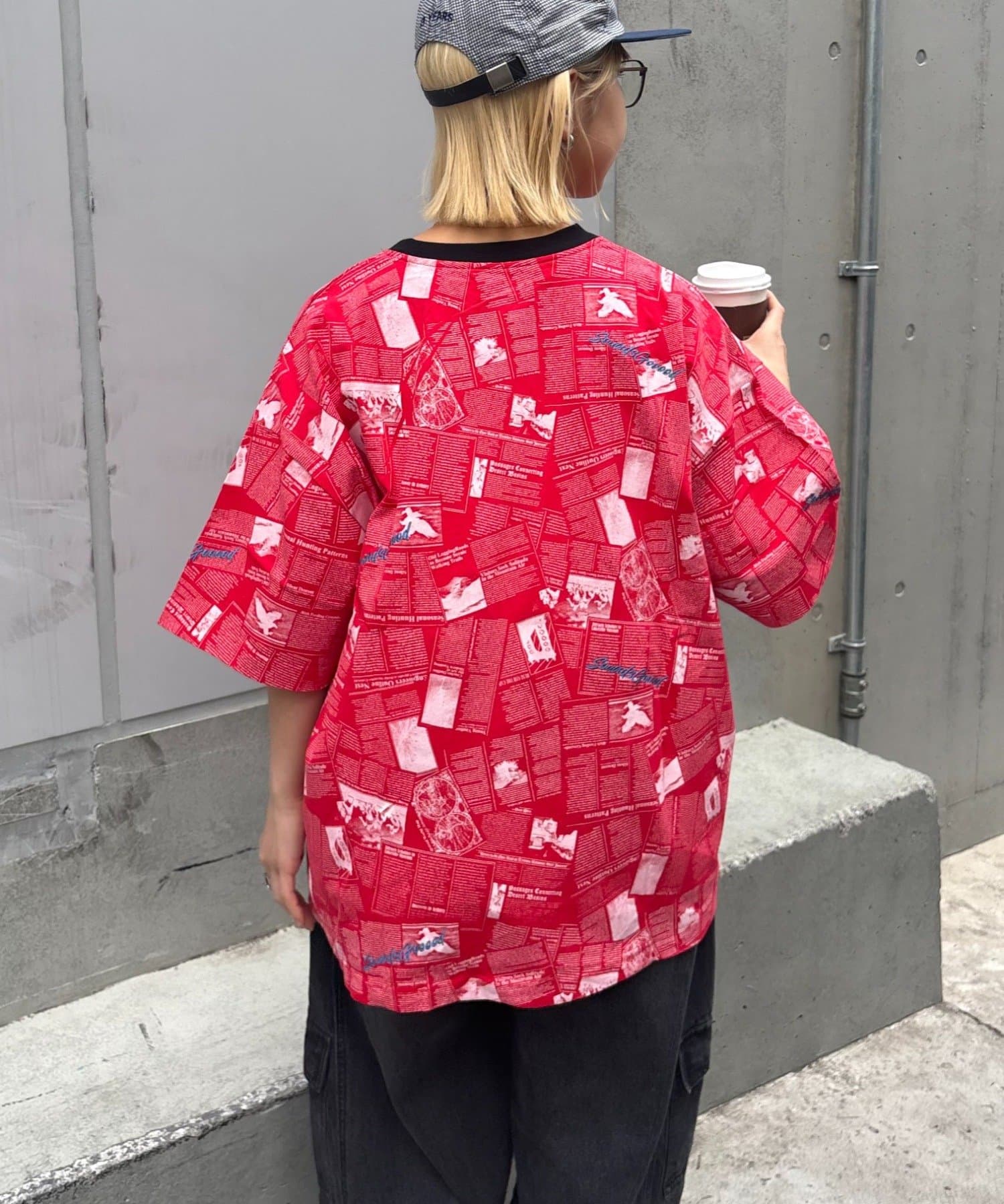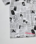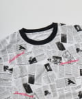 目を引くニュースペーパー柄のオーバーサイズTシャツです。