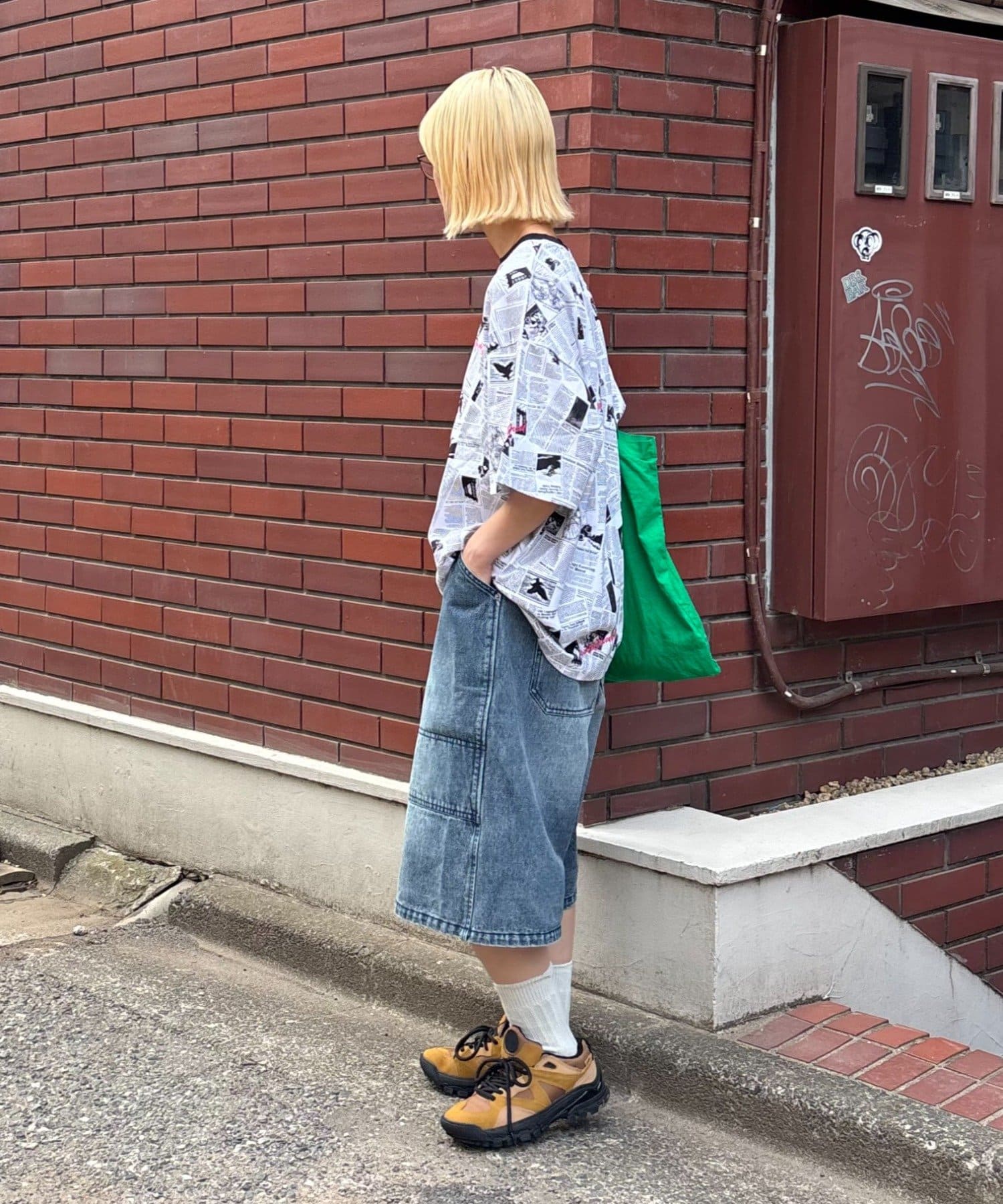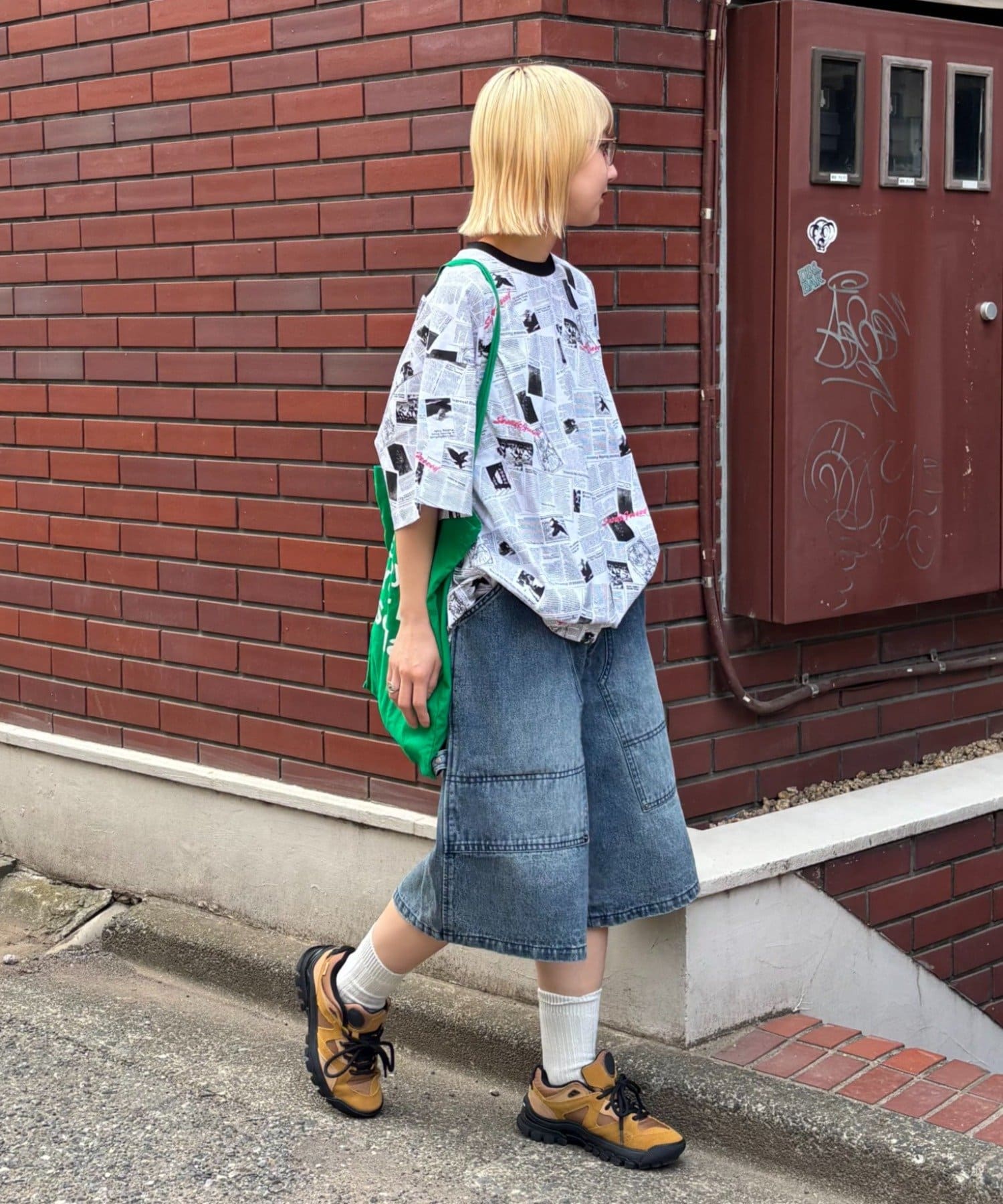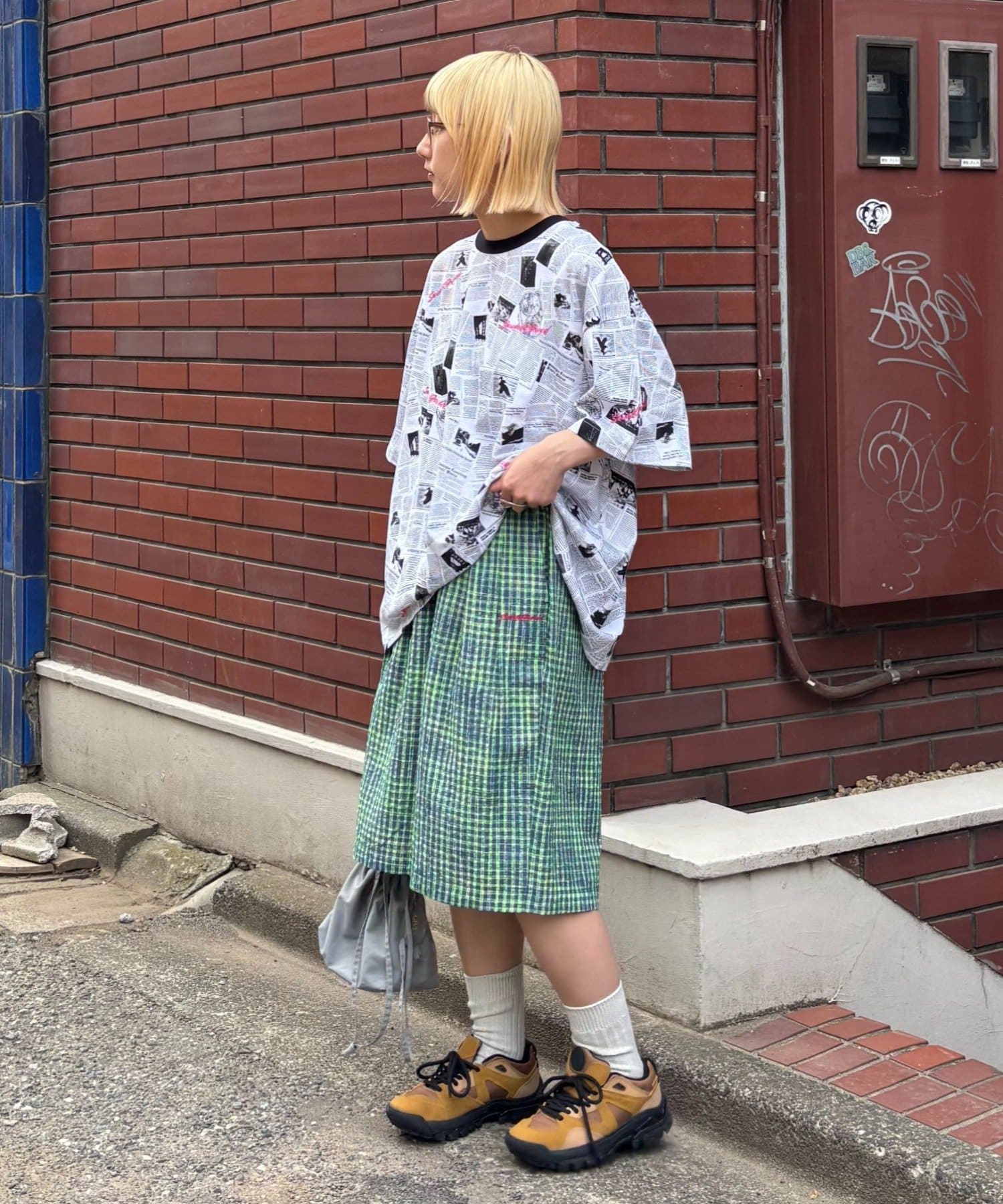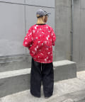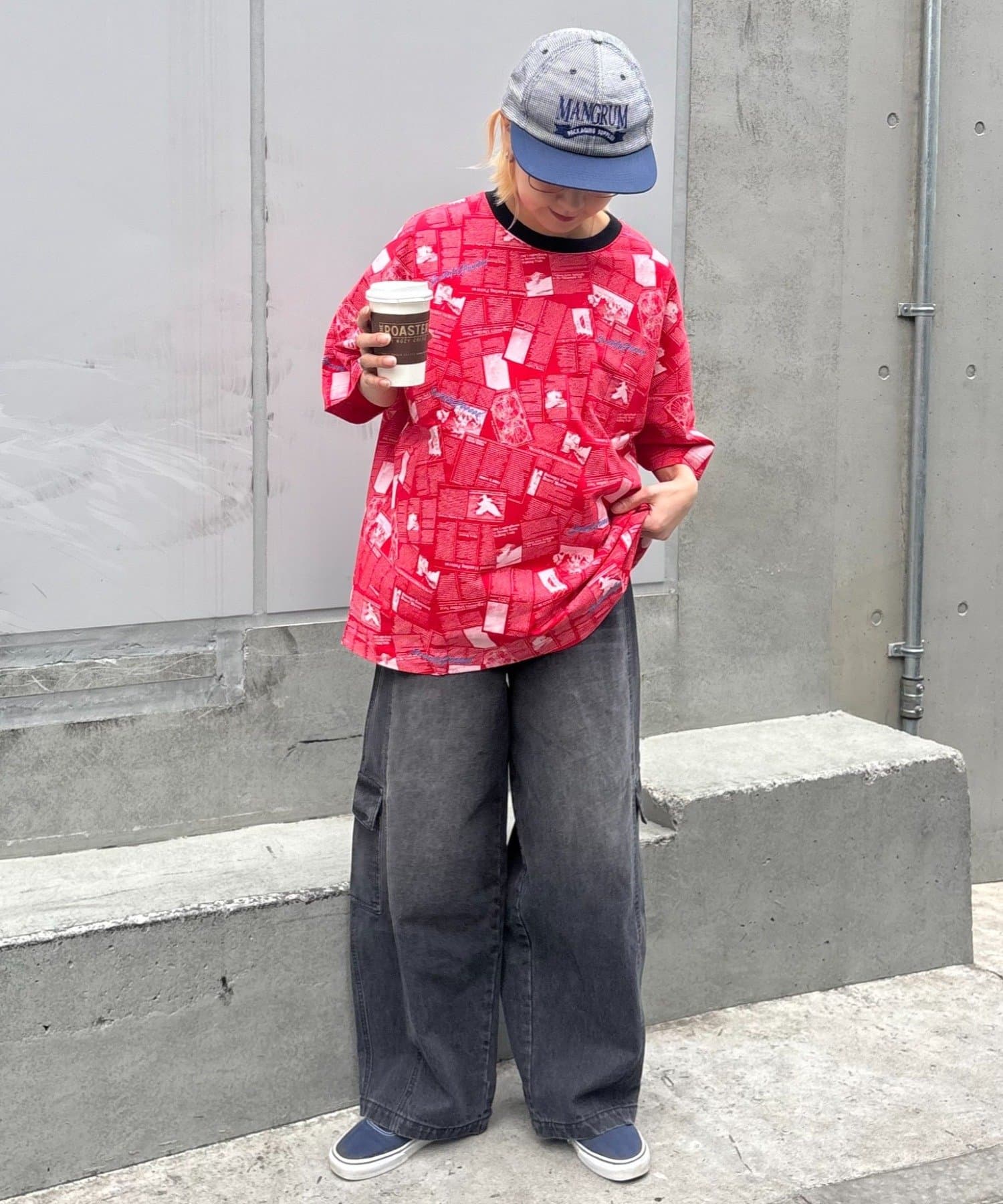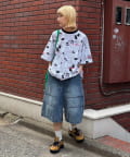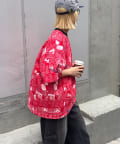 目を引くニュースペーパー柄のオーバーサイズTシャツです。
