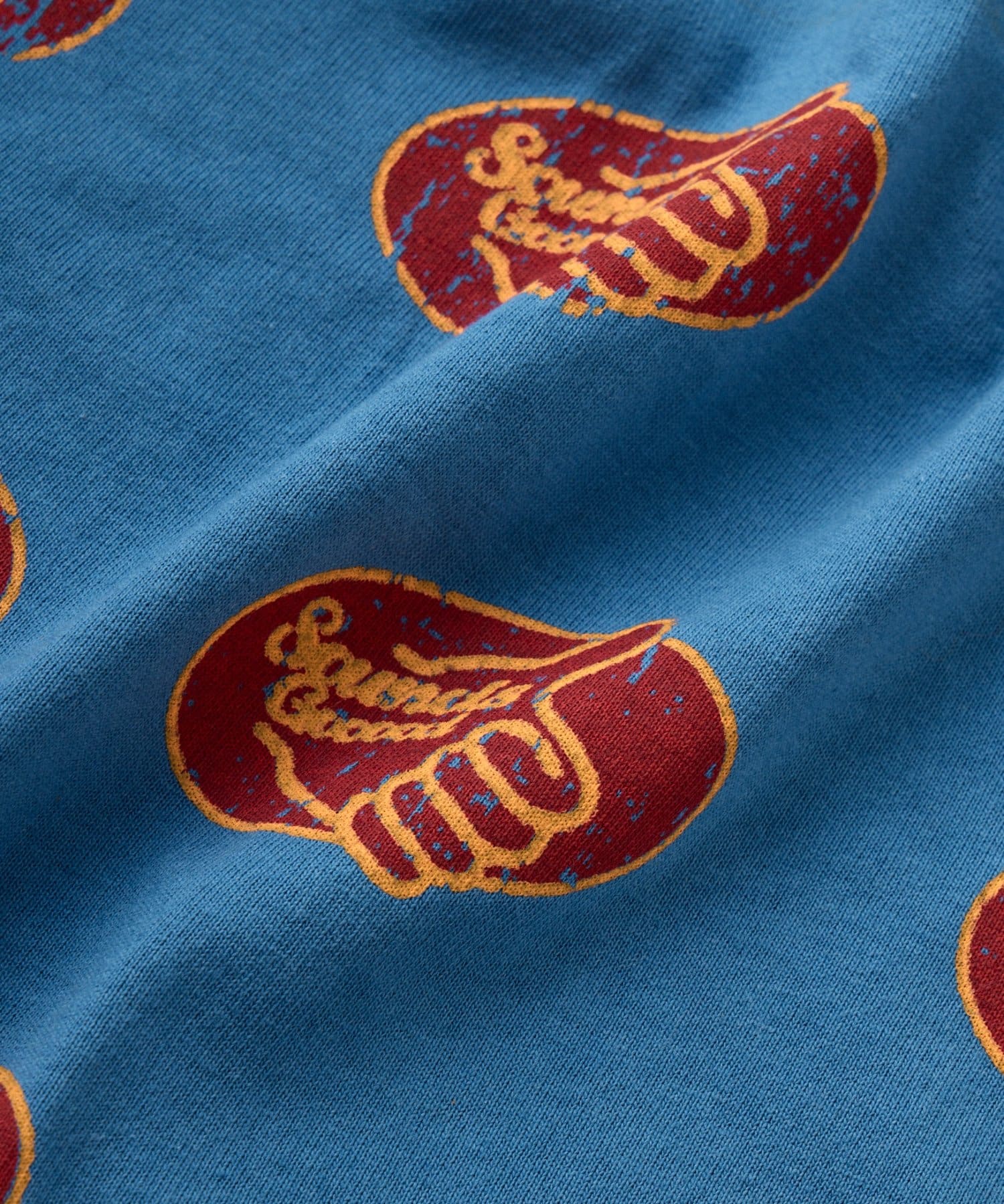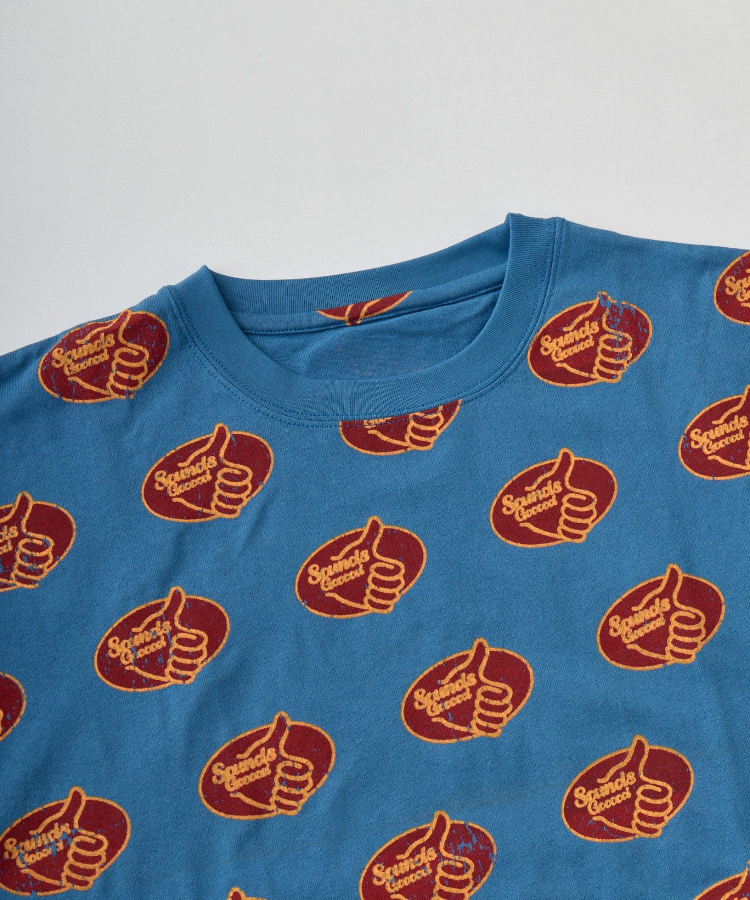 爽やかなブルーの生地に、レトロな雰囲気の「Sounds Good」ロゴと親指を立てたマークがプリントされています。