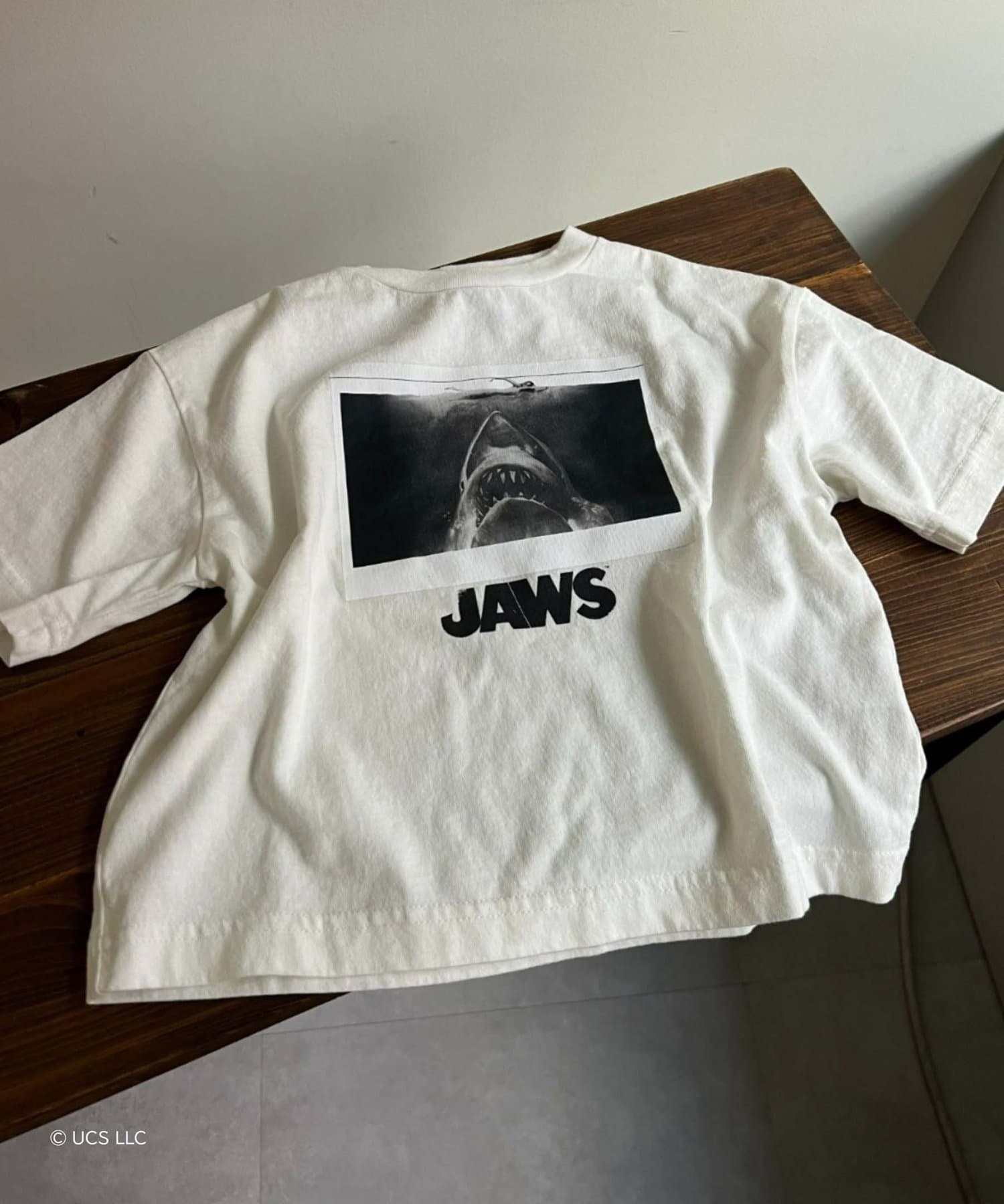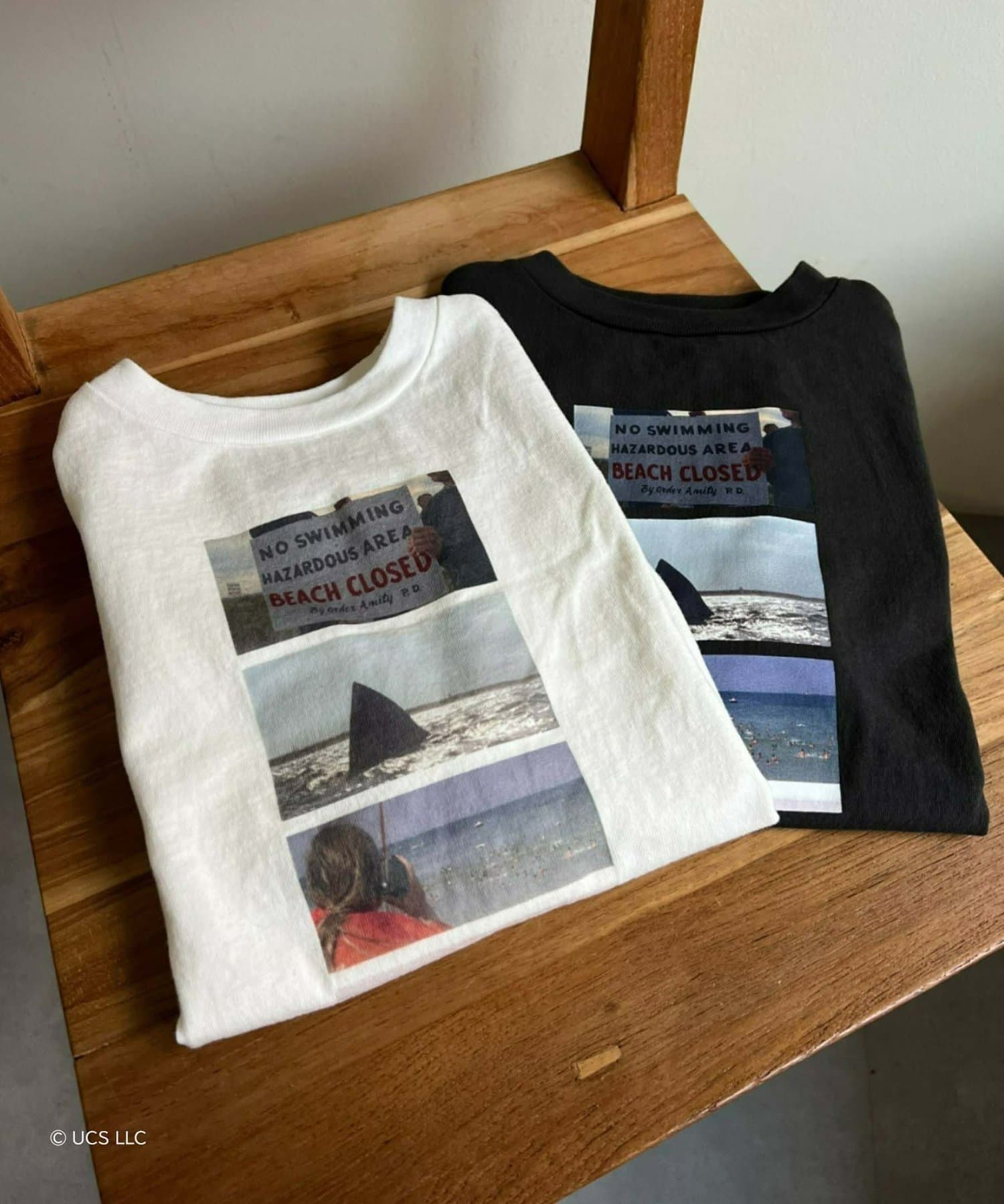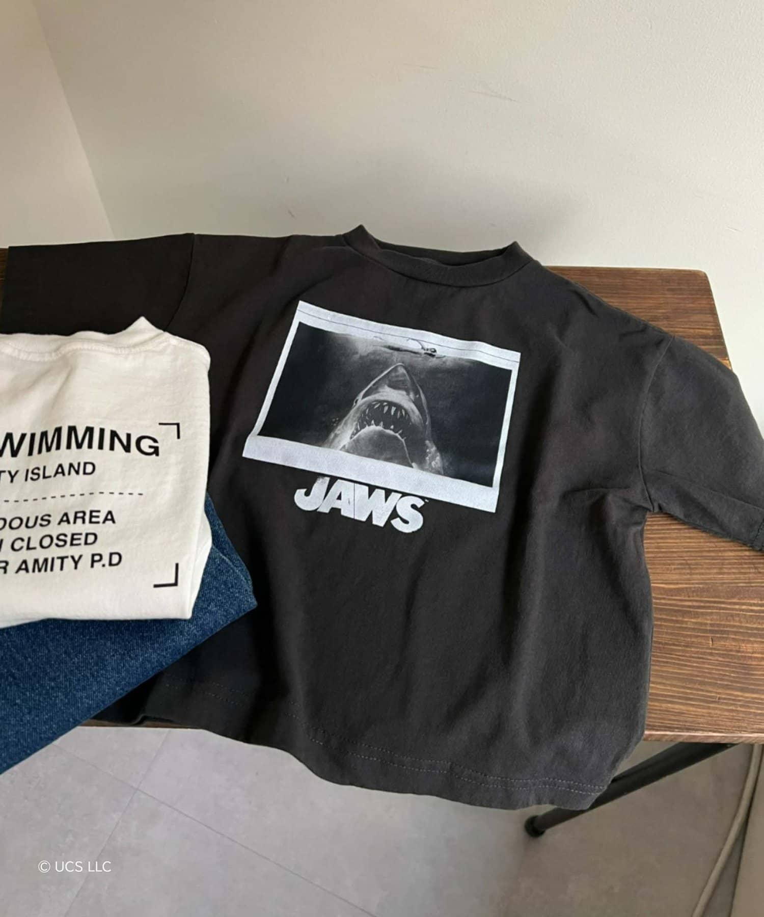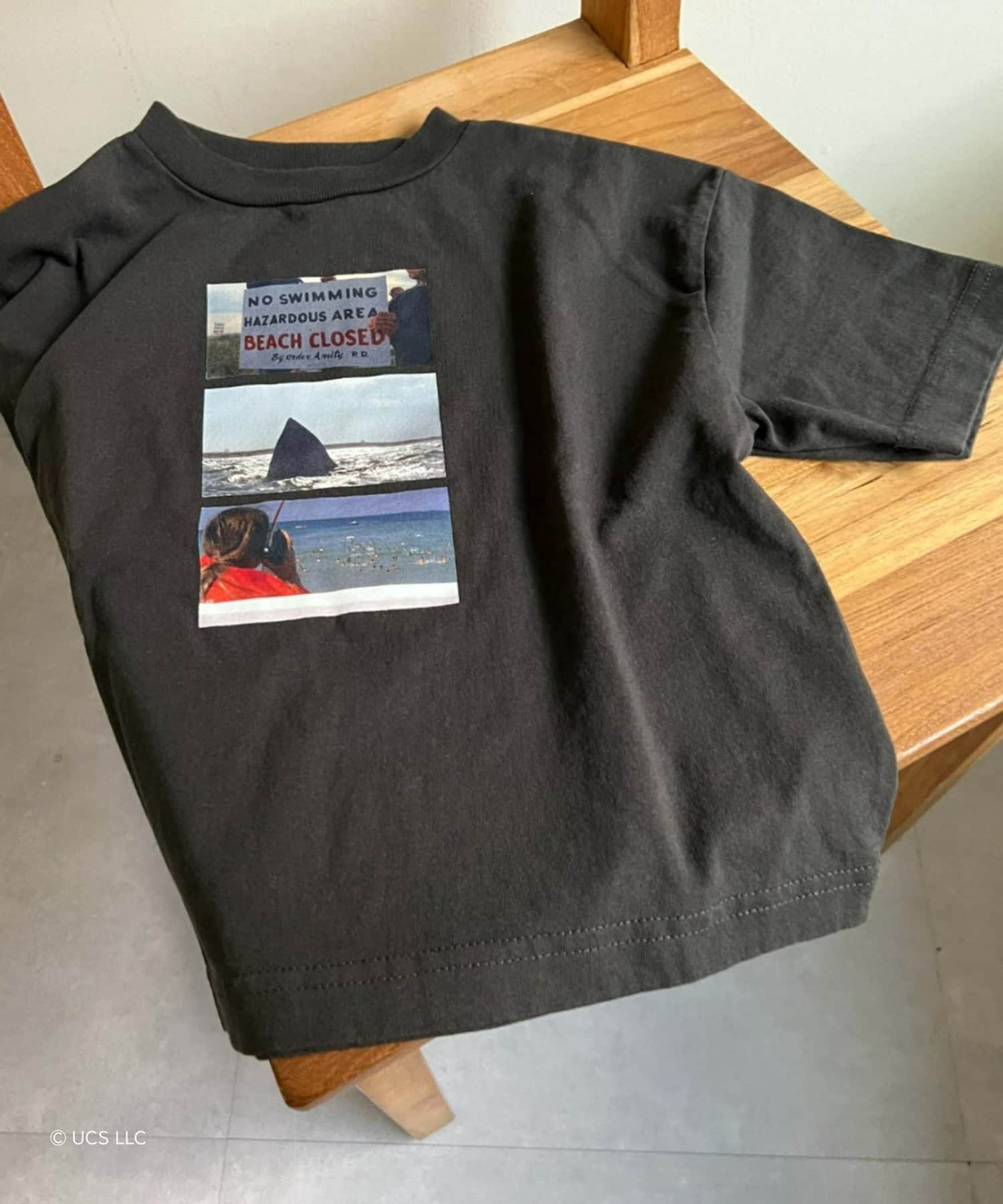 2歳前の息子用に以前店頭で白のETデザインのTシャツを購入しオーバーサイズで着せているのですが、あまりにかわいいので、オンラインで黒のJAWSデザインのTシャツを追加購入しました。