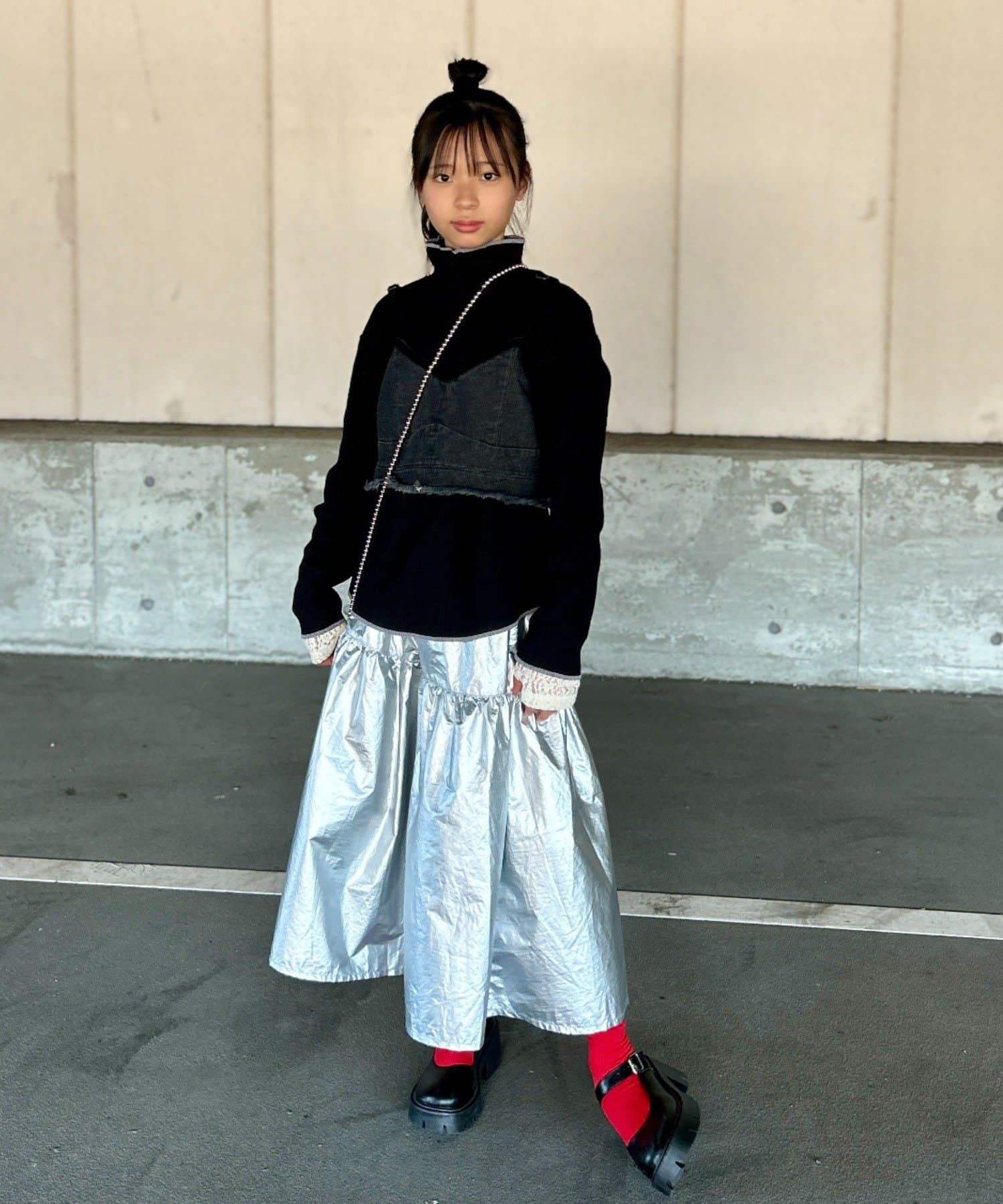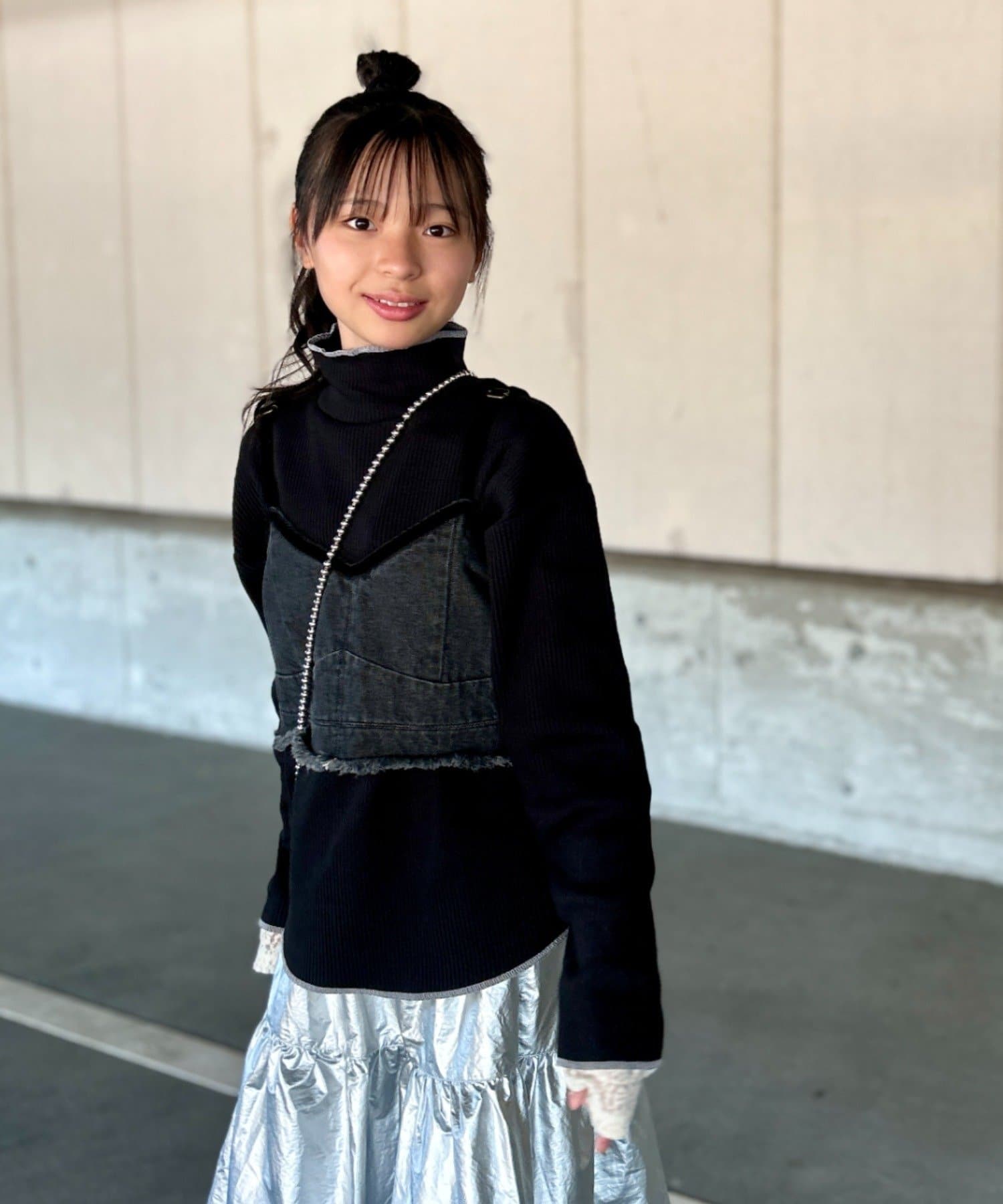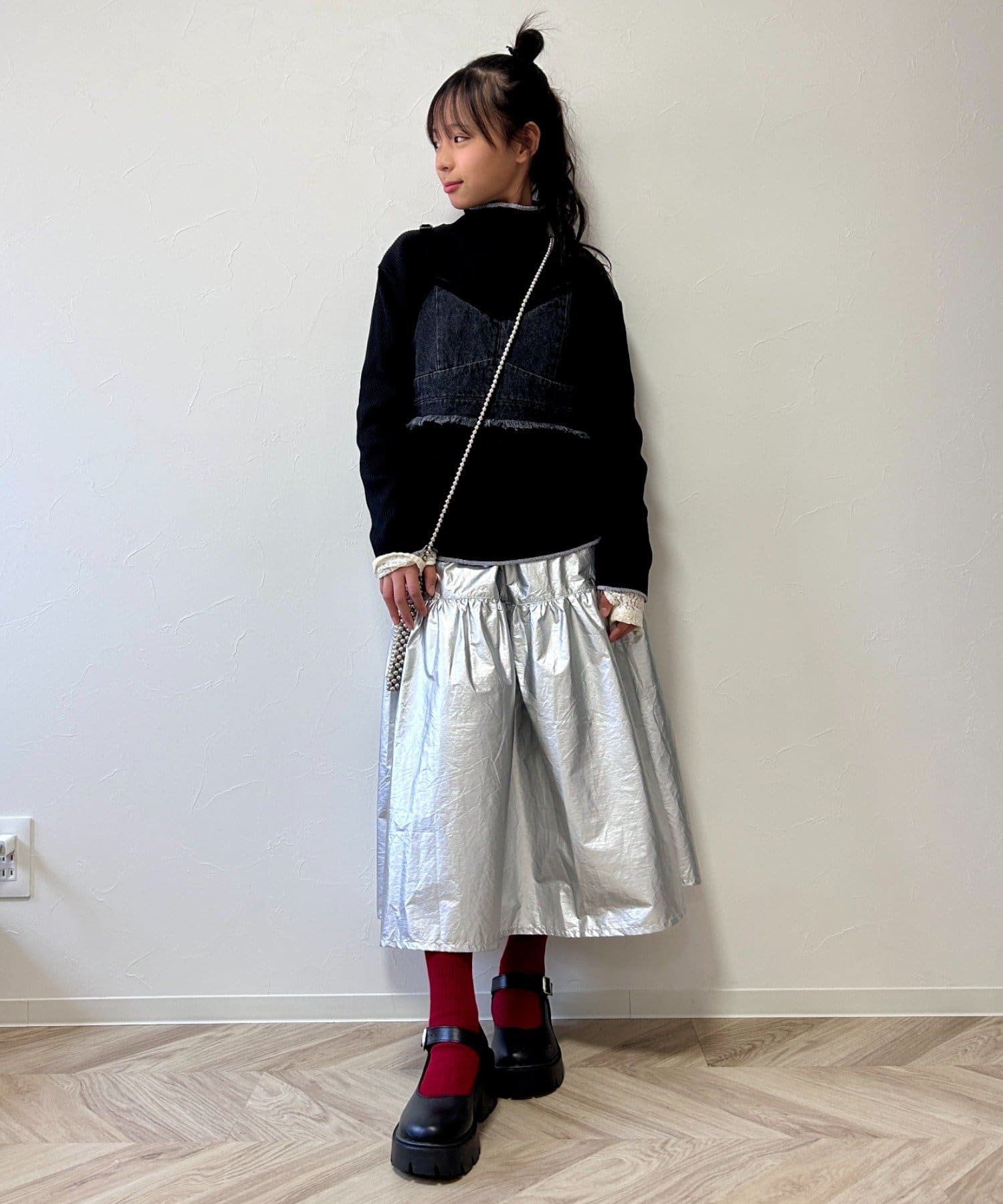 パールビスチェやベストなどと合わせると、トレンド感がアップした着こなしに!