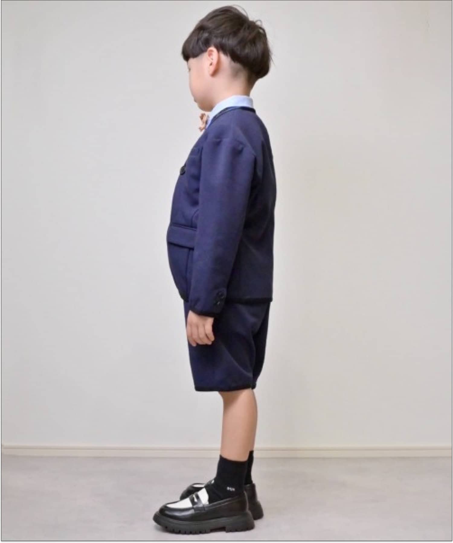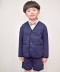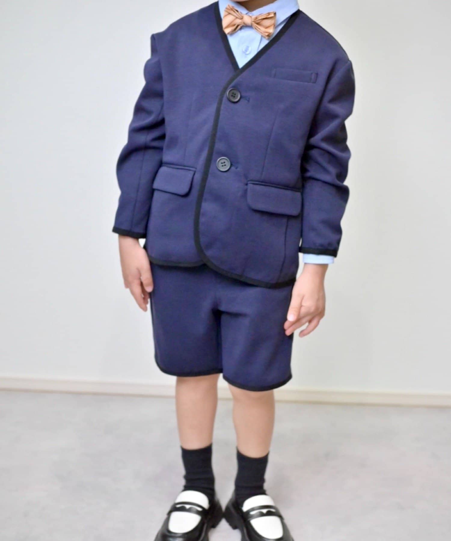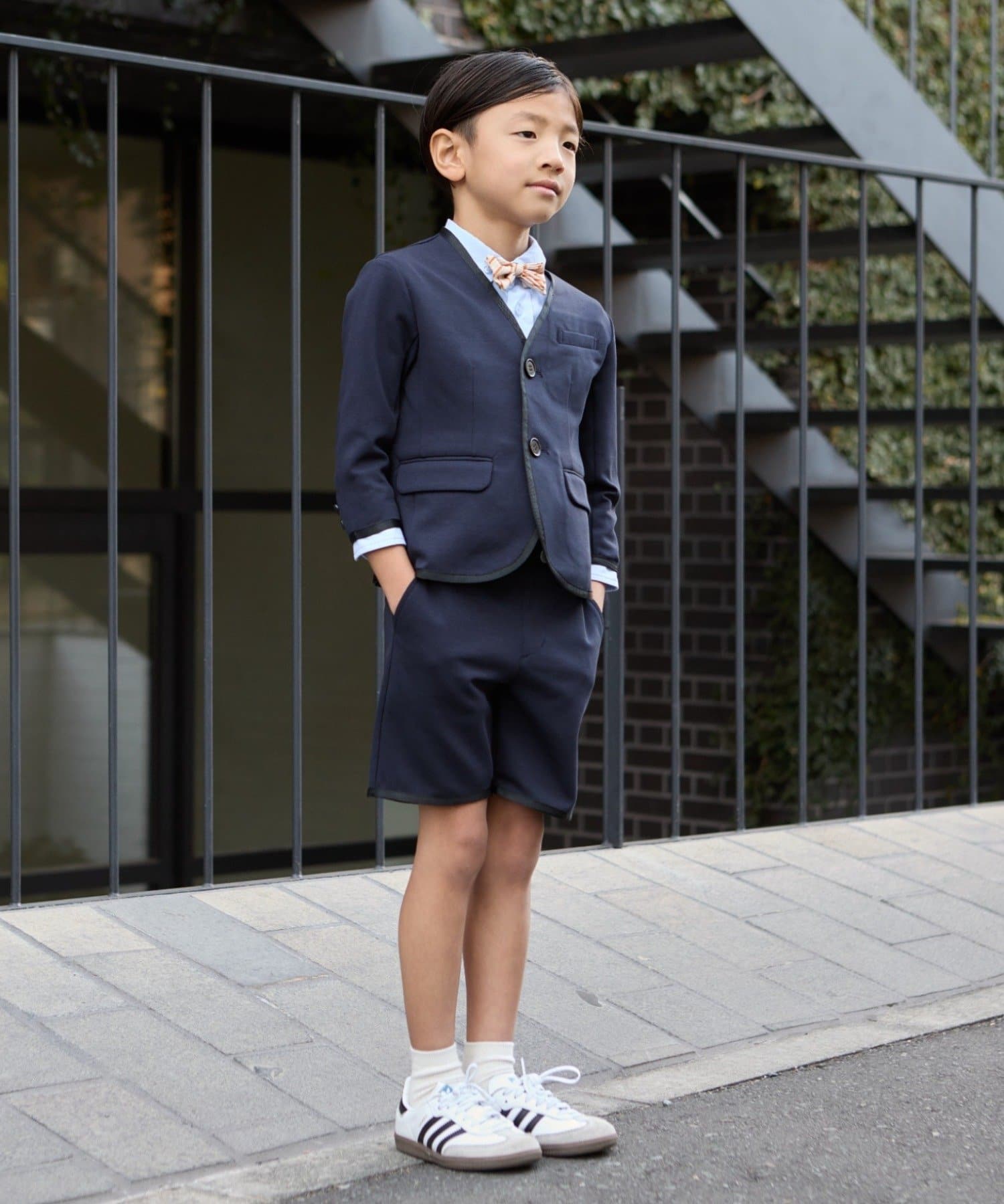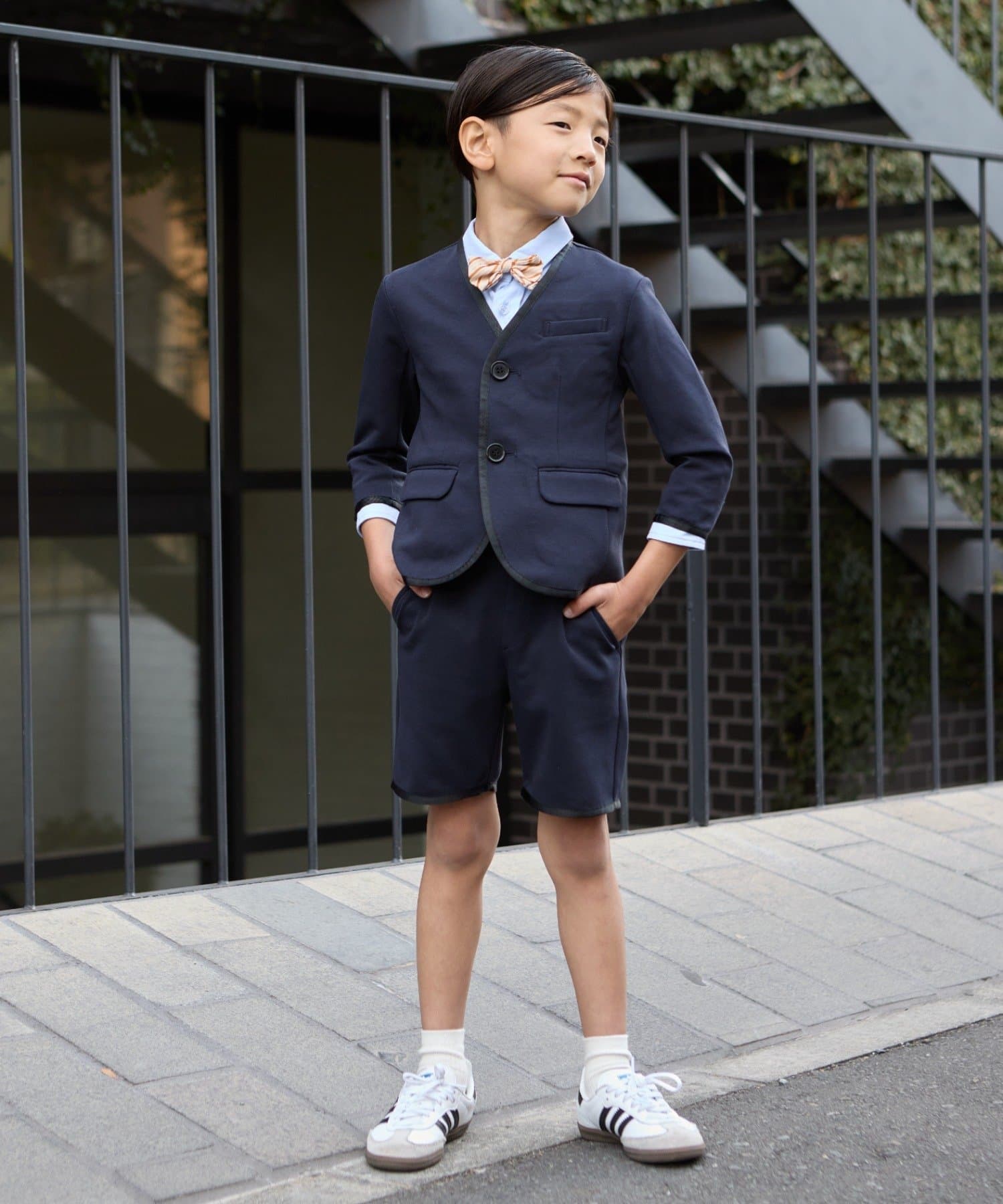 ノーカラージャケット、ハーフパンツ、襟付きシャツ、蝶ネクタイがセットに。