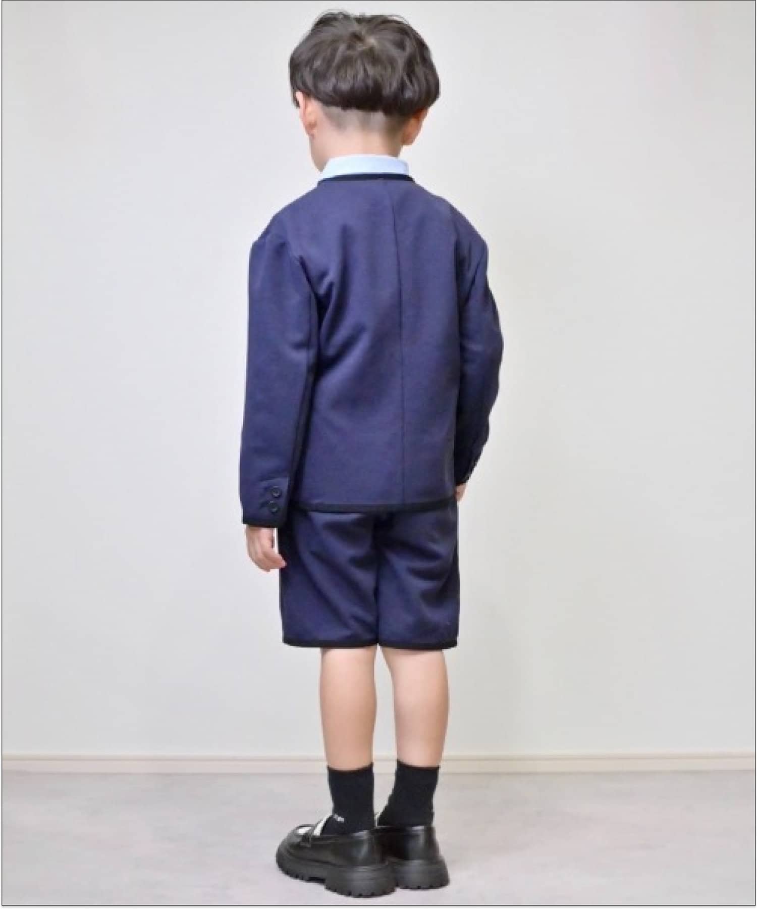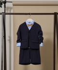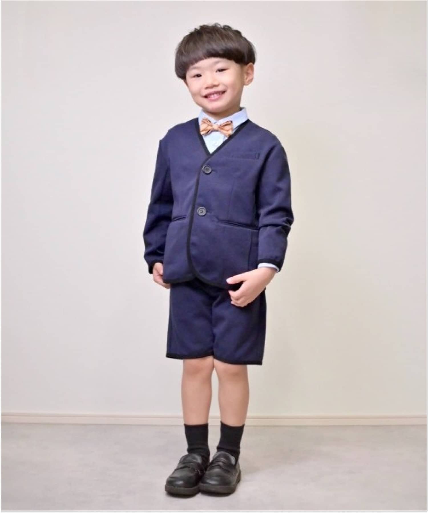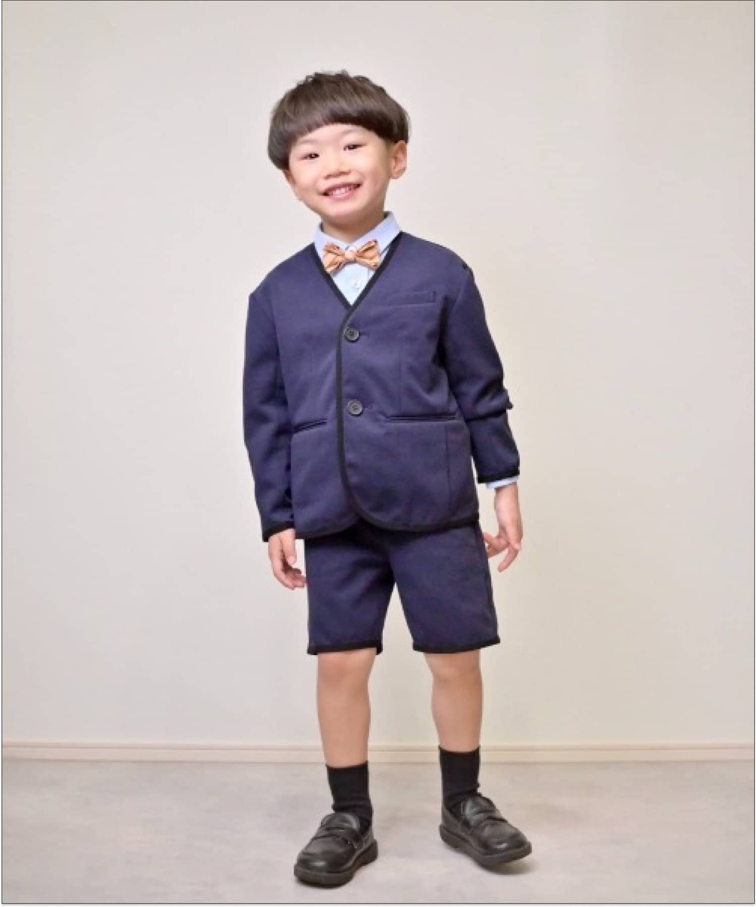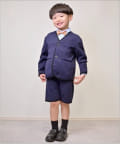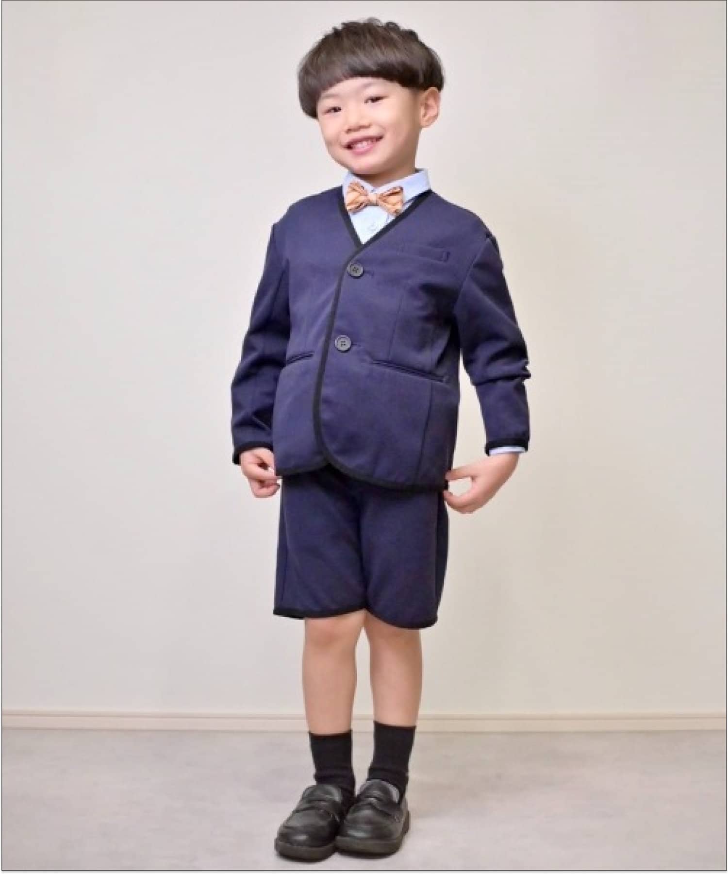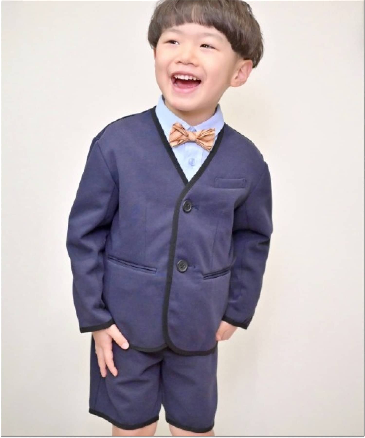 ノーカラージャケット、ハーフパンツ、襟付きシャツ、蝶ネクタイがセットに。
