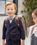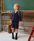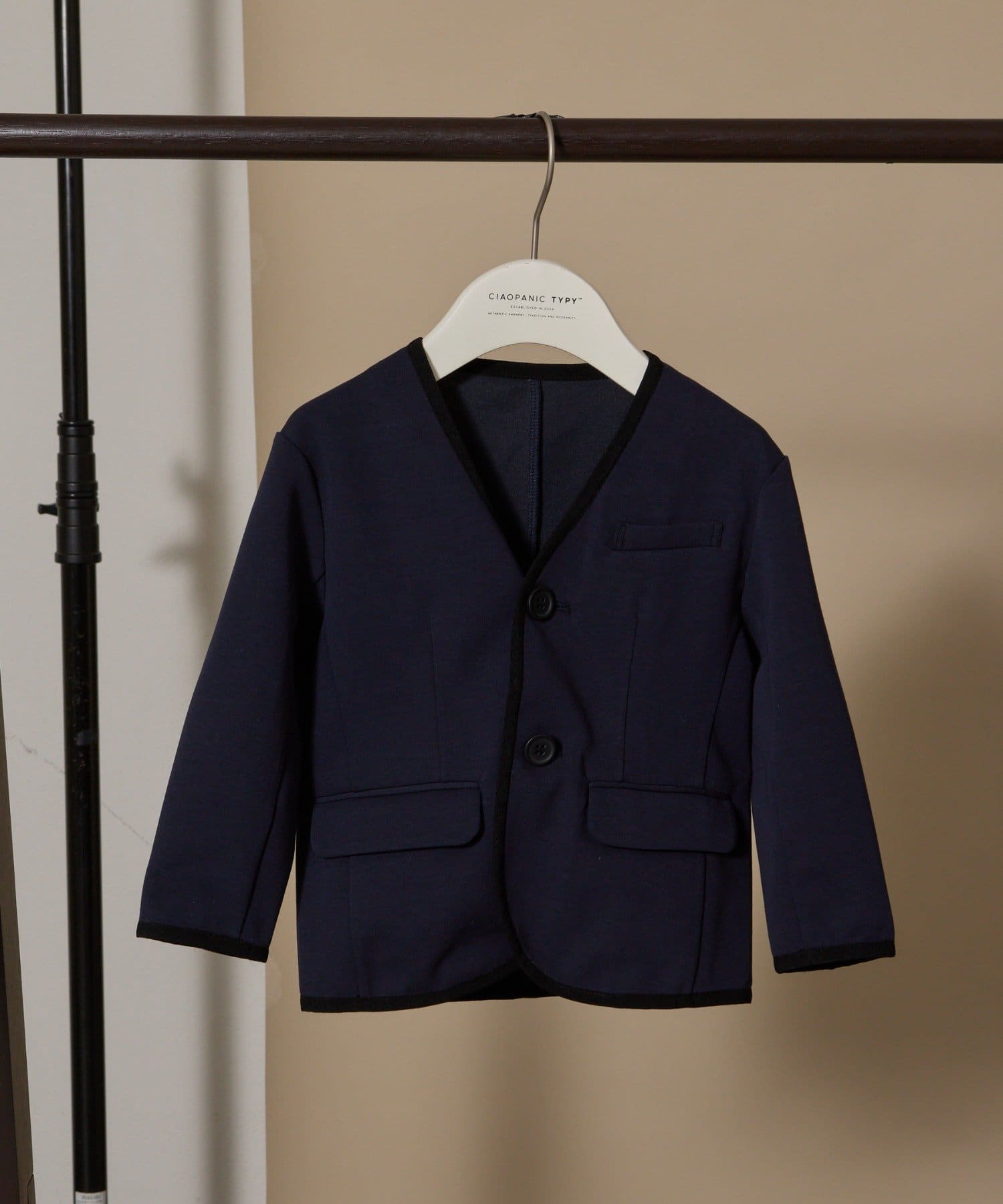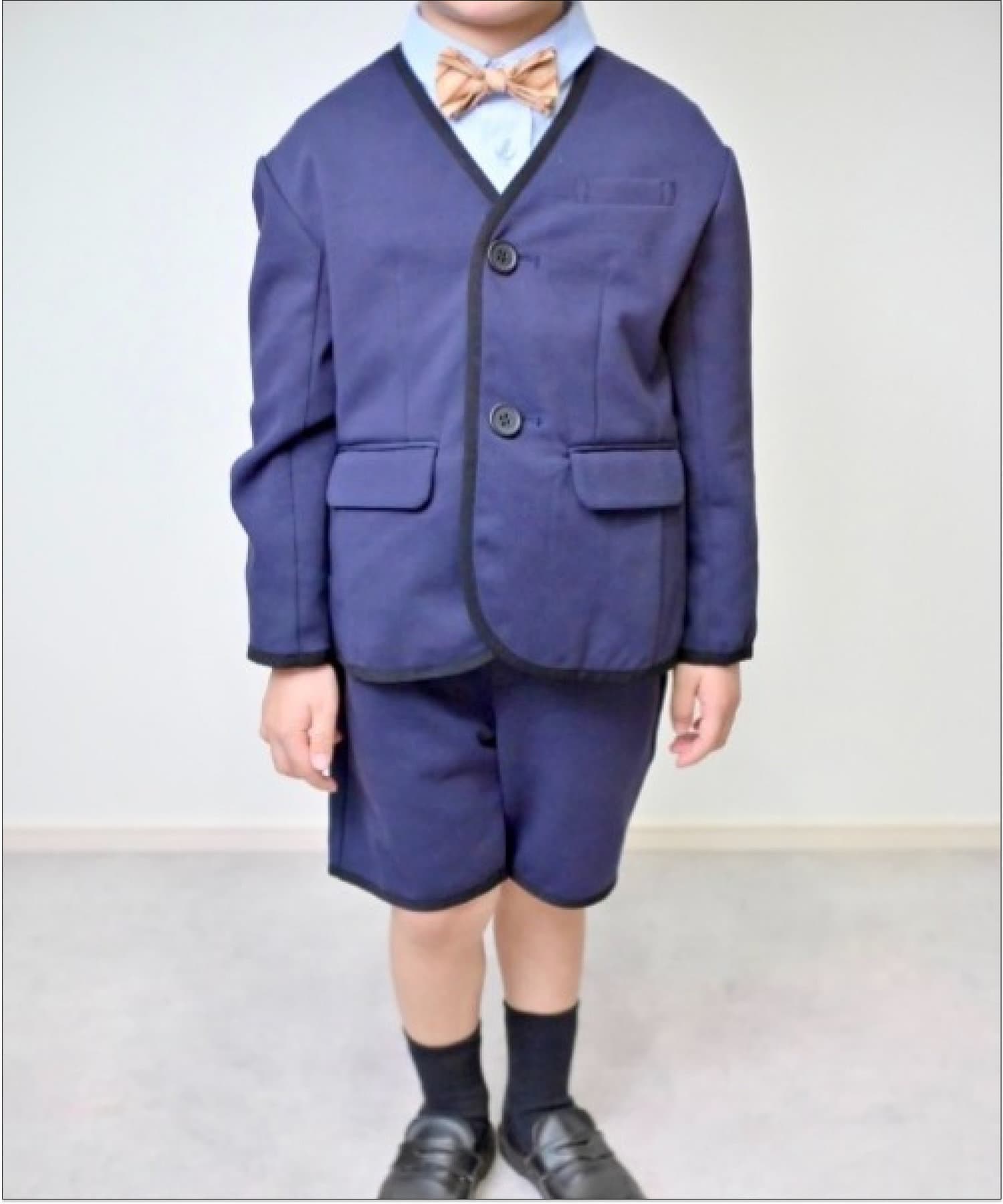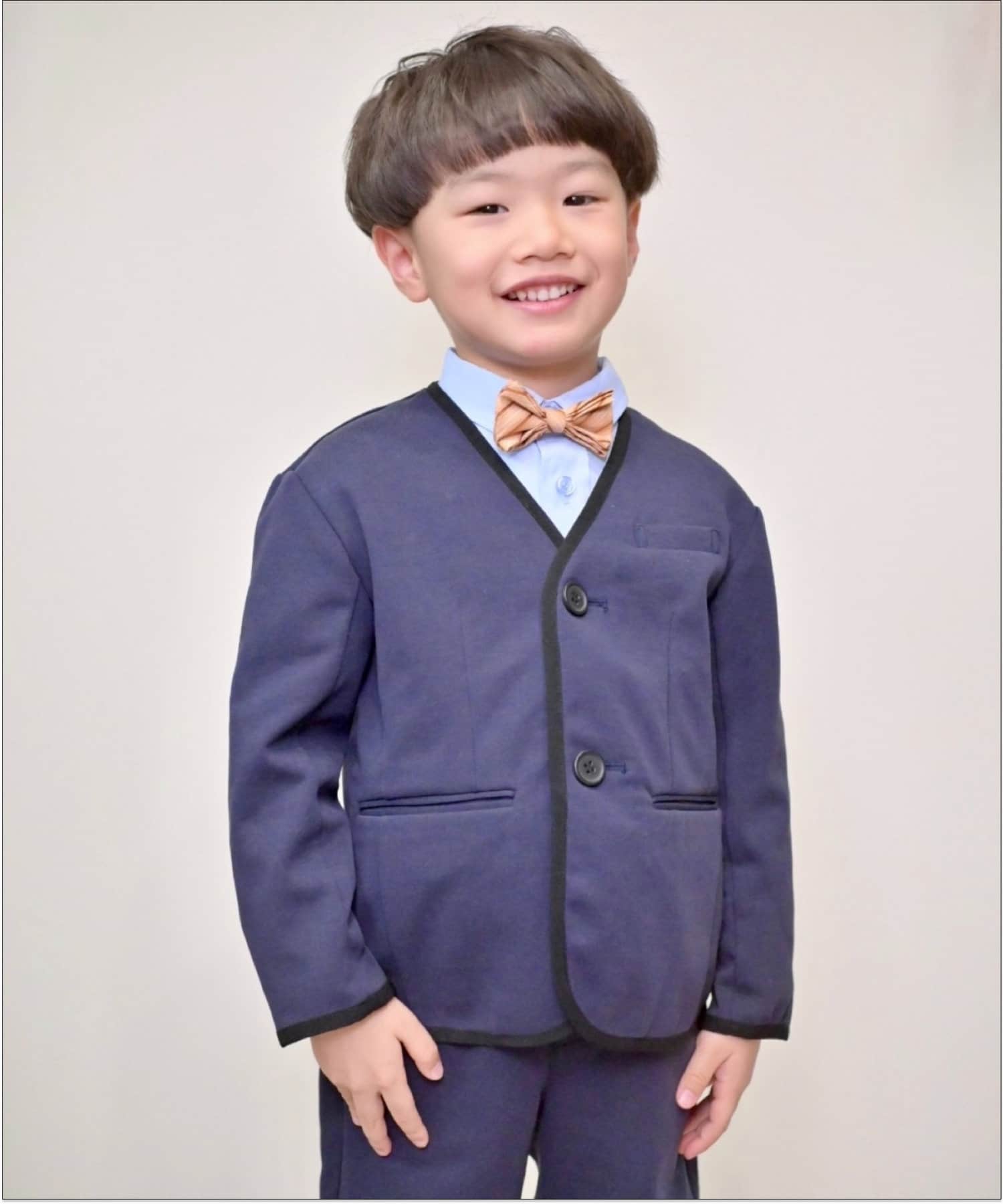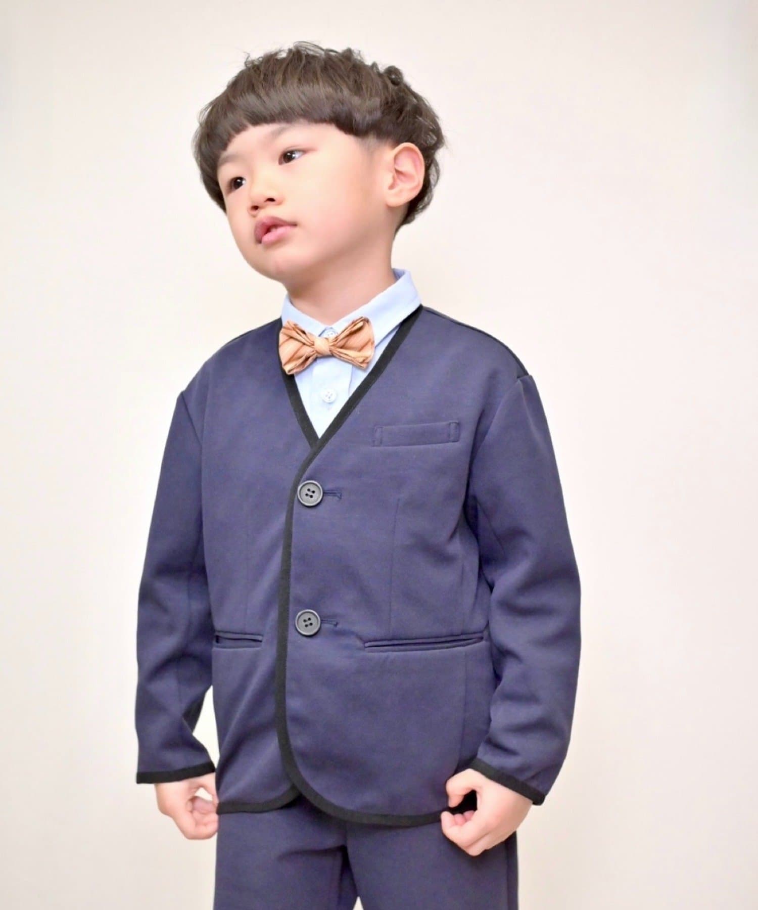 ノーカラージャケット、ハーフパンツ、襟付きシャツ、蝶ネクタイがセットに。