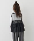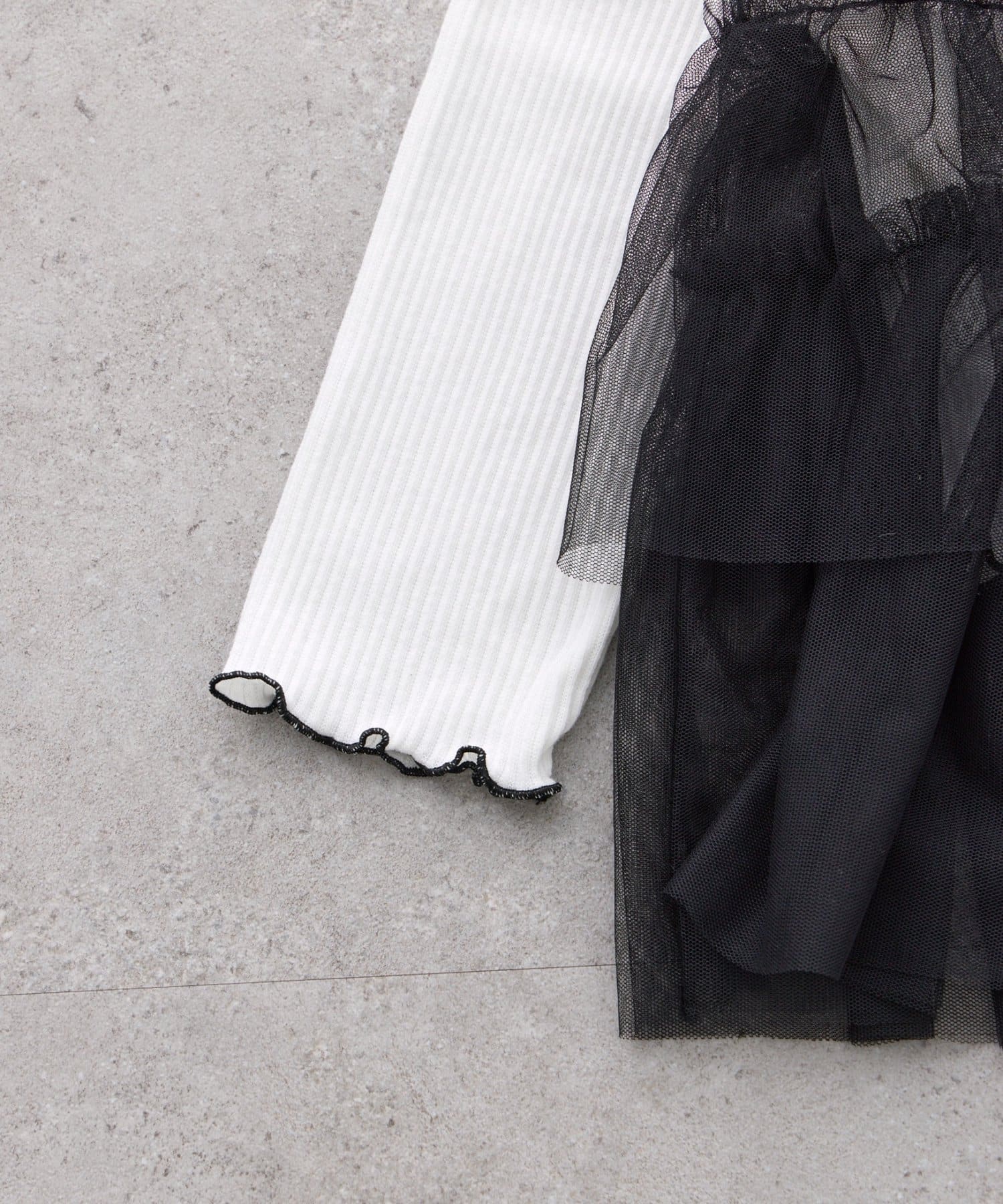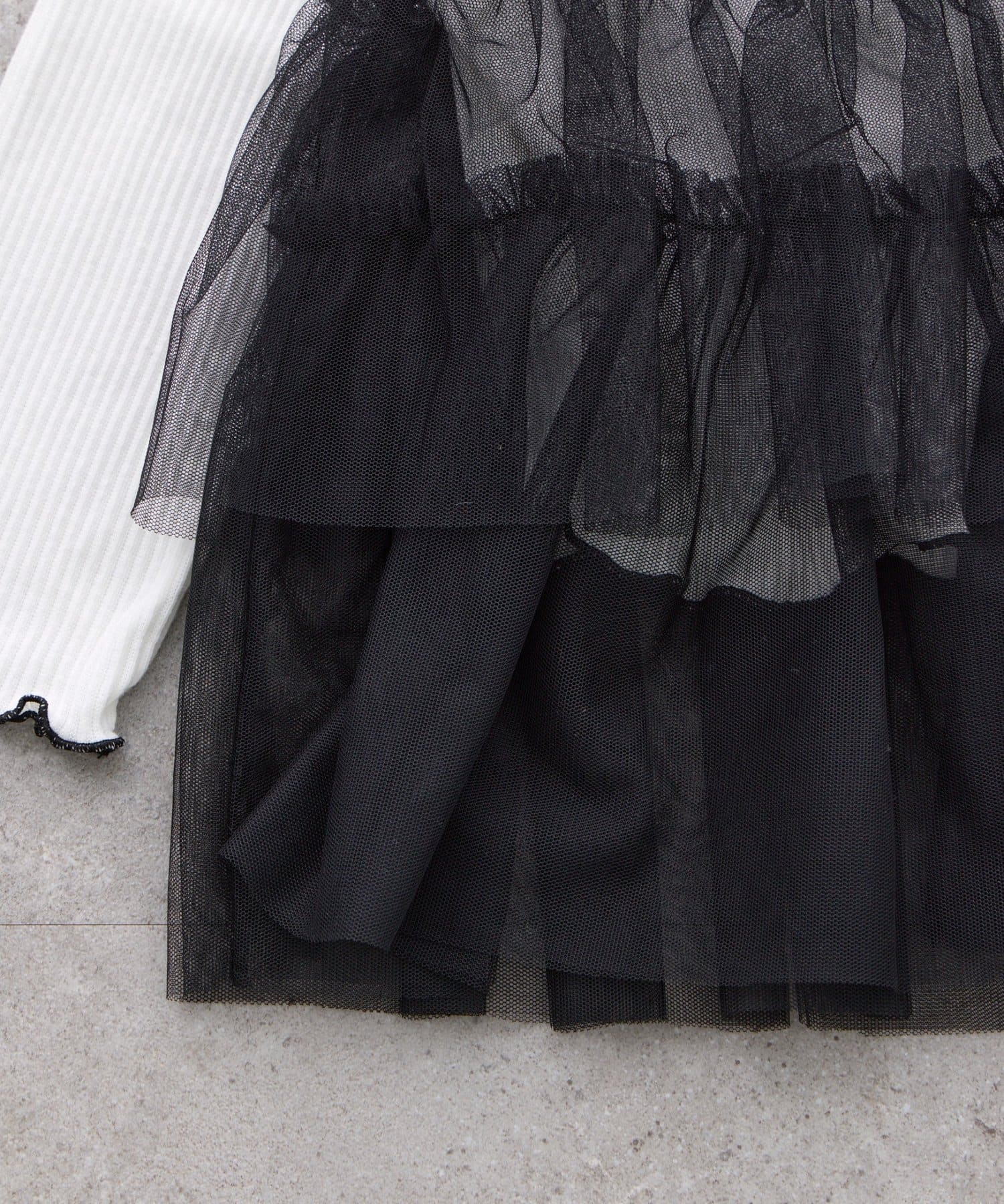 やわらかなリブ素材のトップスに、チュールを重ねたデザインで、普段のカジュアルスタイルを格上げしてくれます。