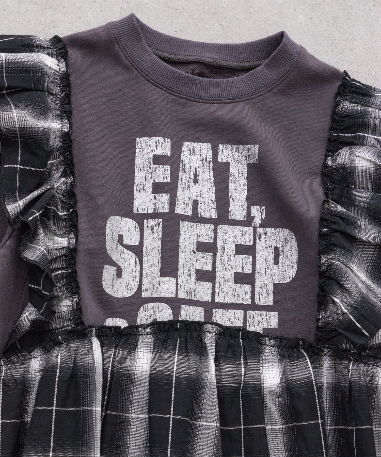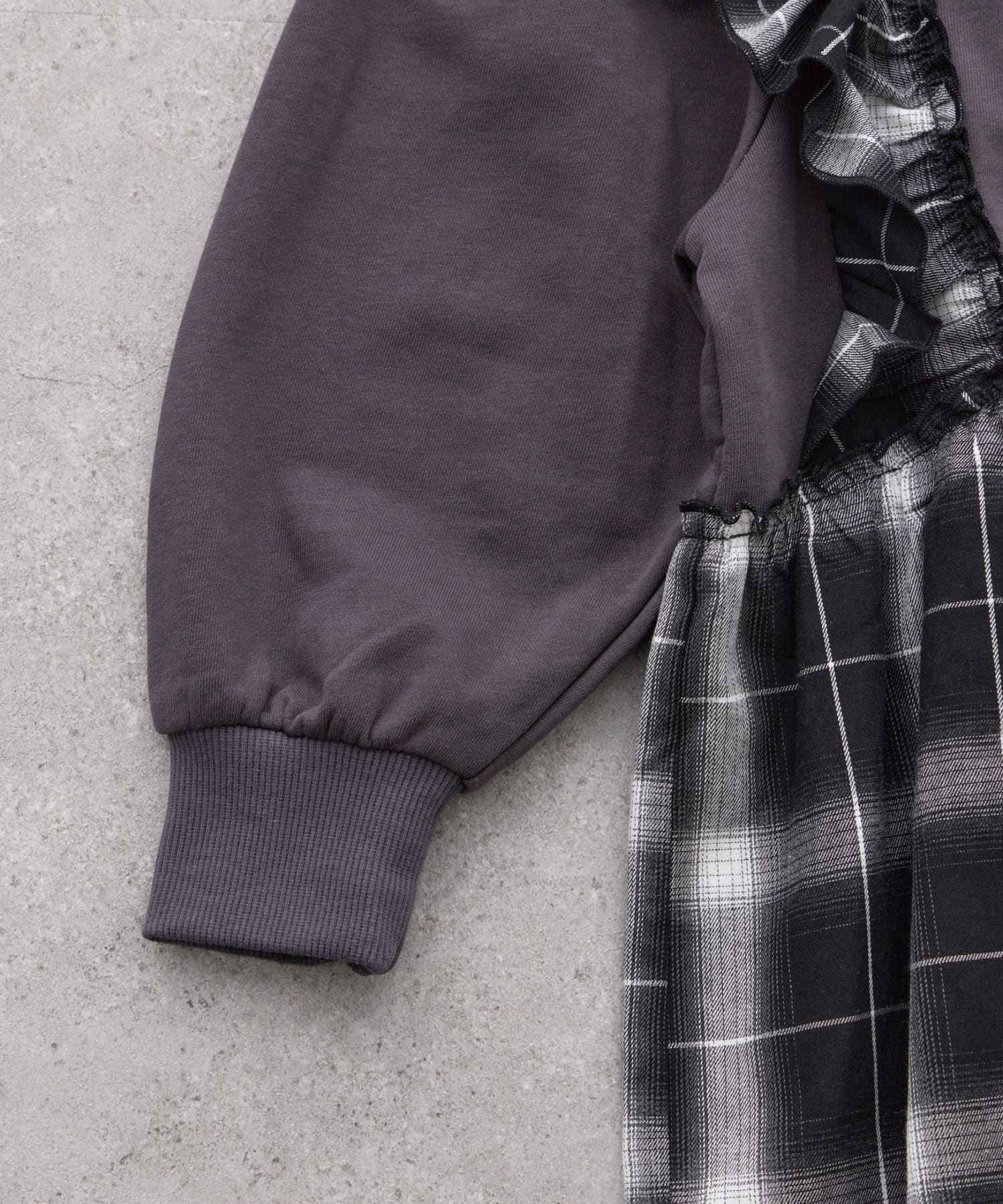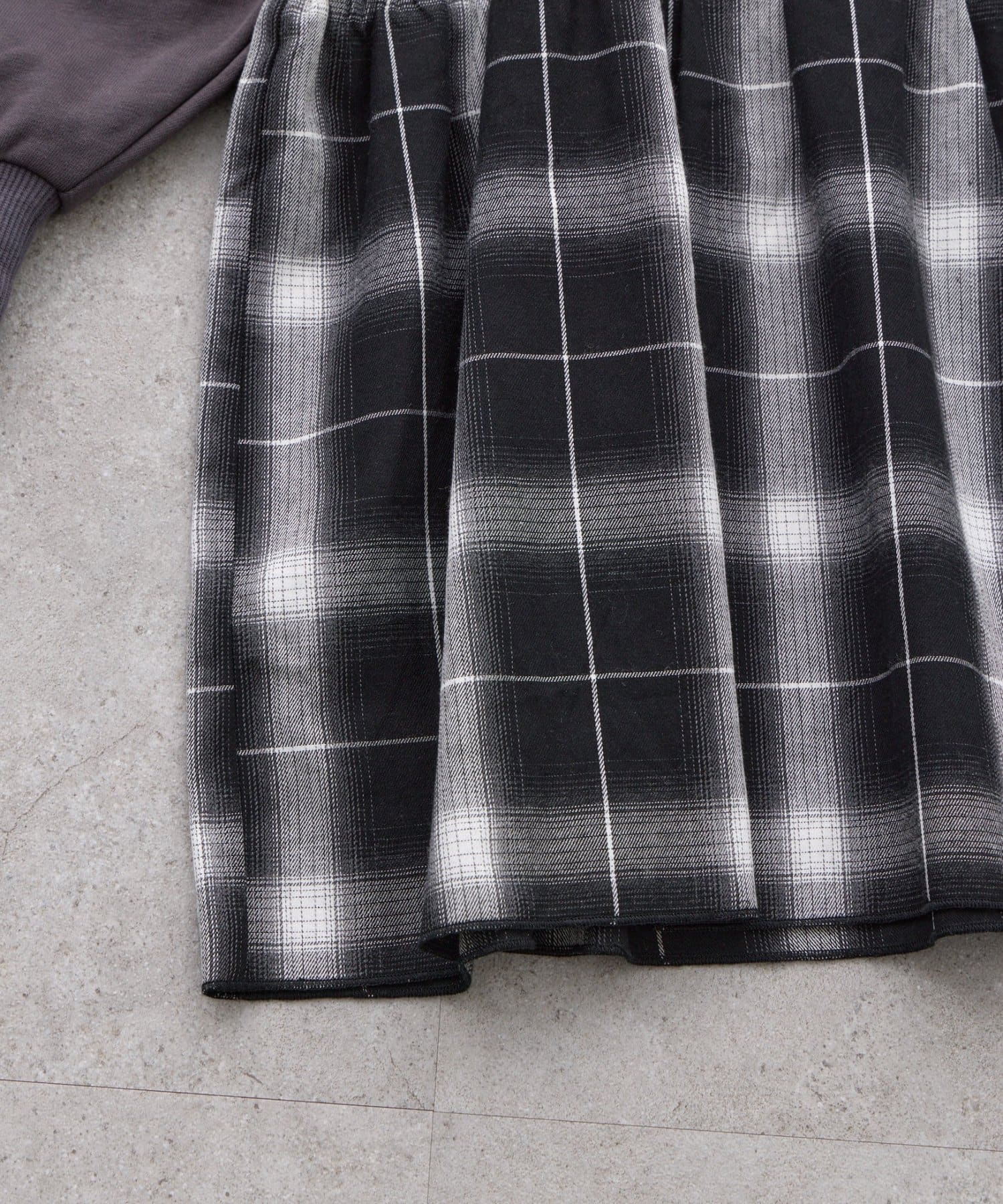 トップス部分はスウェット素材でカジュアルに、スカート部分はふんわりと広がるブラックの生地で上品さをプラスした、異素材ミックスのワンピースです。