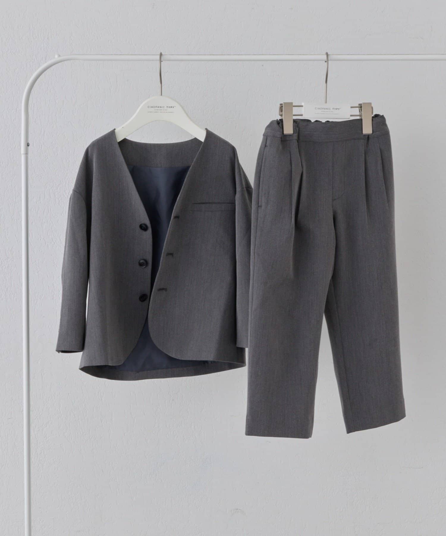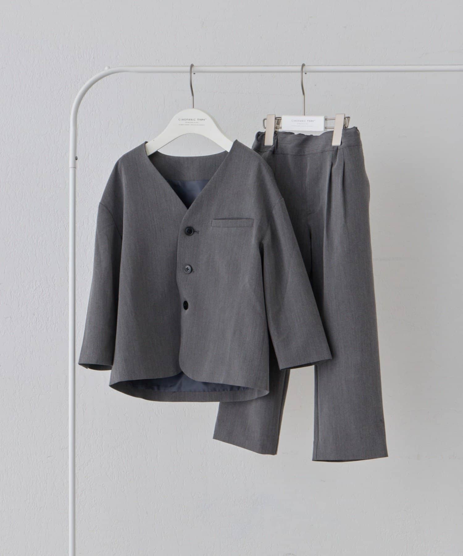 普段着としてはもちろん、お祝いの席やちょっとしたお出かけにも最適な、Vネックジャケットとパンツのセットアップ