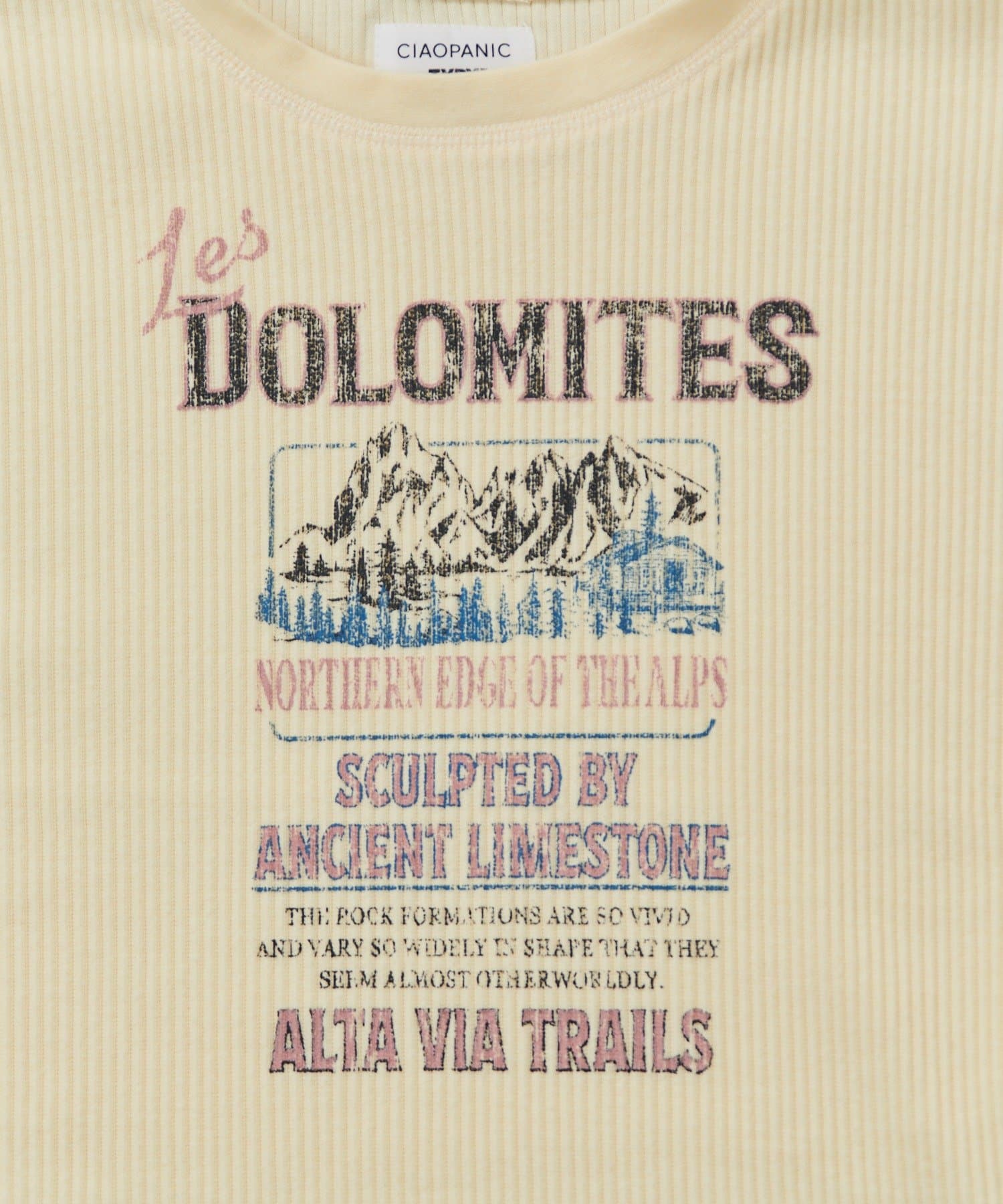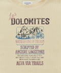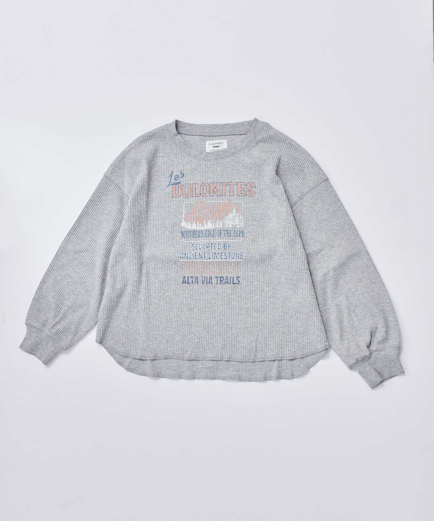 フロントに施されたプリントが目を引くトップスです。レトロな雰囲気のロゴとイラストが組み合わさったデザインは、カジュアルながらもどこか懐かしい印象を与えます。