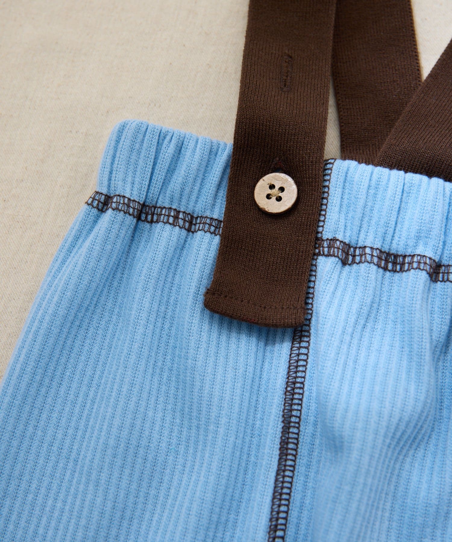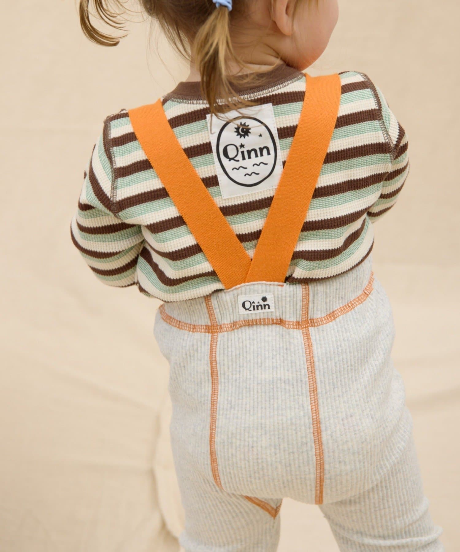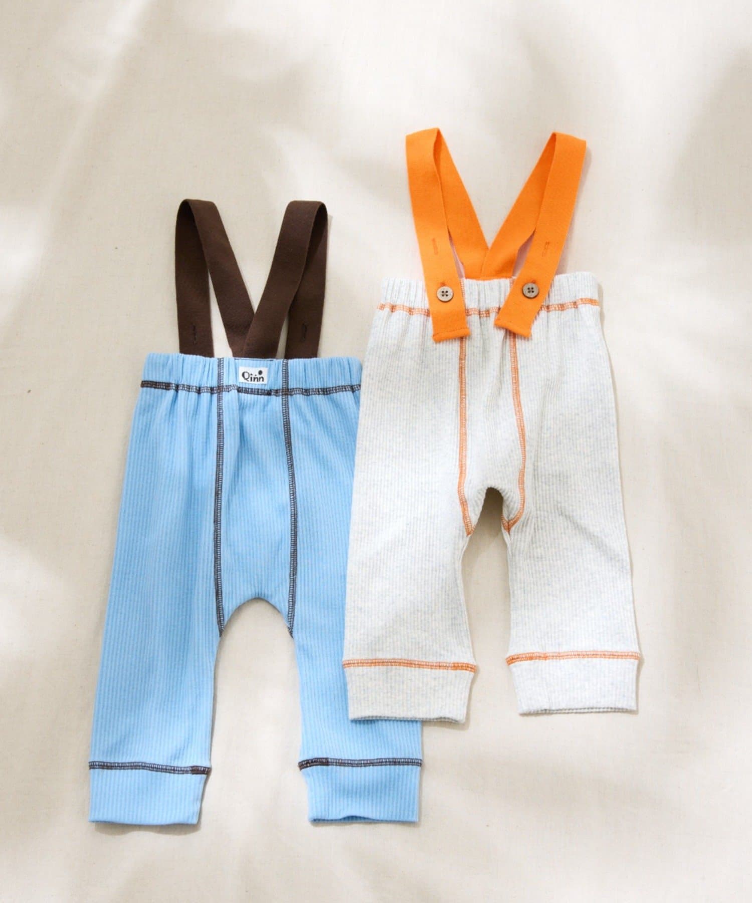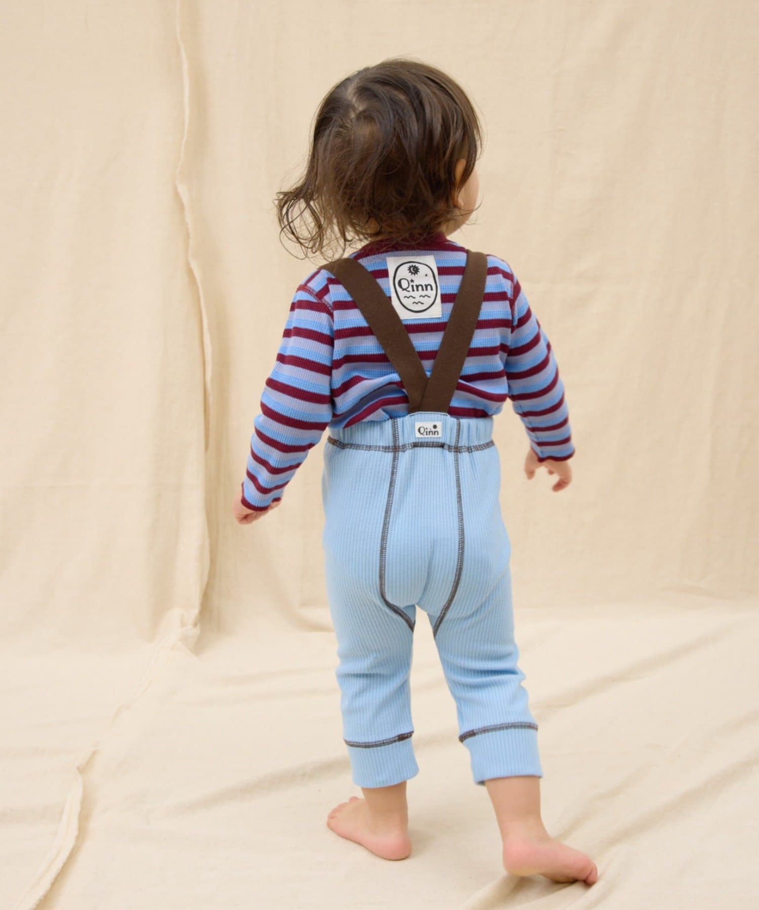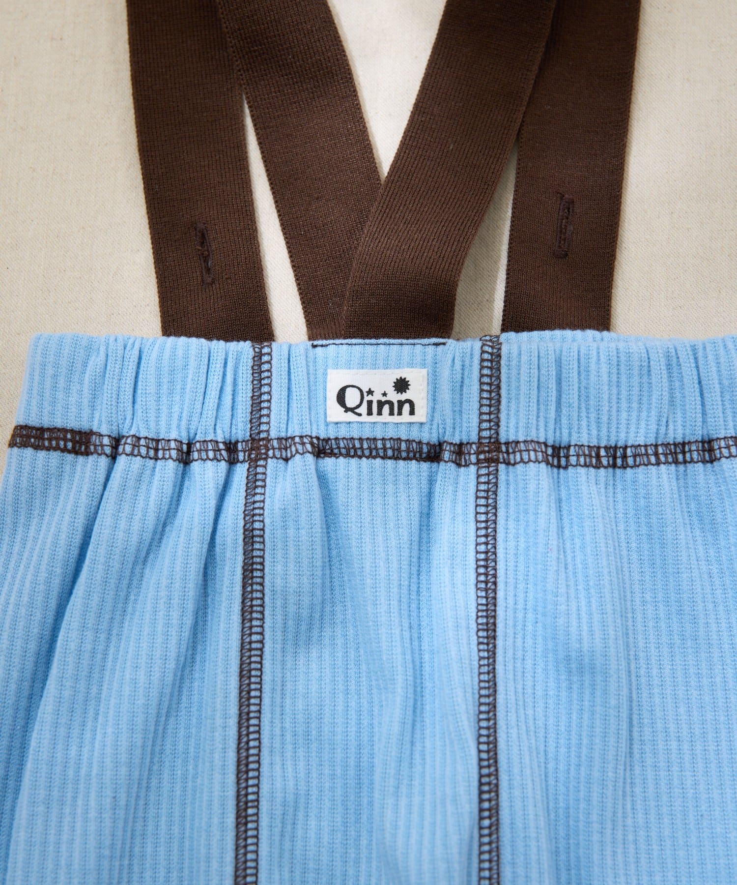 やわらかなリブ素材に、Qinnらしい配色サスペンダーを付けたデザインパンツ。