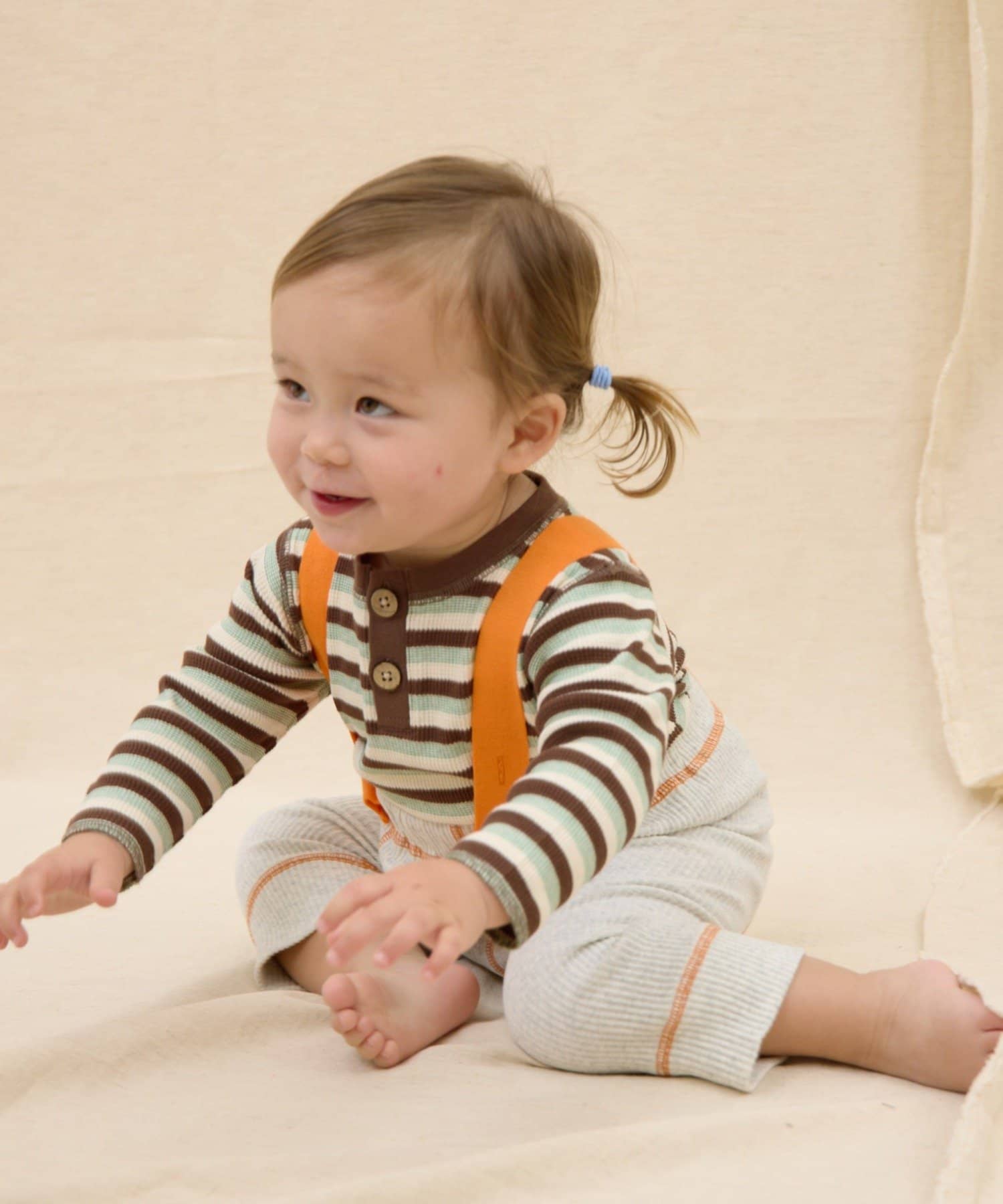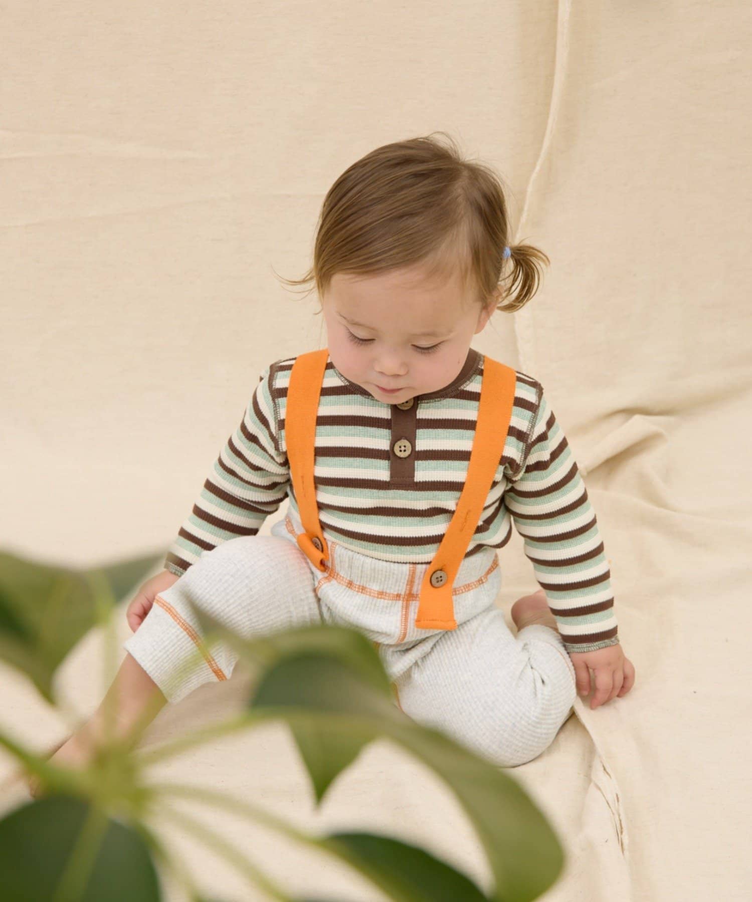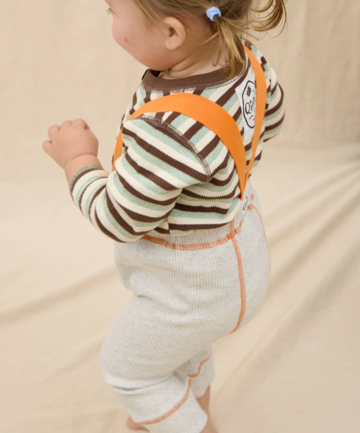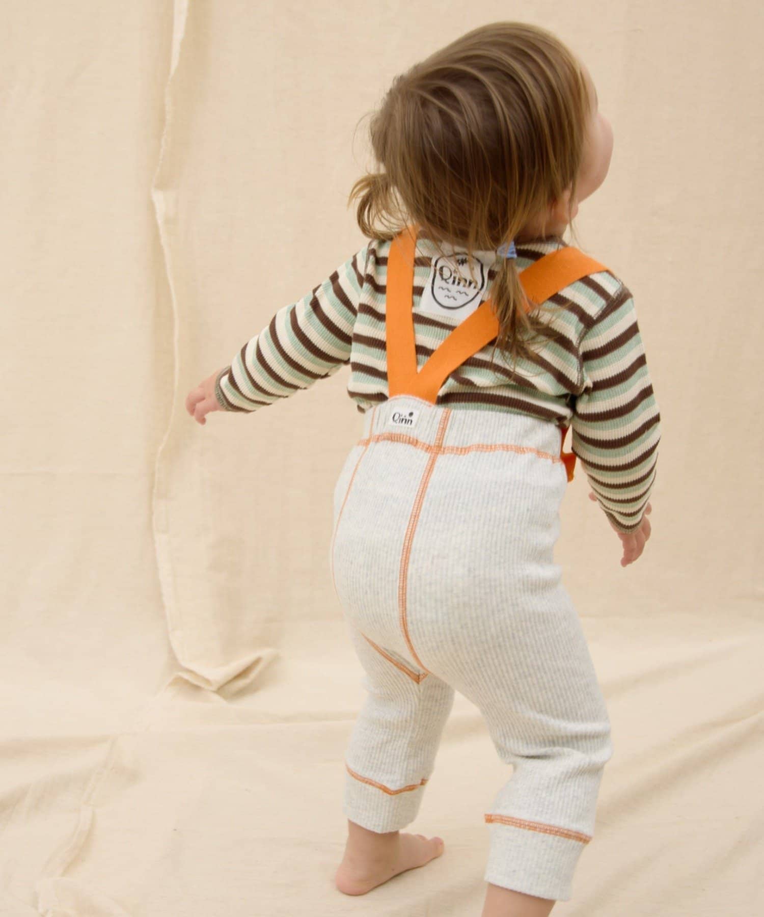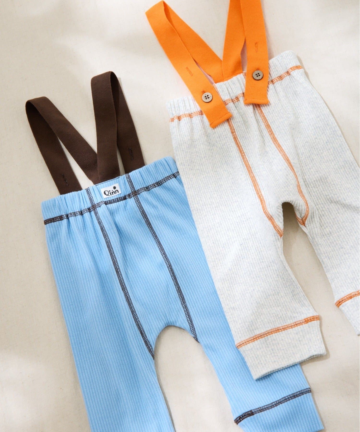 やわらかなリブ素材に、Qinnらしい配色サスペンダーを付けたデザインパンツ。