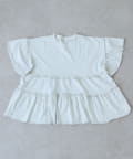 シンプルな無地ベースながら、袖のフリルと胸下から広がるティアードフリルが目を引く一枚です。