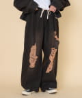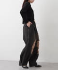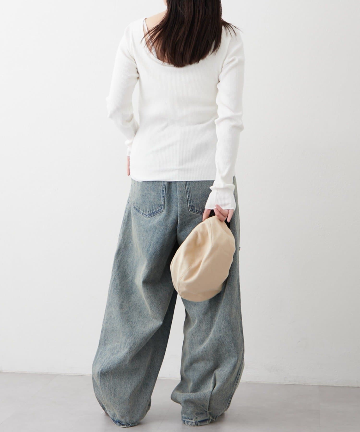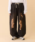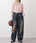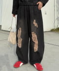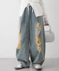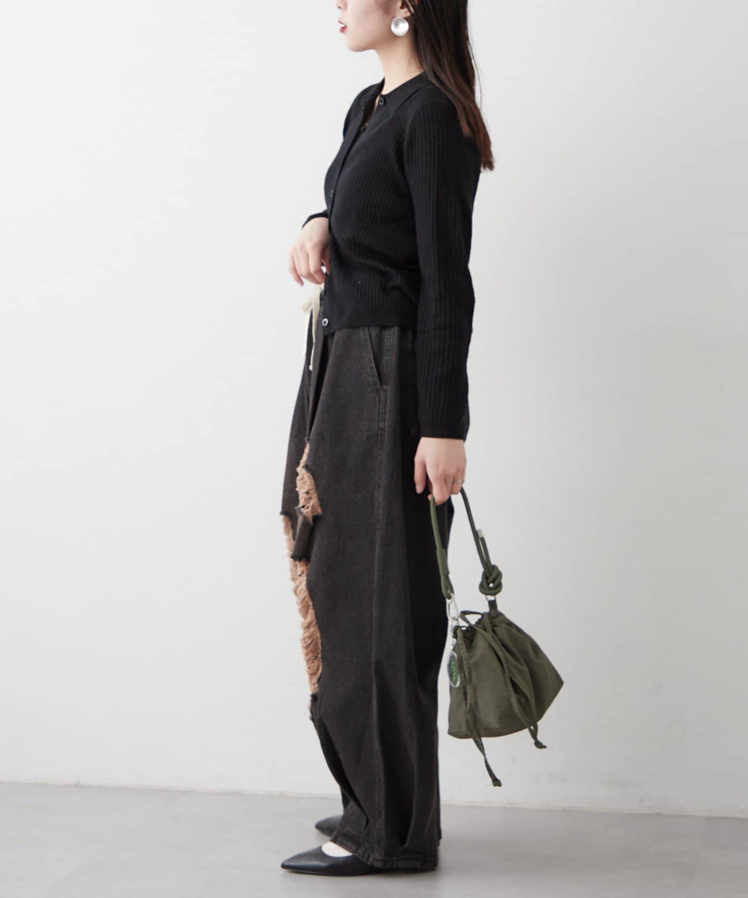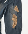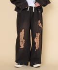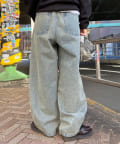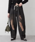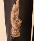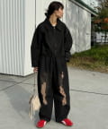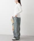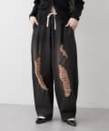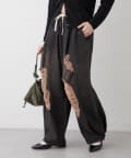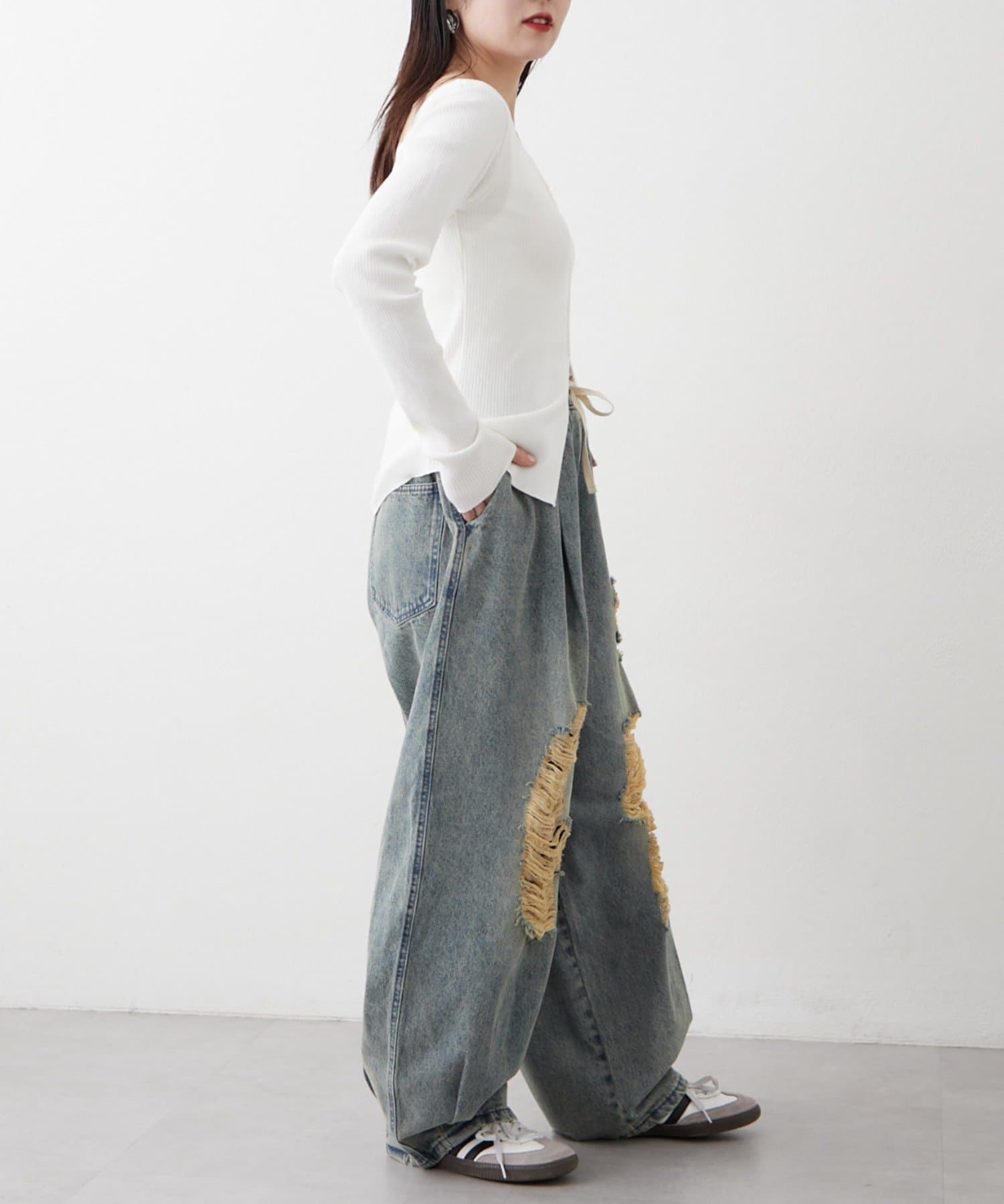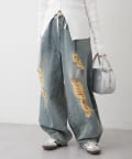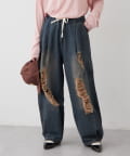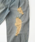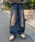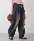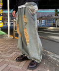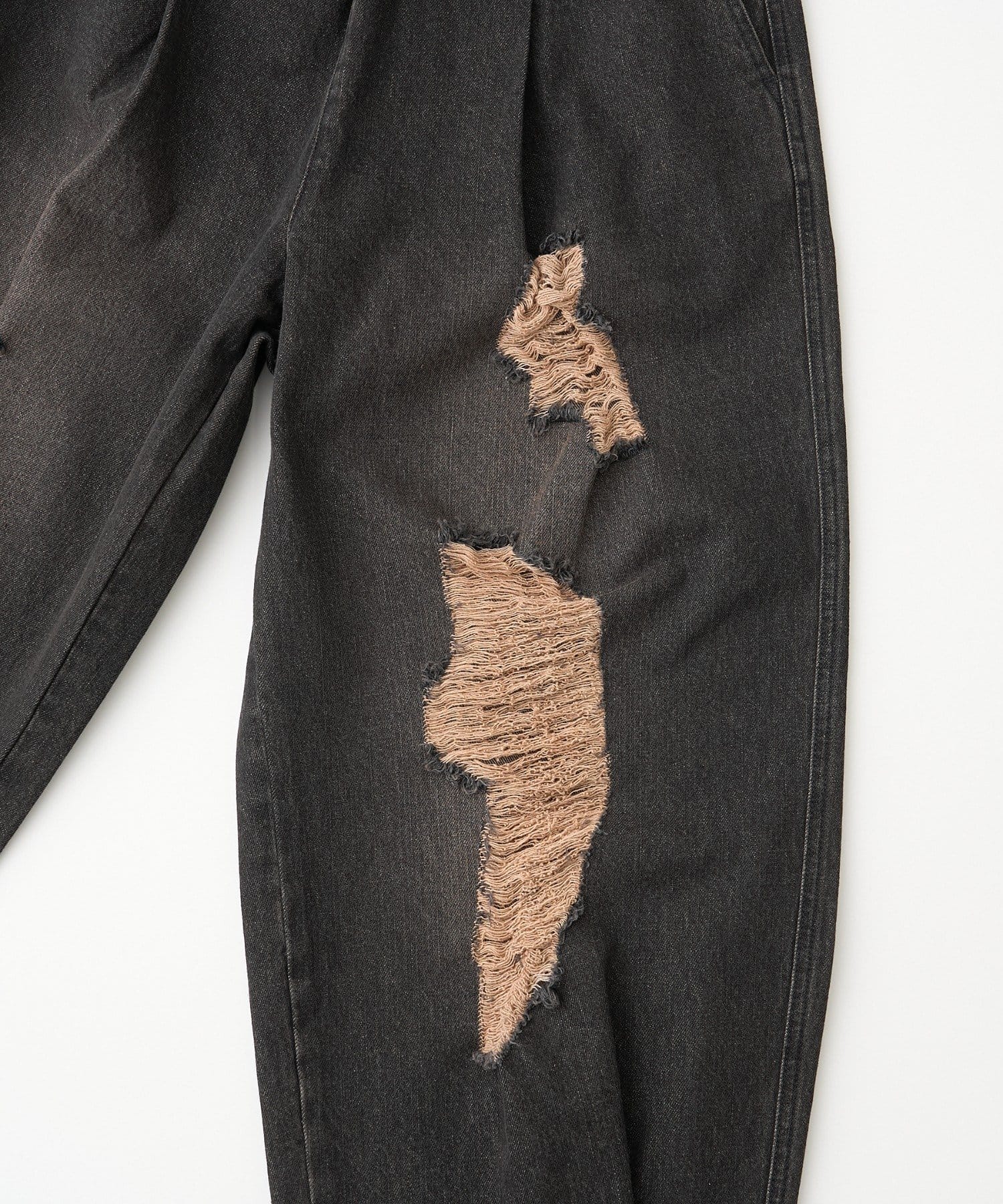 カーブを描いた立体感のある独特なレッグラインと、大胆なダメージ加工が特徴的なデニムパンツ。