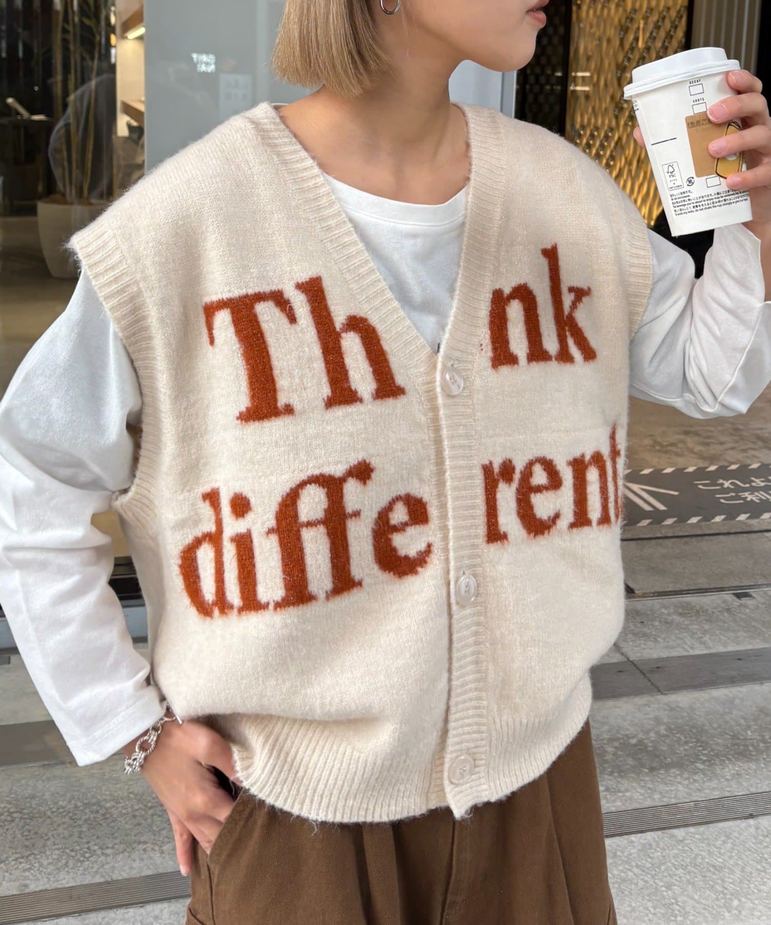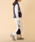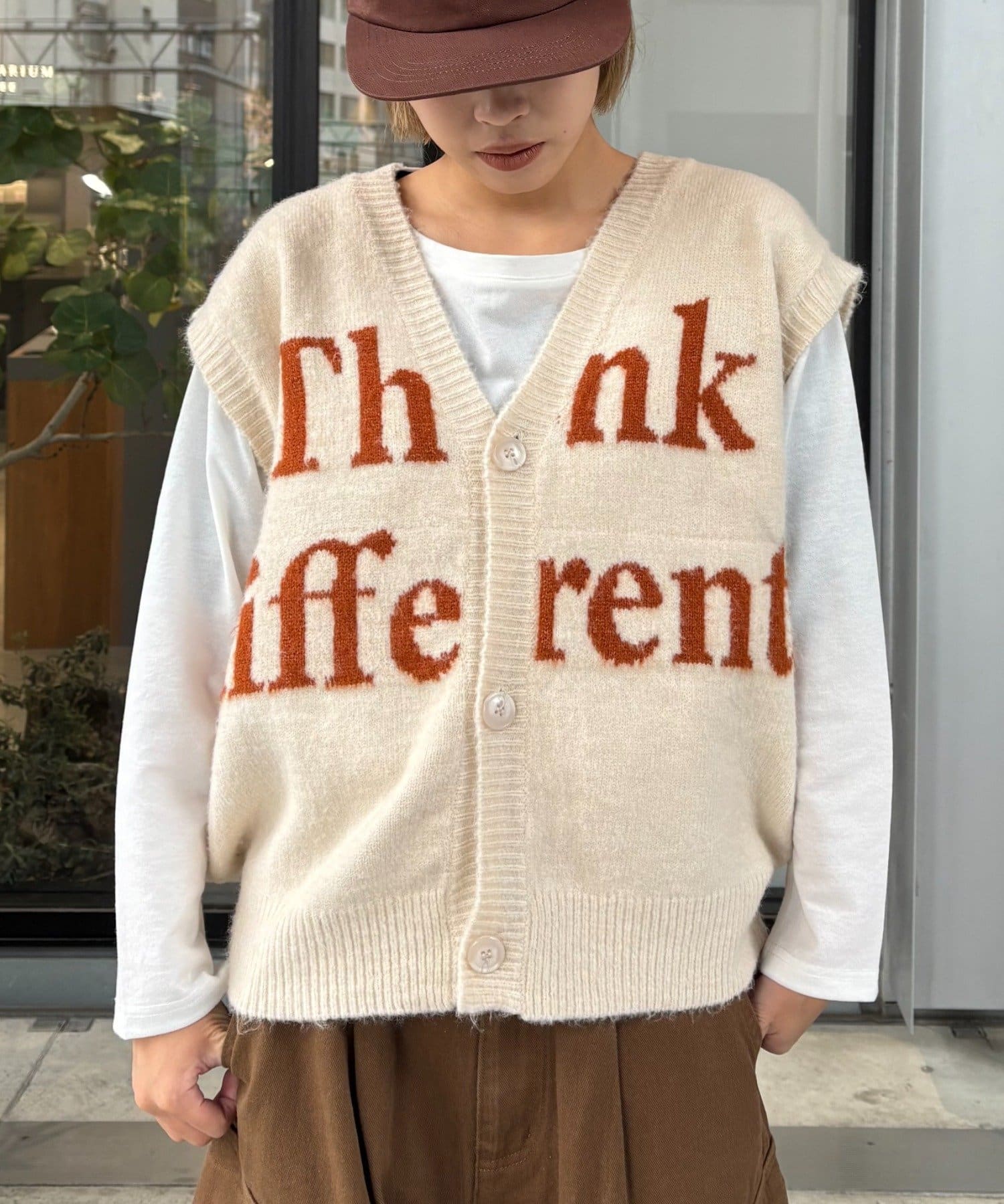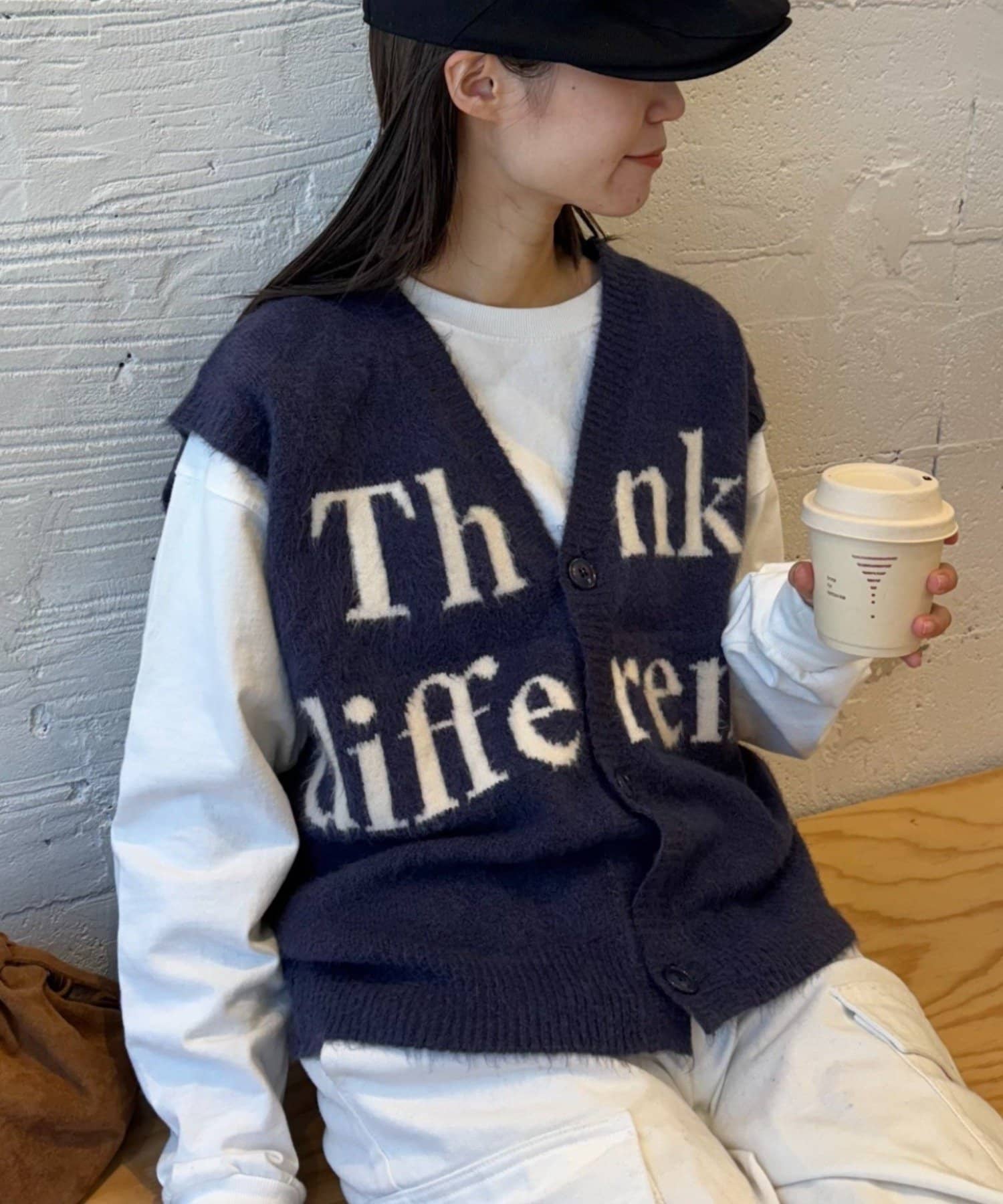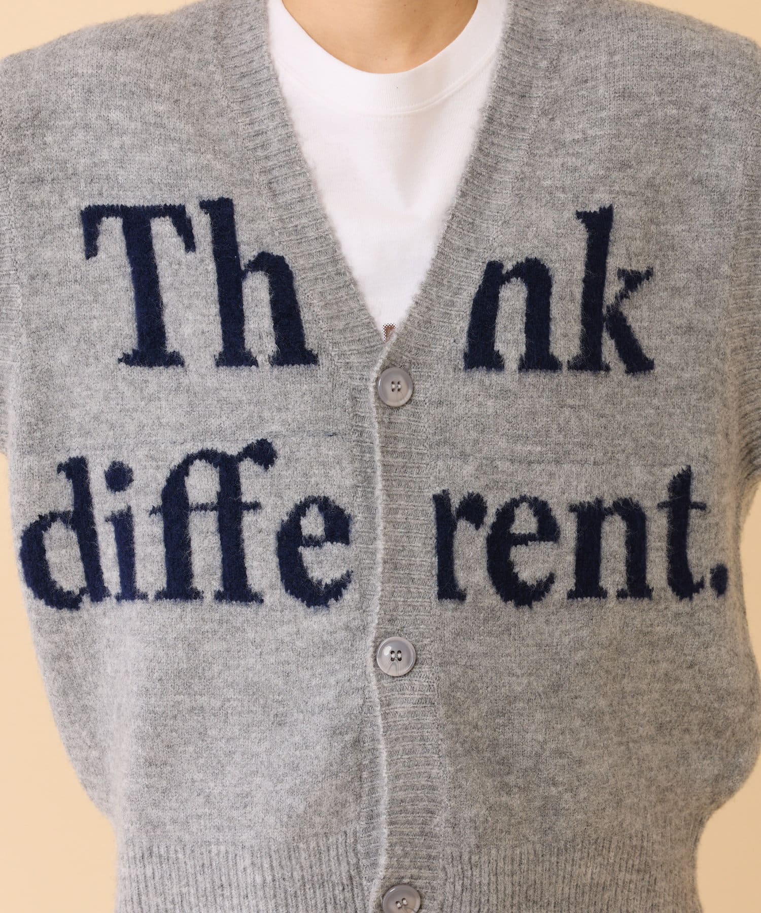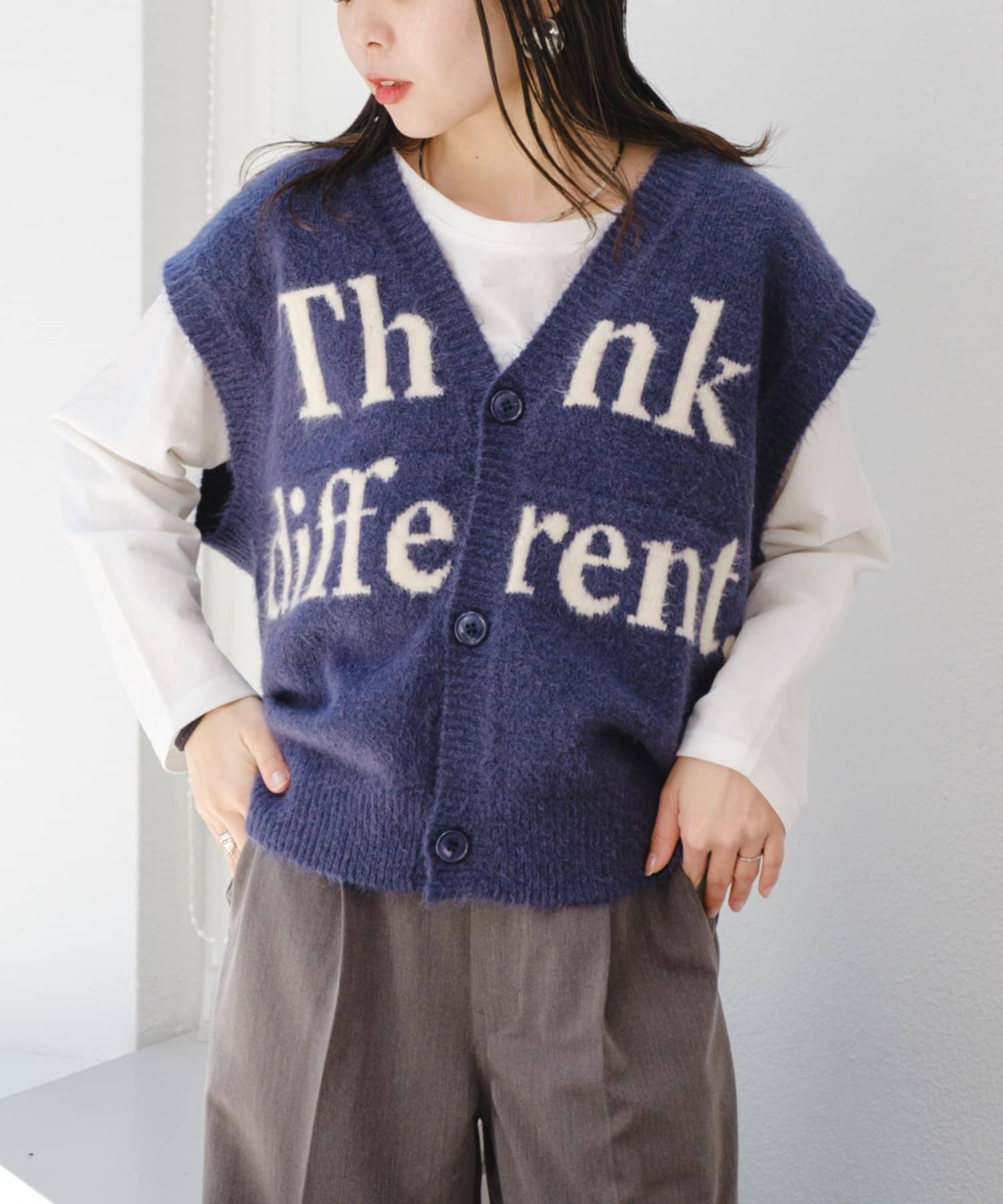 フロントのロゴデザインが目を引くニットベストです。