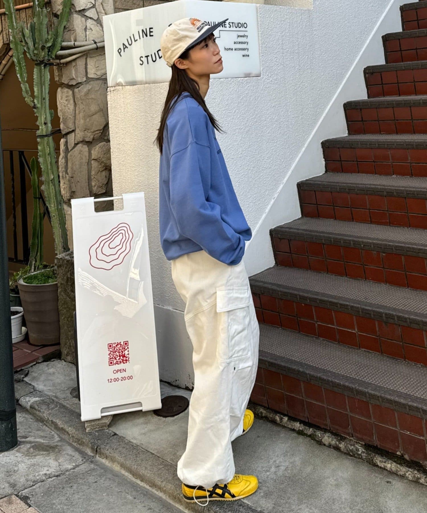 刺繍のカラーを拾ったバッグやソックスなどを合わせたスタイリングもおすすめです。