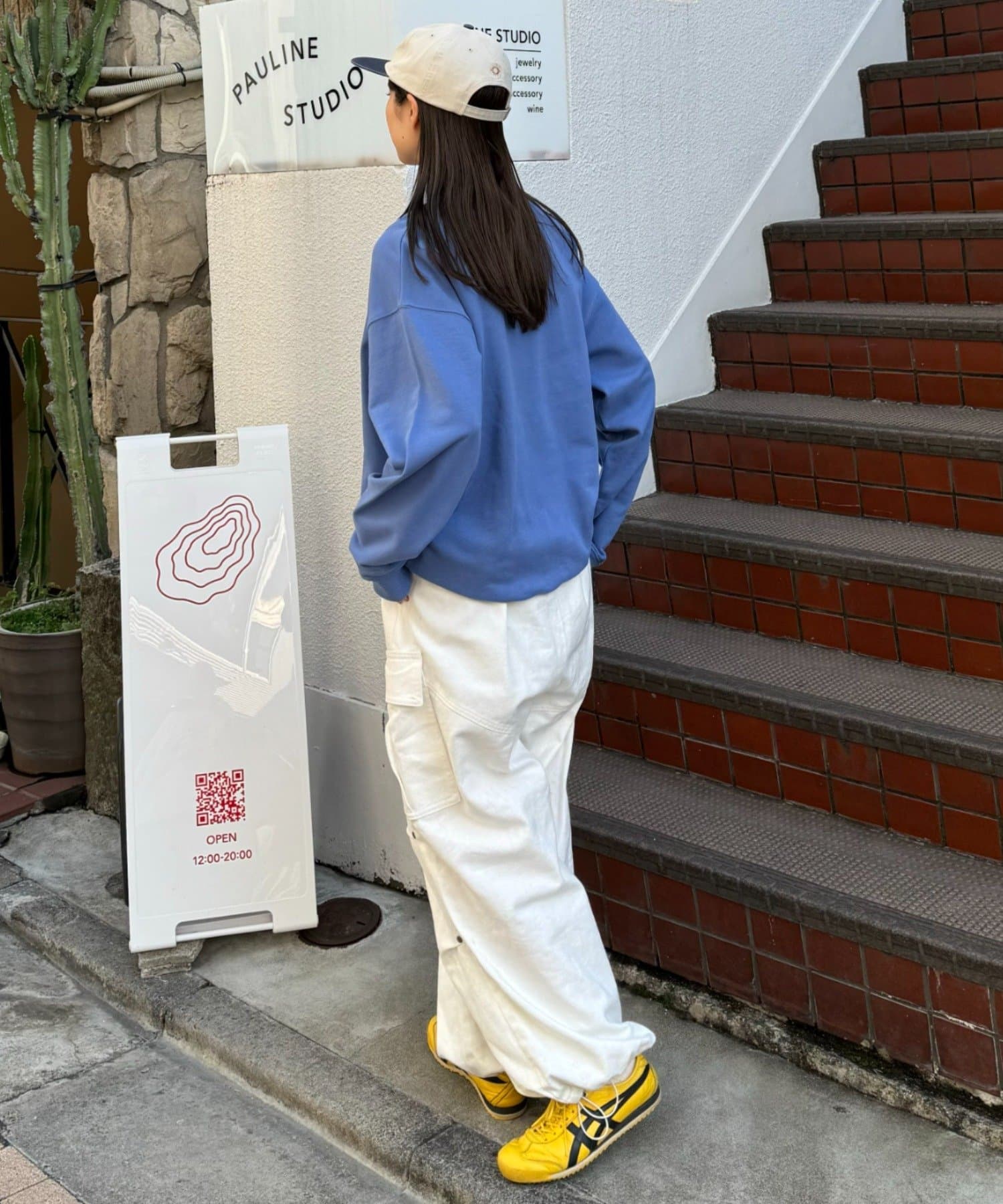コーデの主役になるデザインなので、シンプルなボトムスを合わせるだけで様になります。ワイドパンツやハーフパンツ、スラックス、スカートなど様々なスタイリングをお楽しみいただけます。