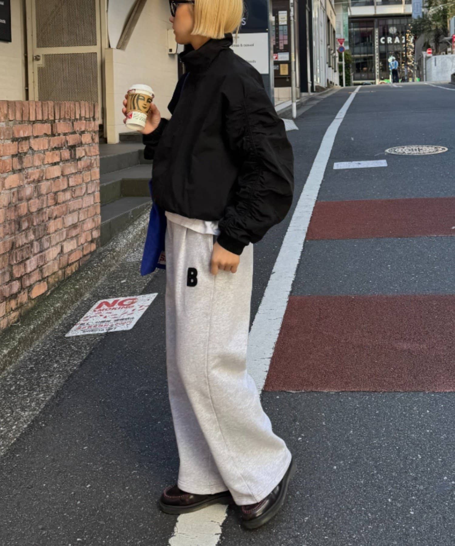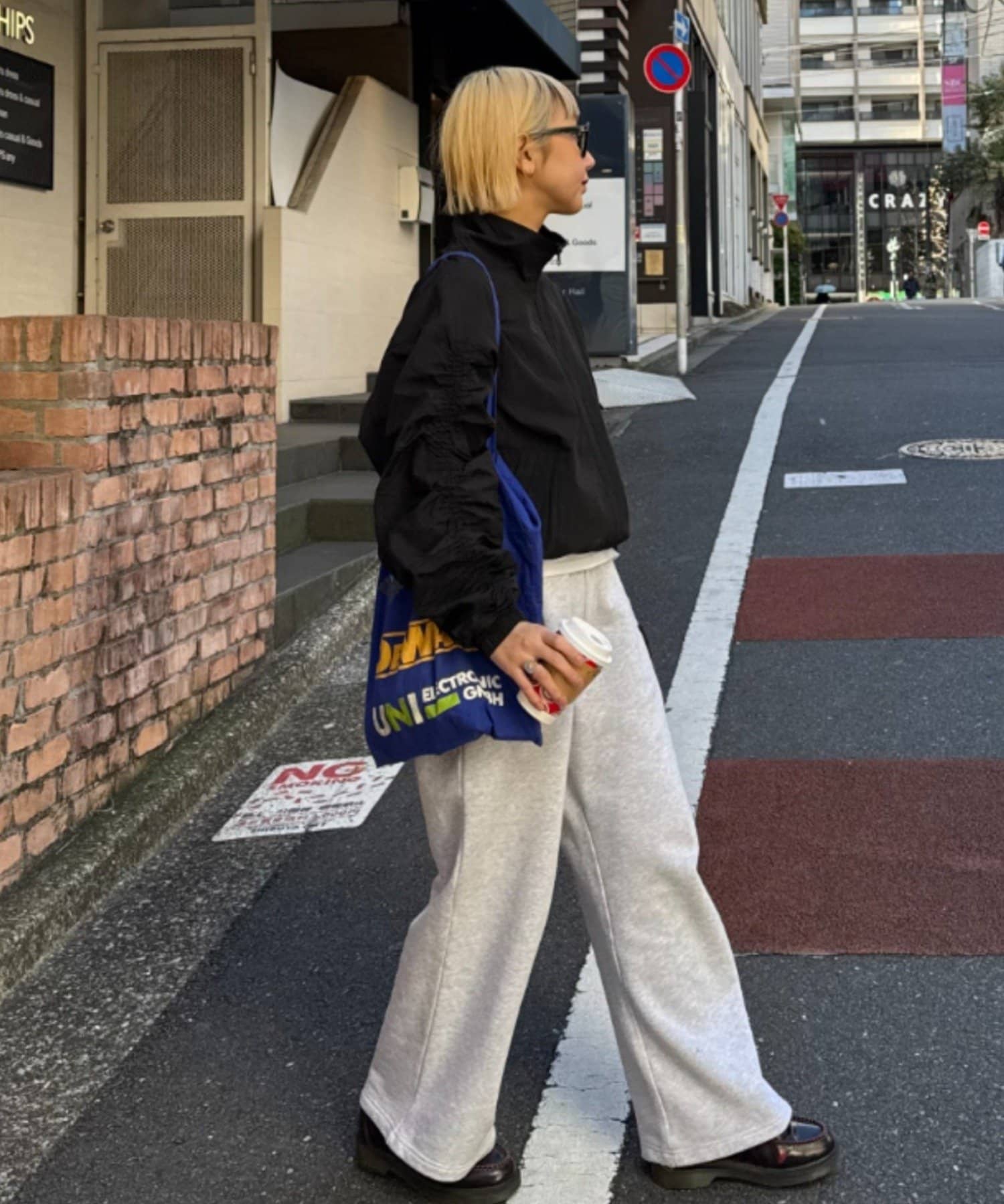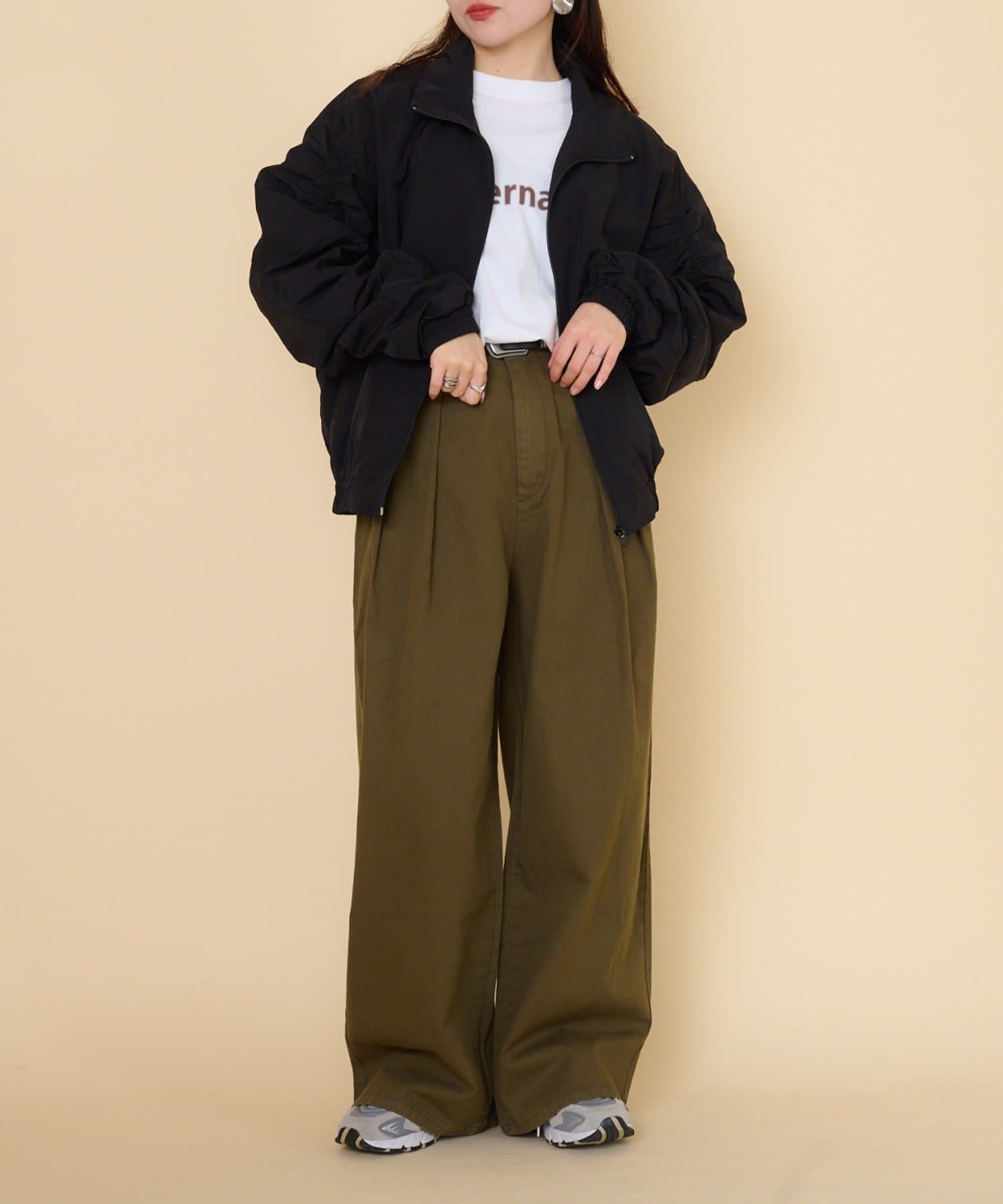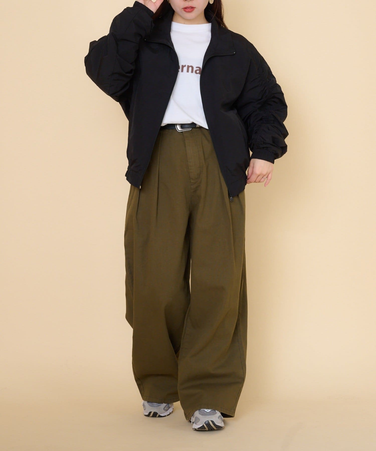 袖のギャザーがコーデのアクセントになり、スポーティーすぎない印象に。