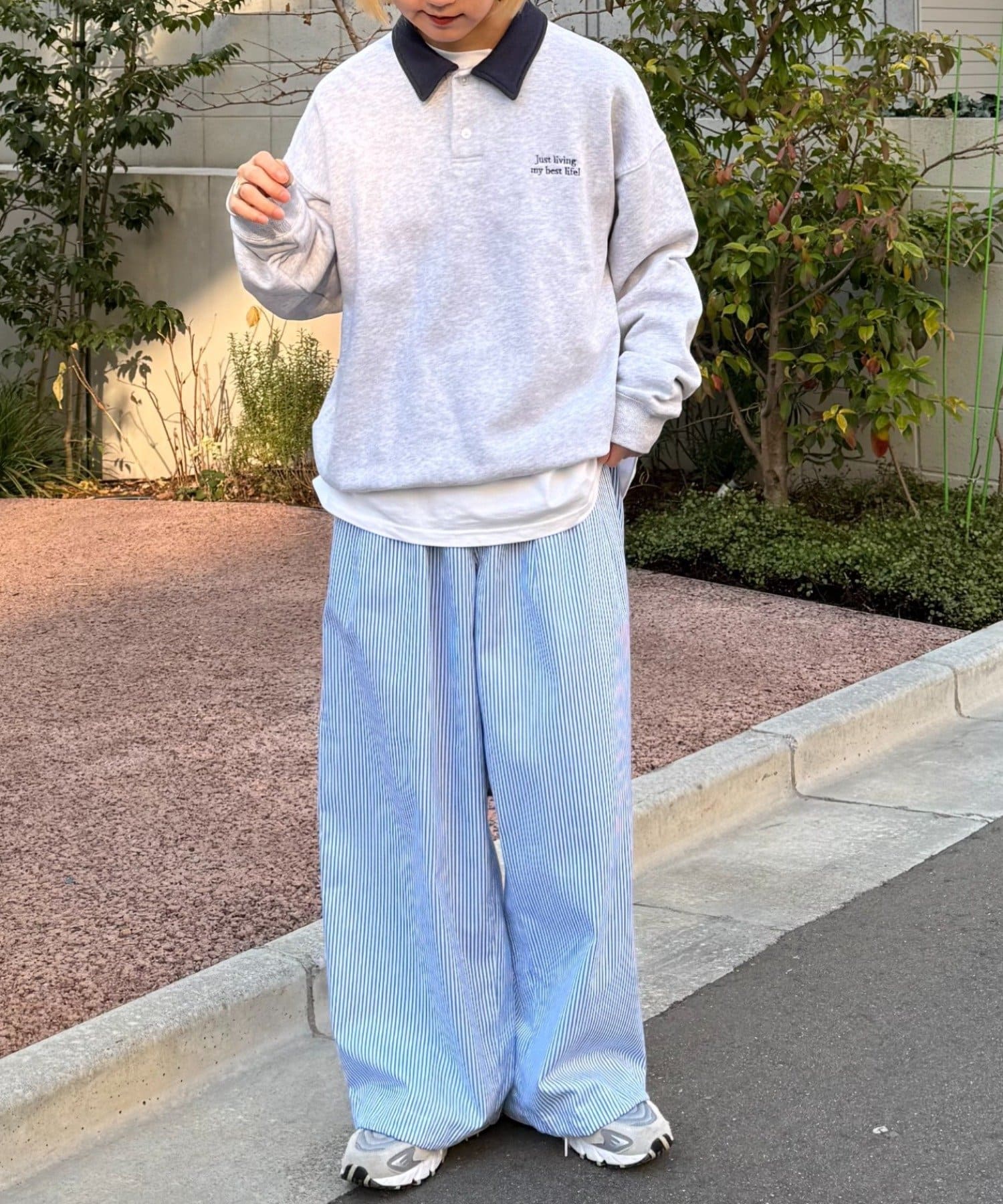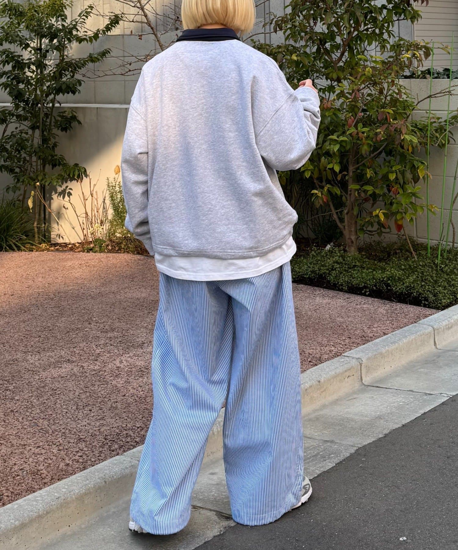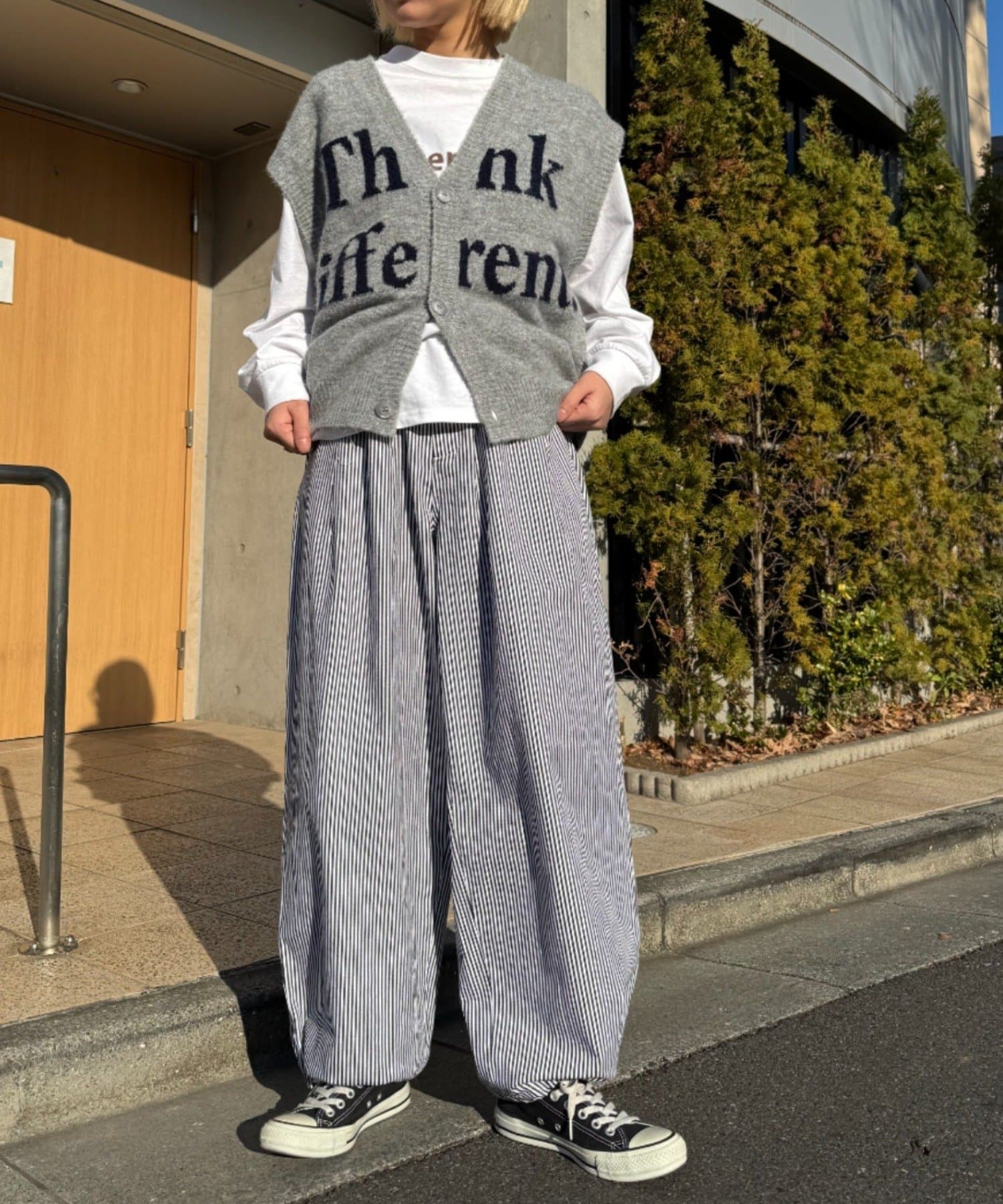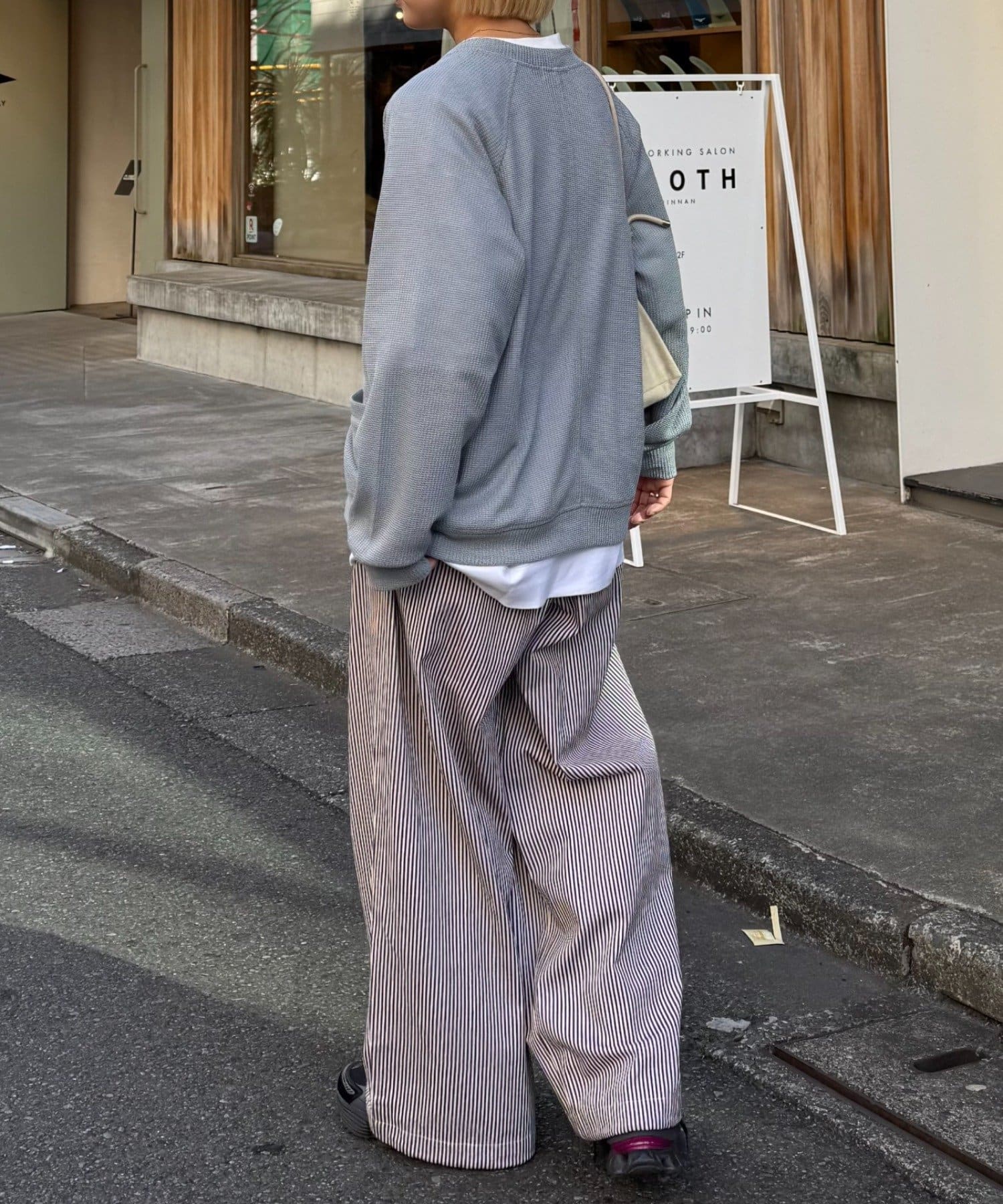 細やかなストライプ柄がスタイリングに表情をプラスするイージーパンツ