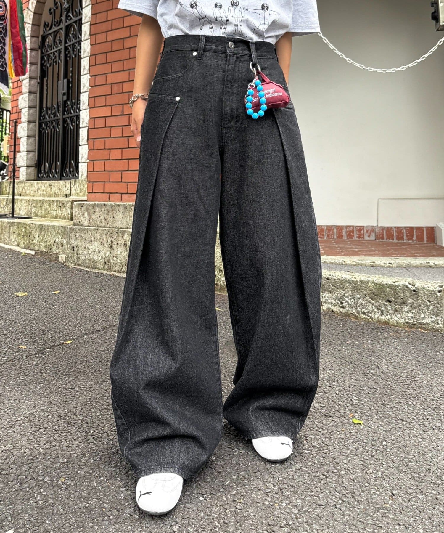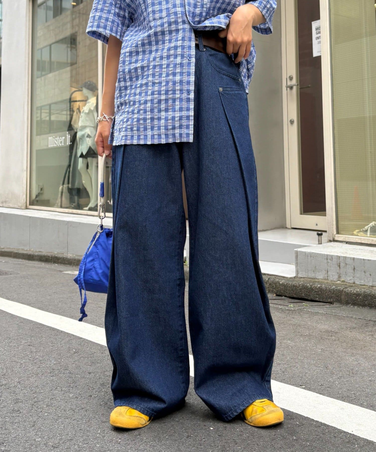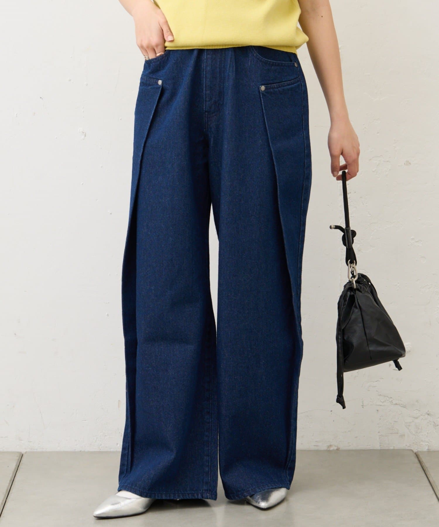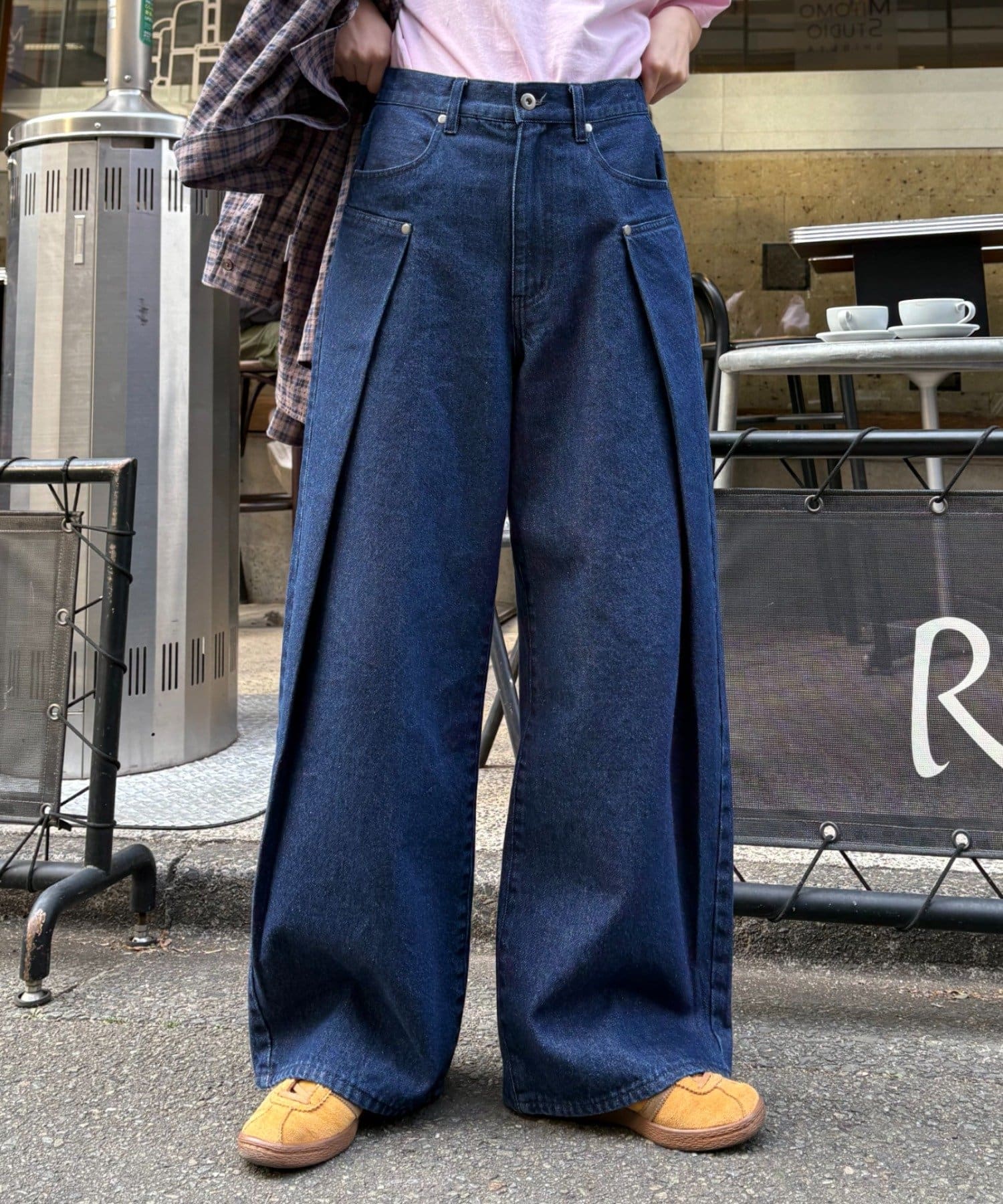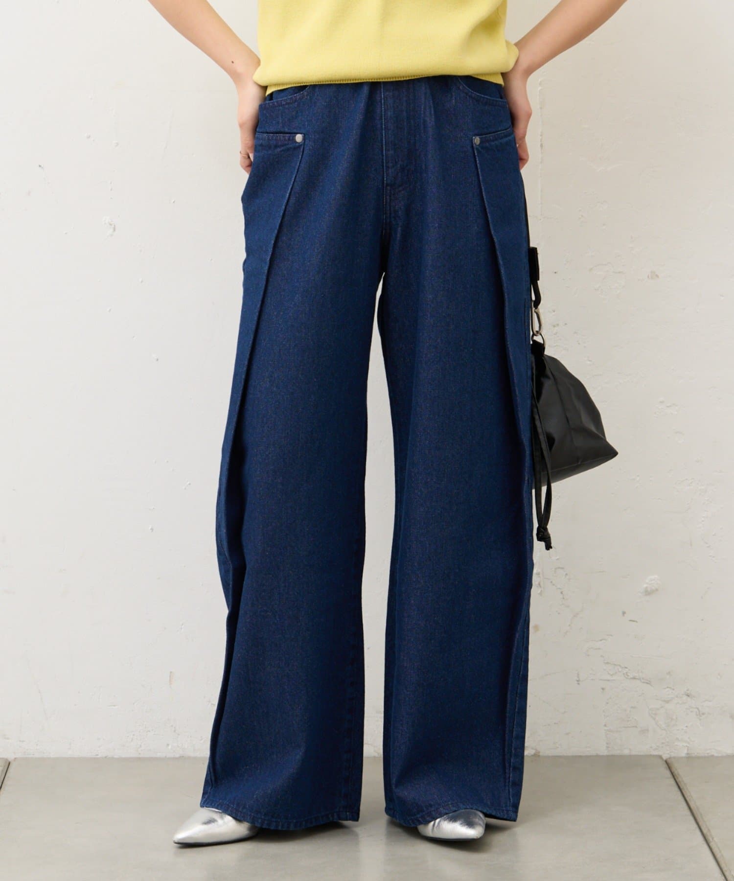 太もも部分から入ったタックがおしゃれ見えするデニムパンツが登場。