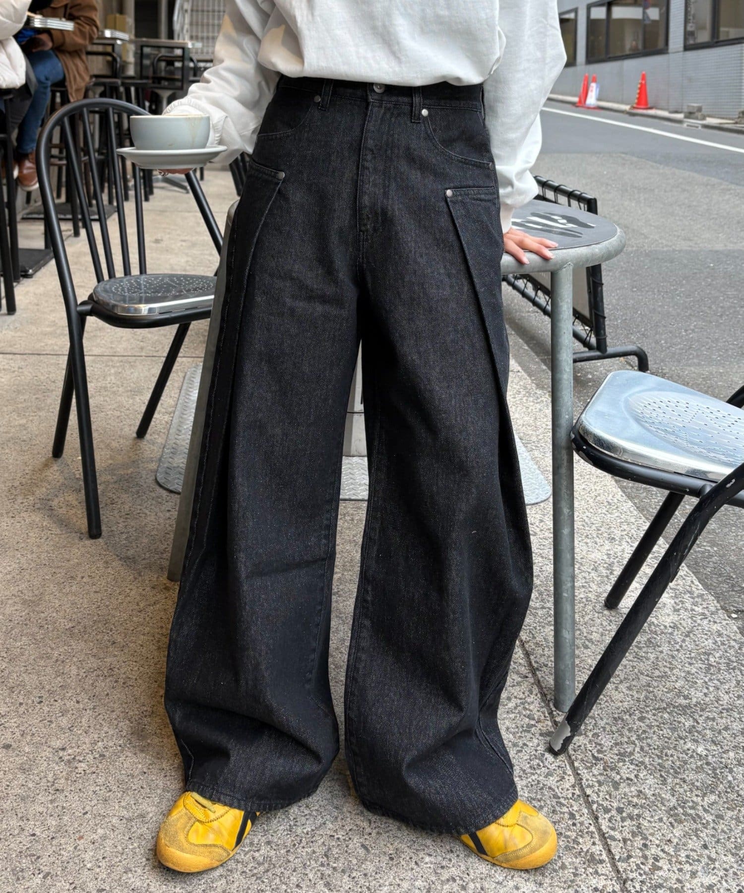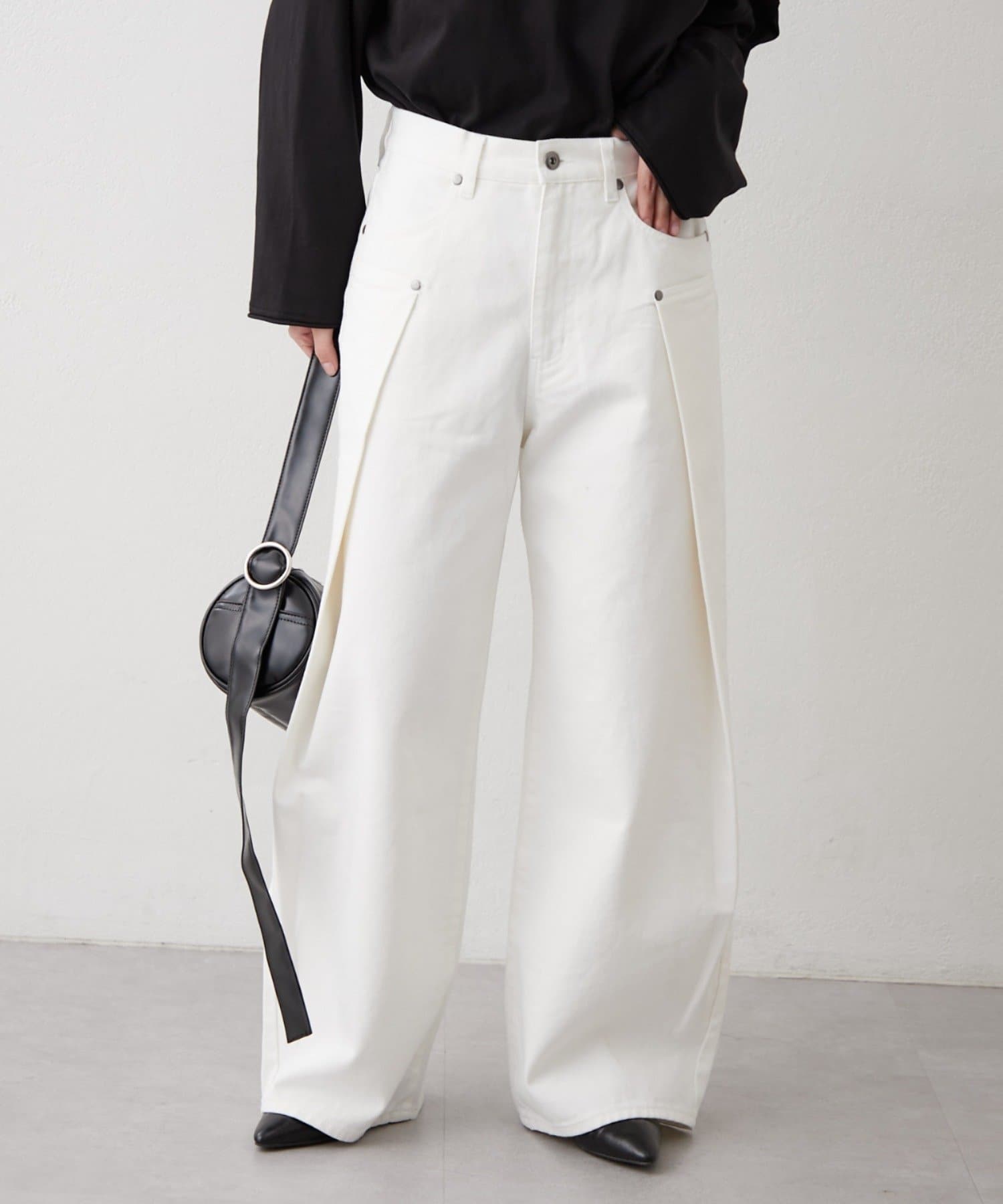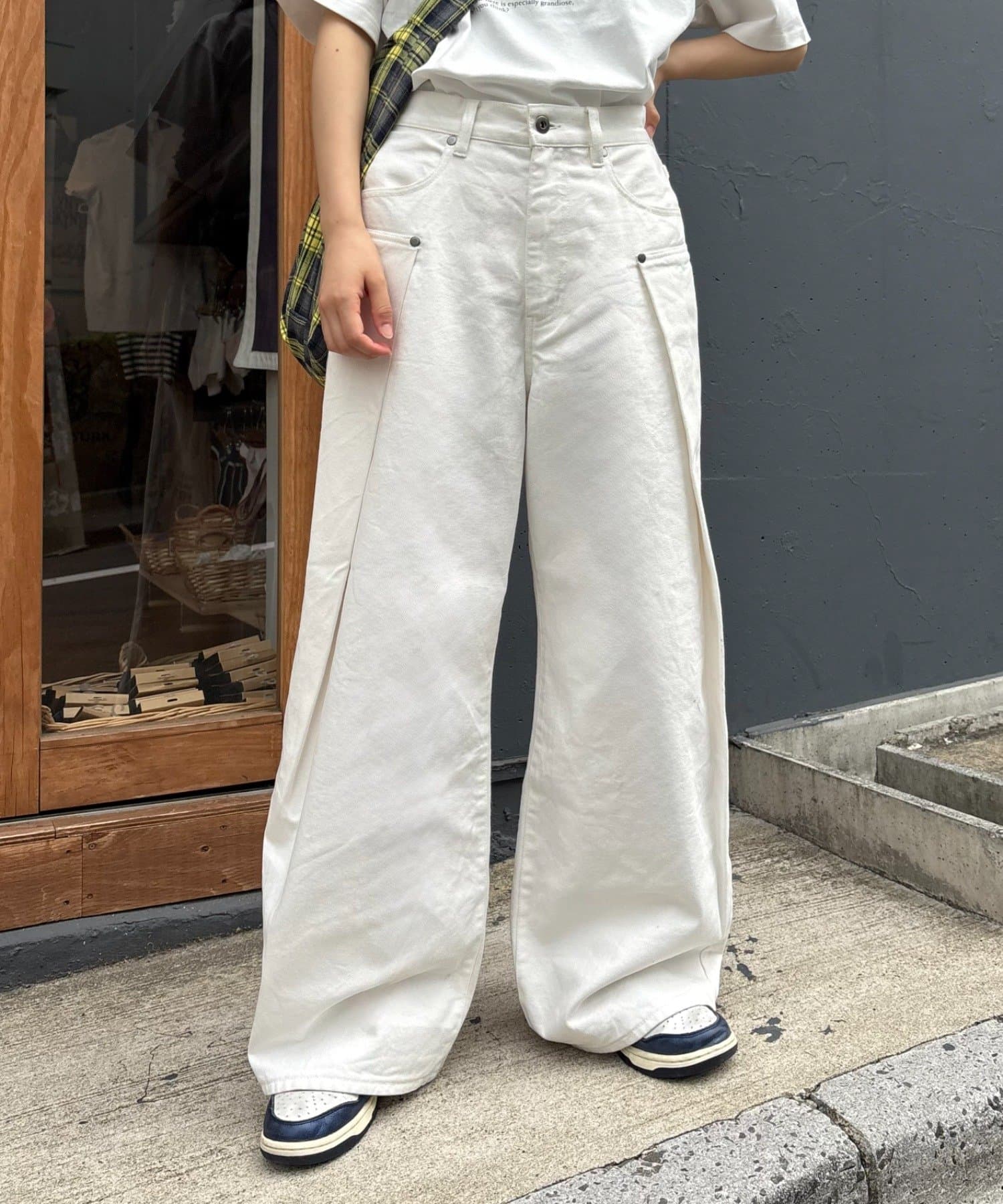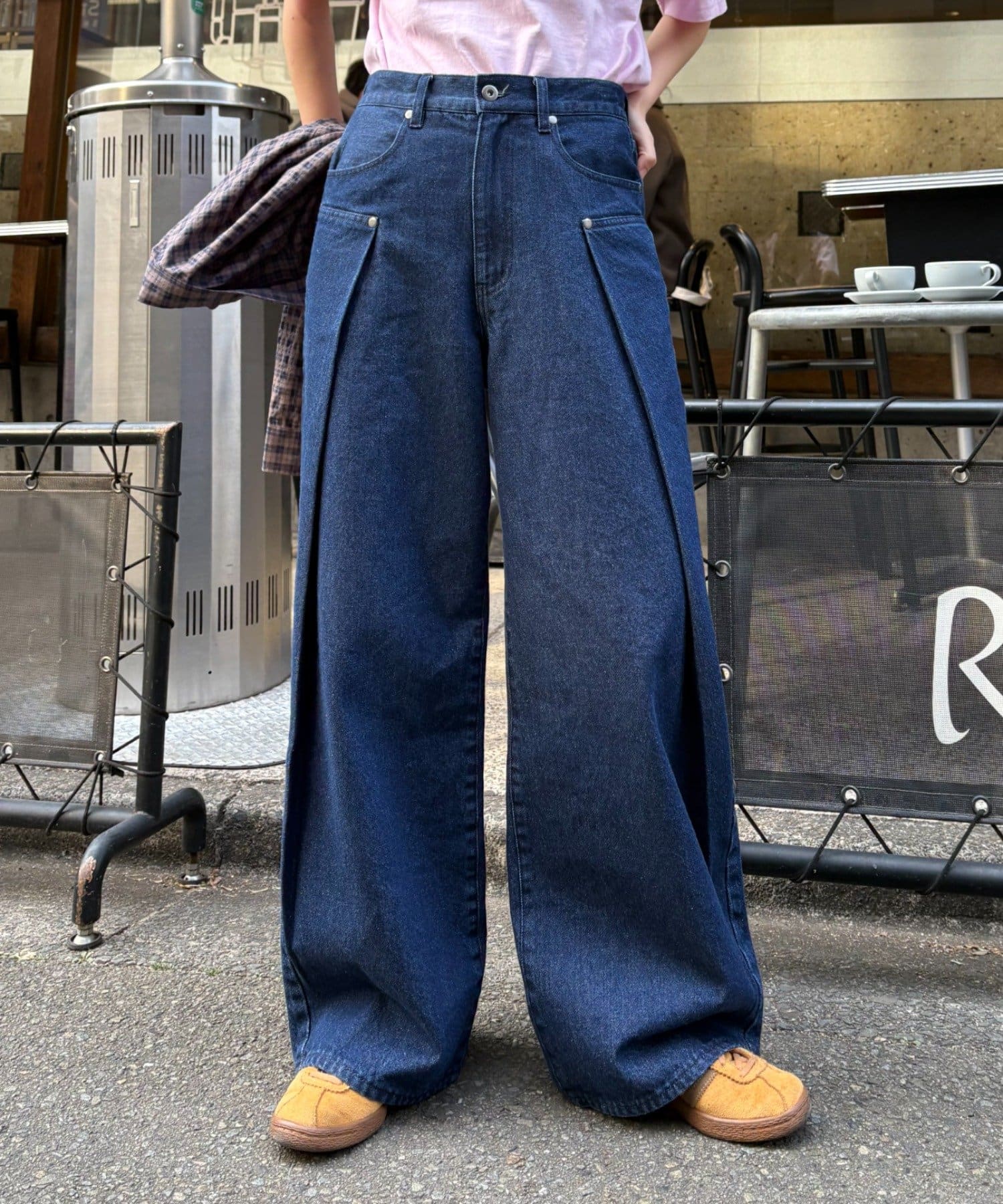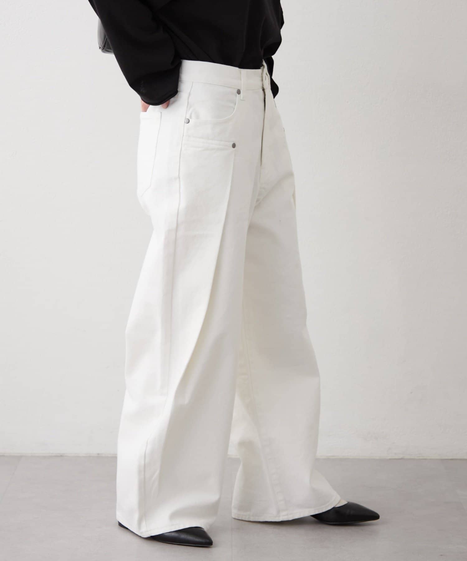 太もも部分から入ったタックがおしゃれ見えするデニムパンツが登場。