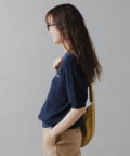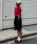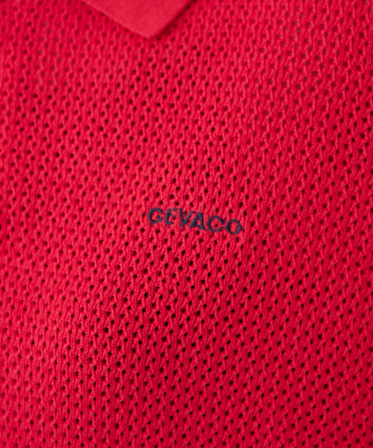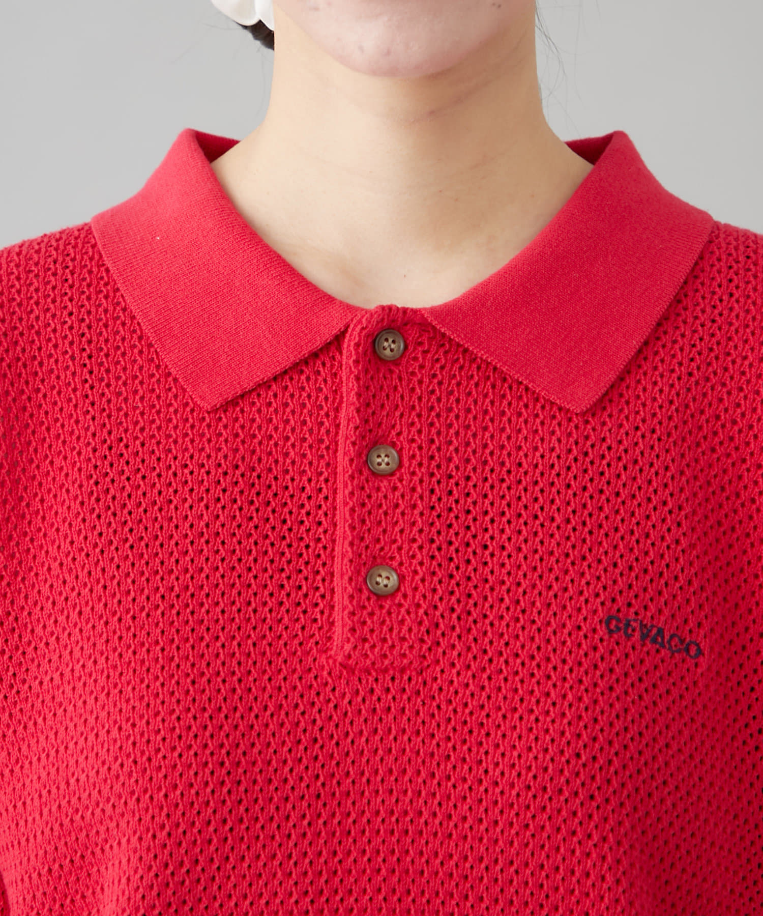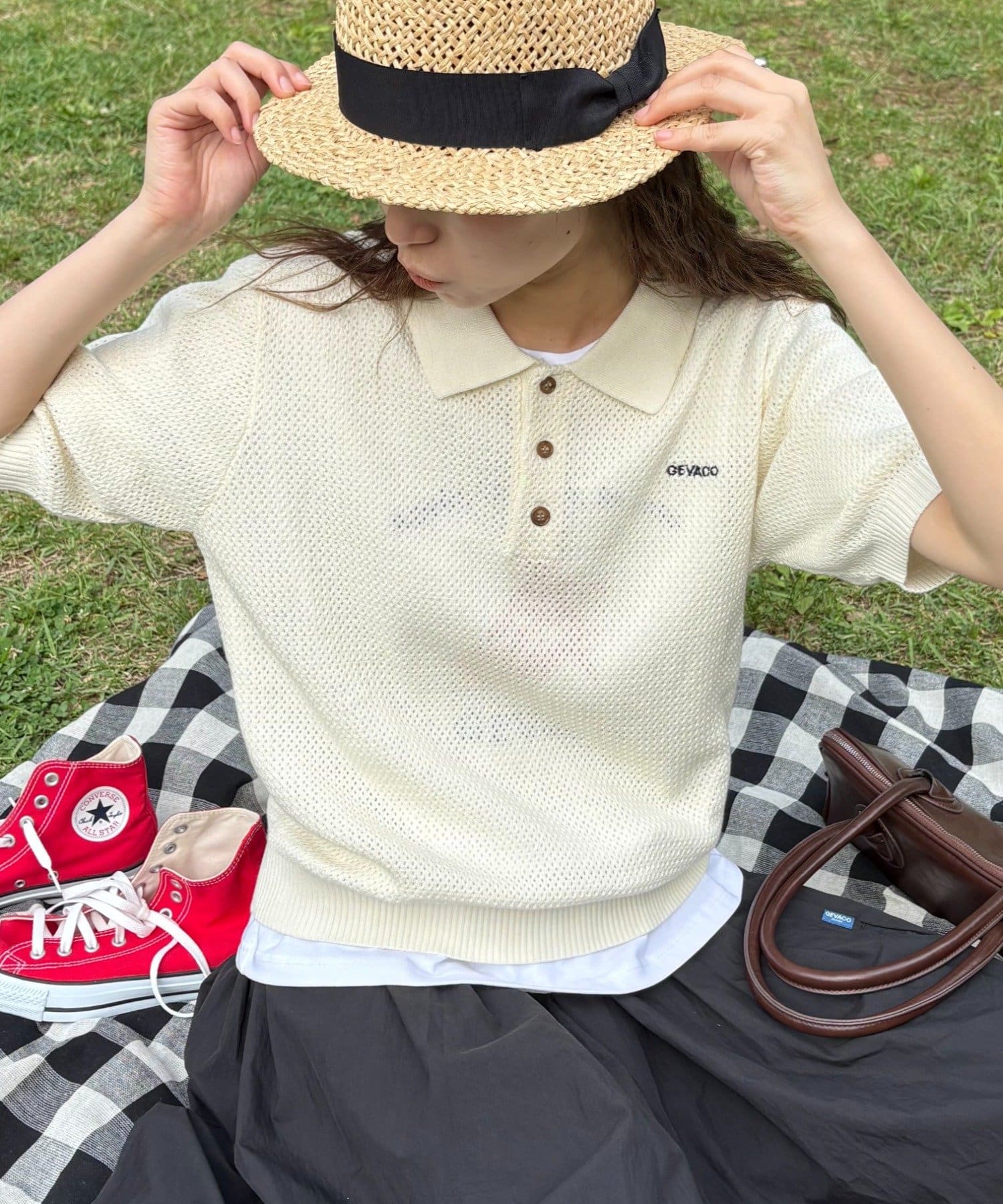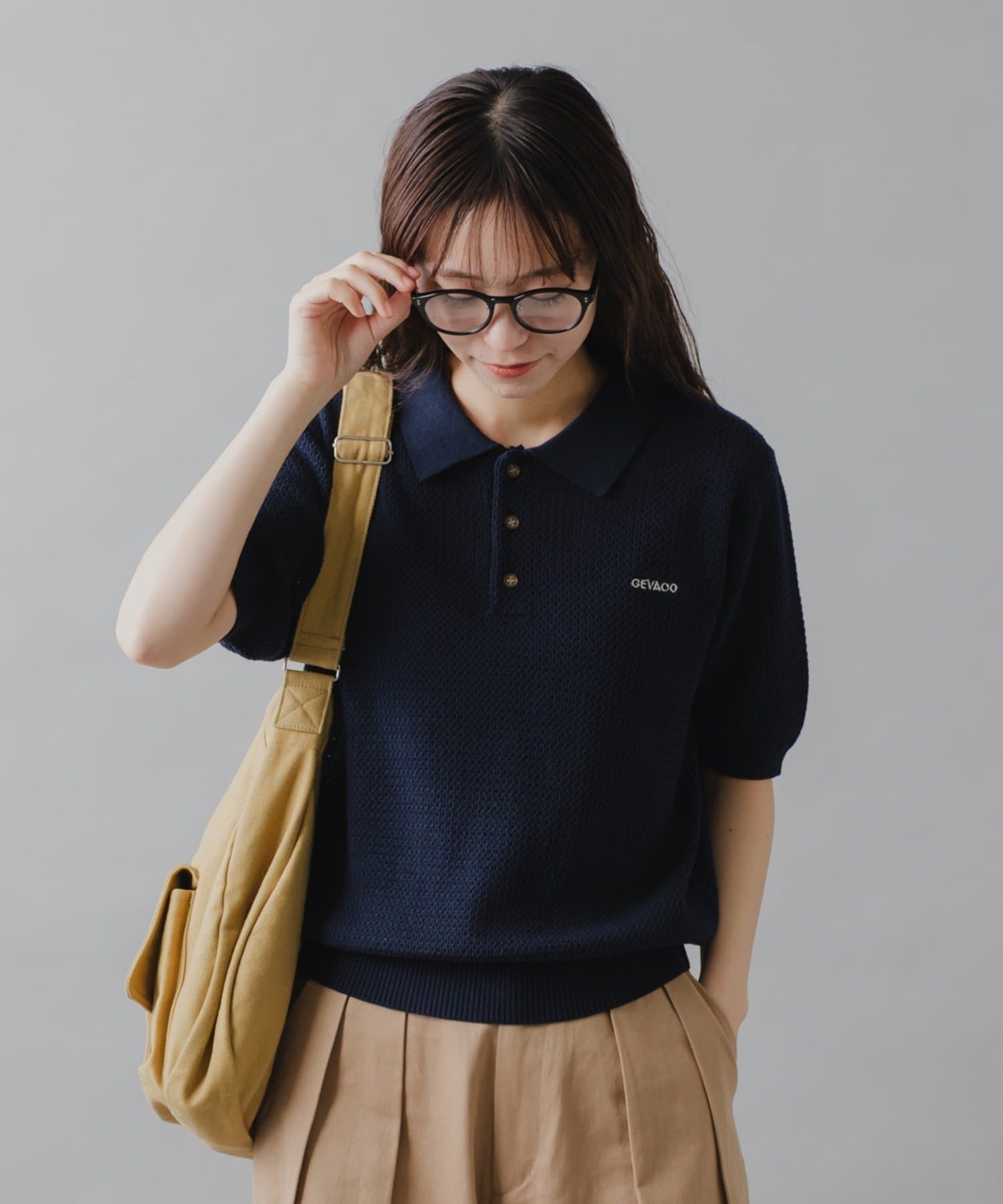 主張しすぎない胸元の”GEVACO”ロゴが、女性らしい印象に。