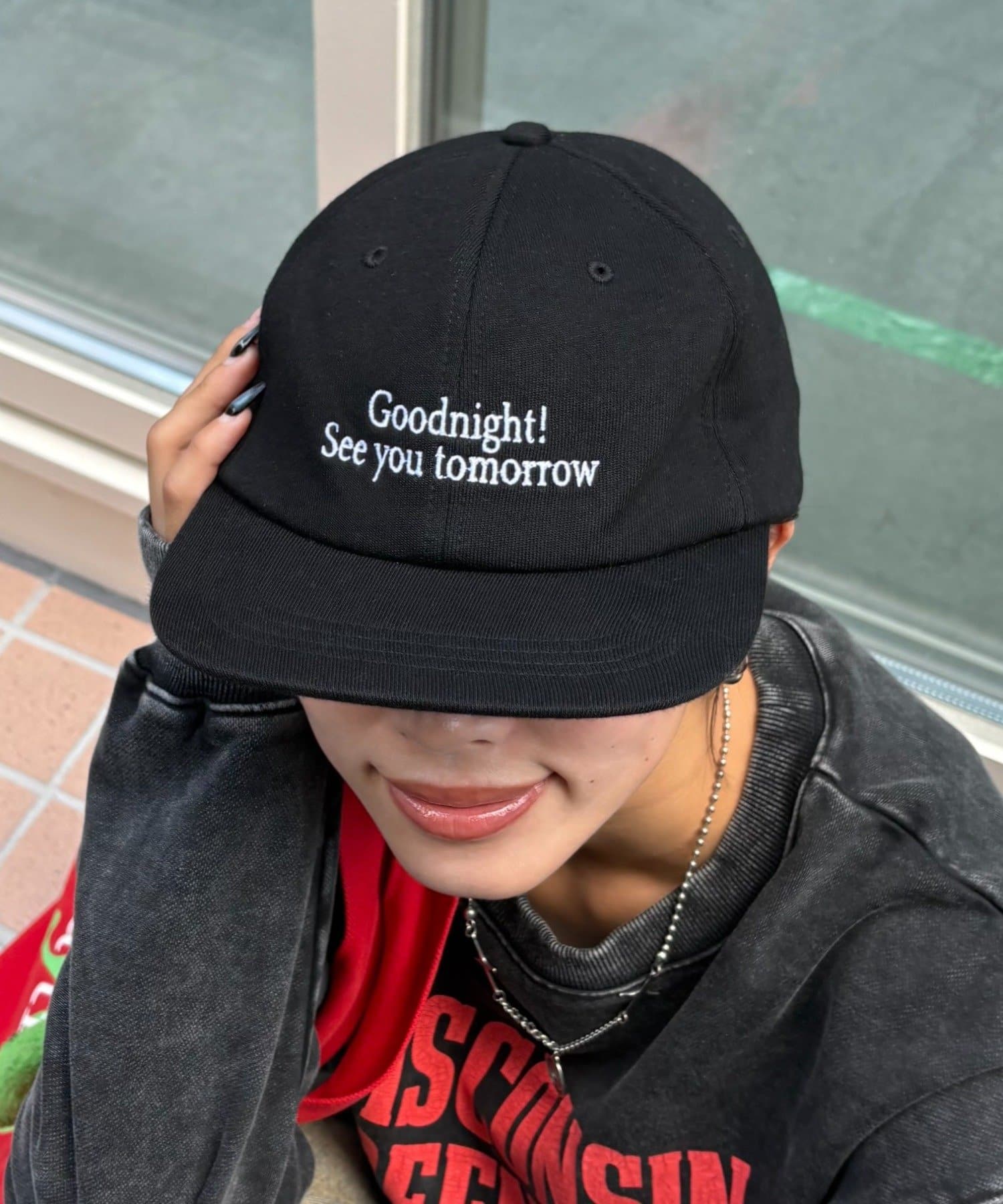 大きすぎないロゴで、コーデに馴染みやすいのが嬉しいポイント◎