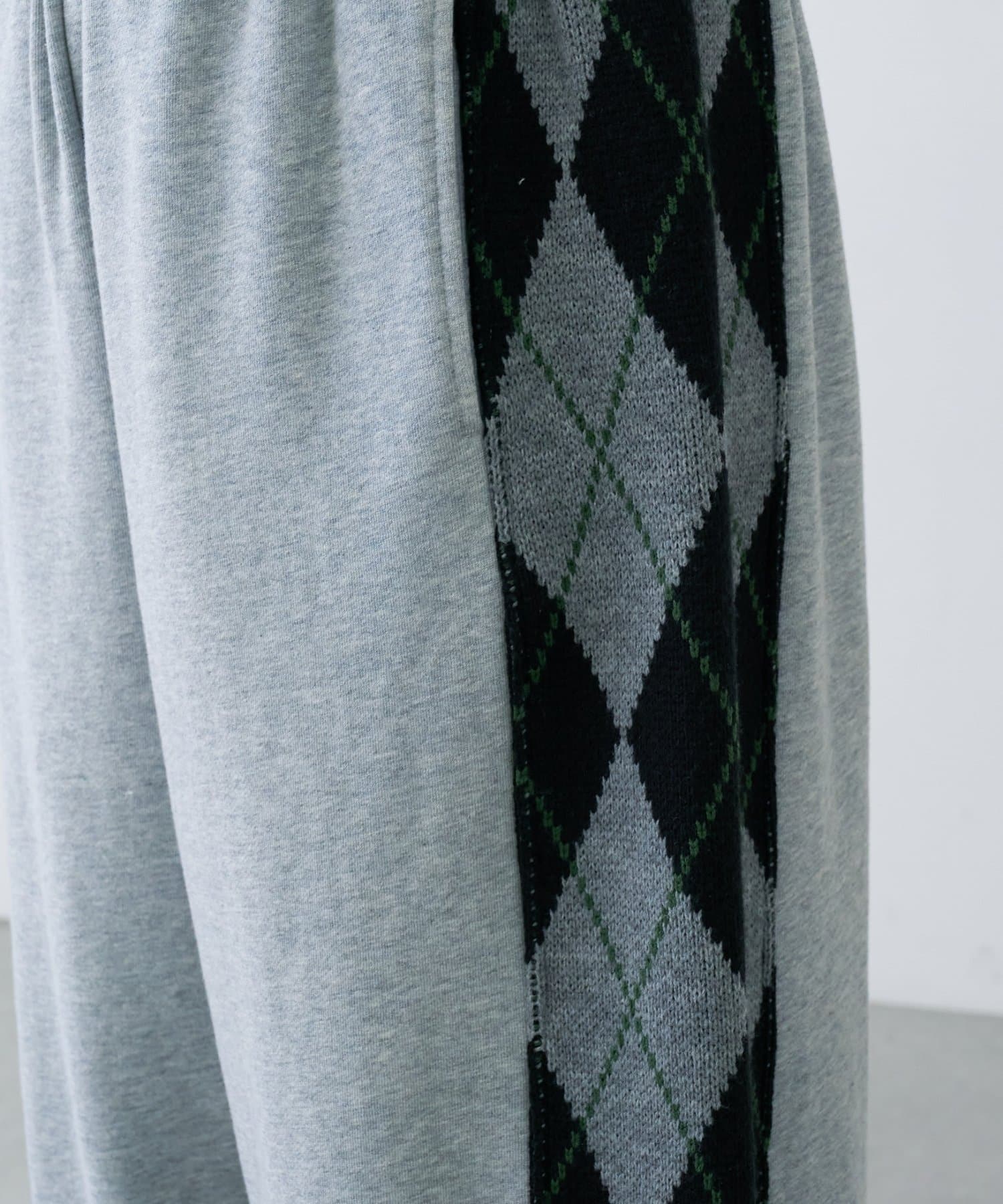 サイドに大胆にあしらわれたアーガイル柄が目を引くスウェットパンツ。