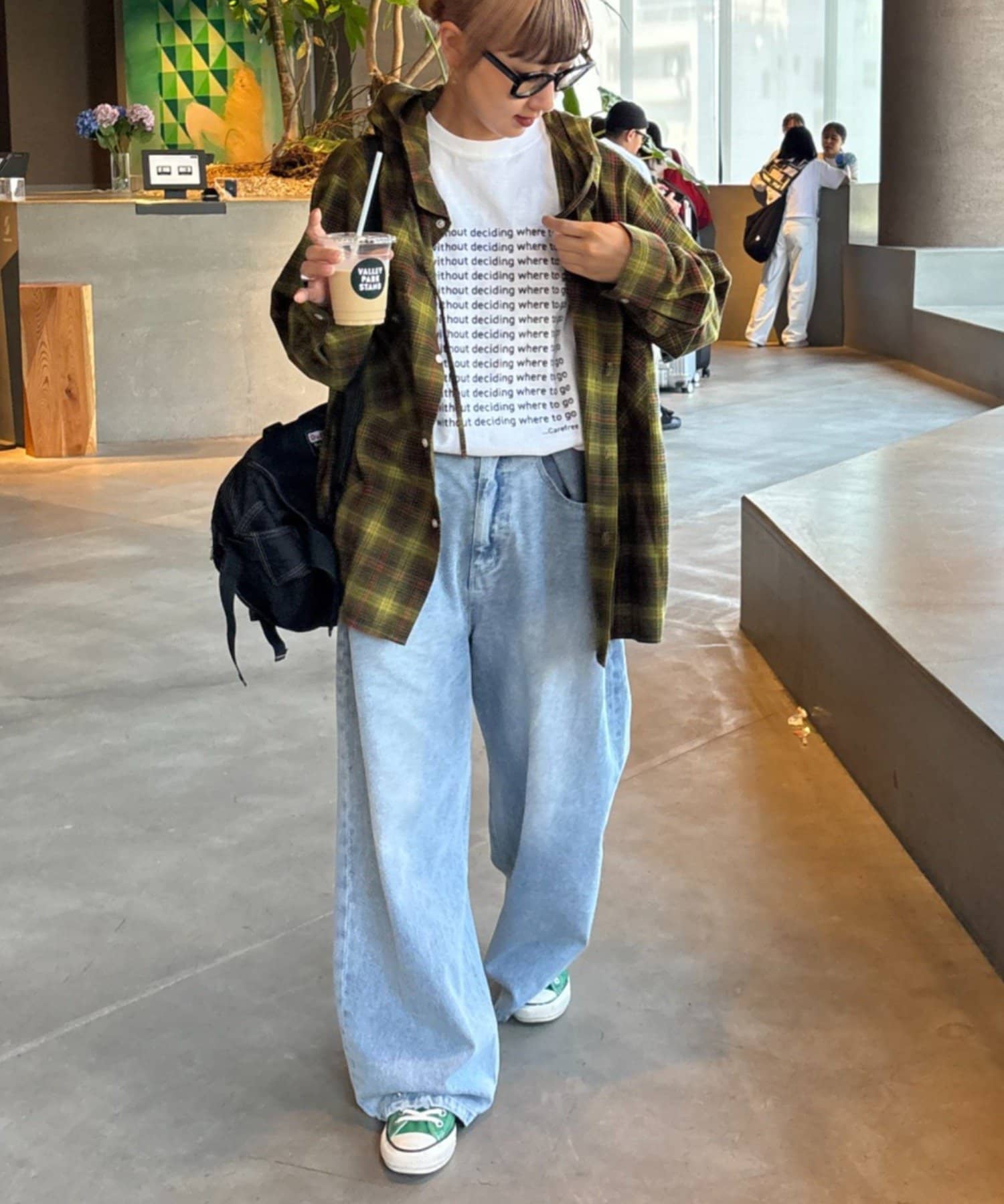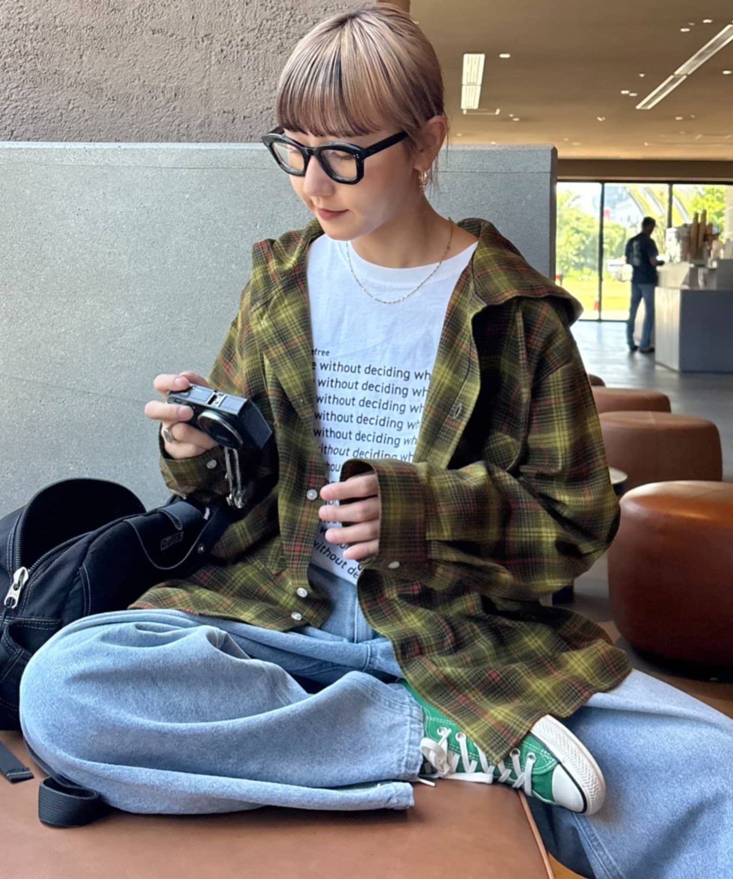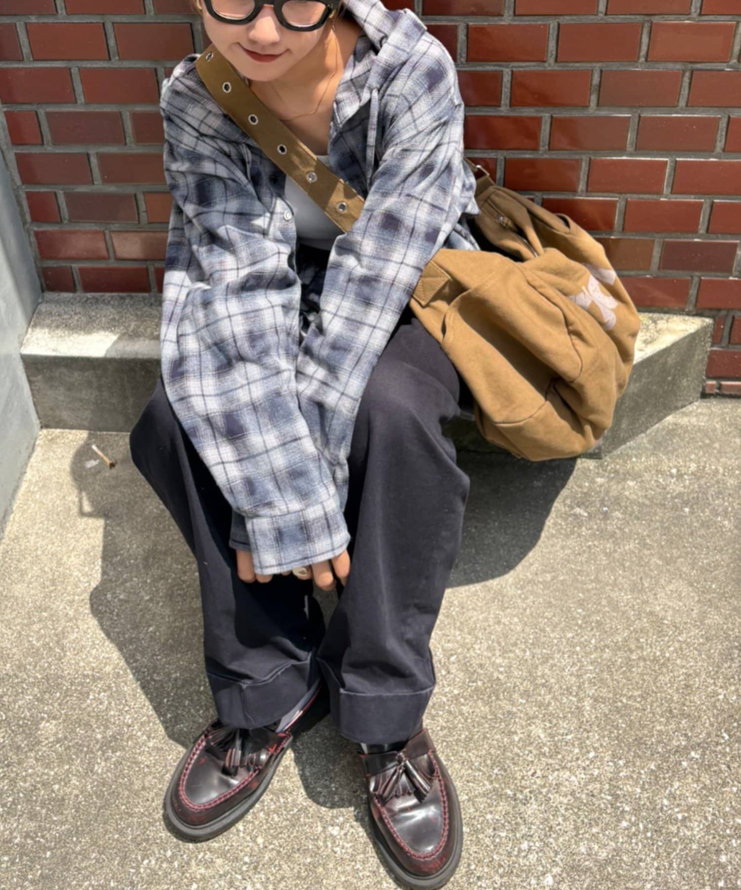 また、チュニックをインナーに着て、裾からのぞかせたレイヤードコーデは可愛らしい印象に。