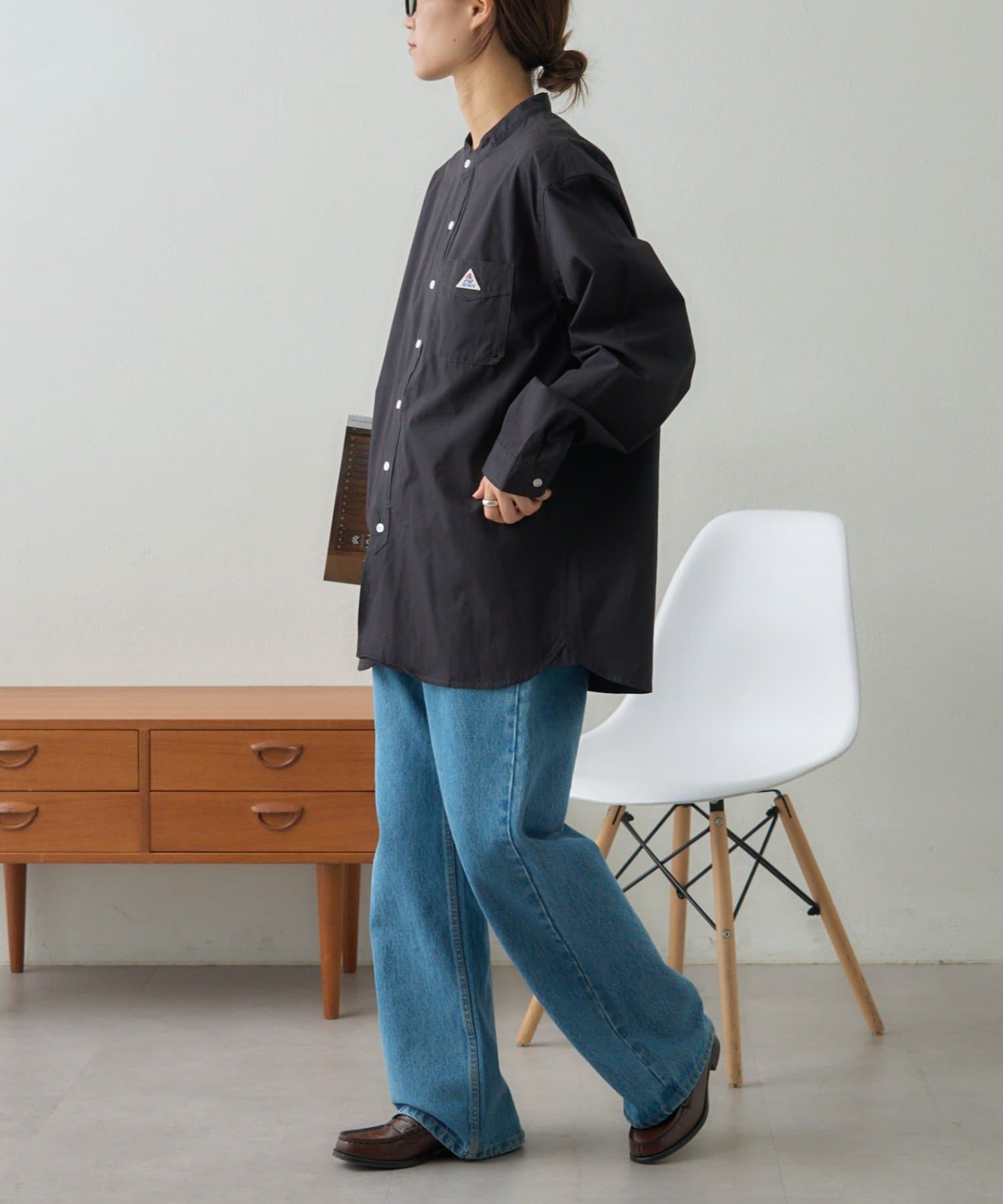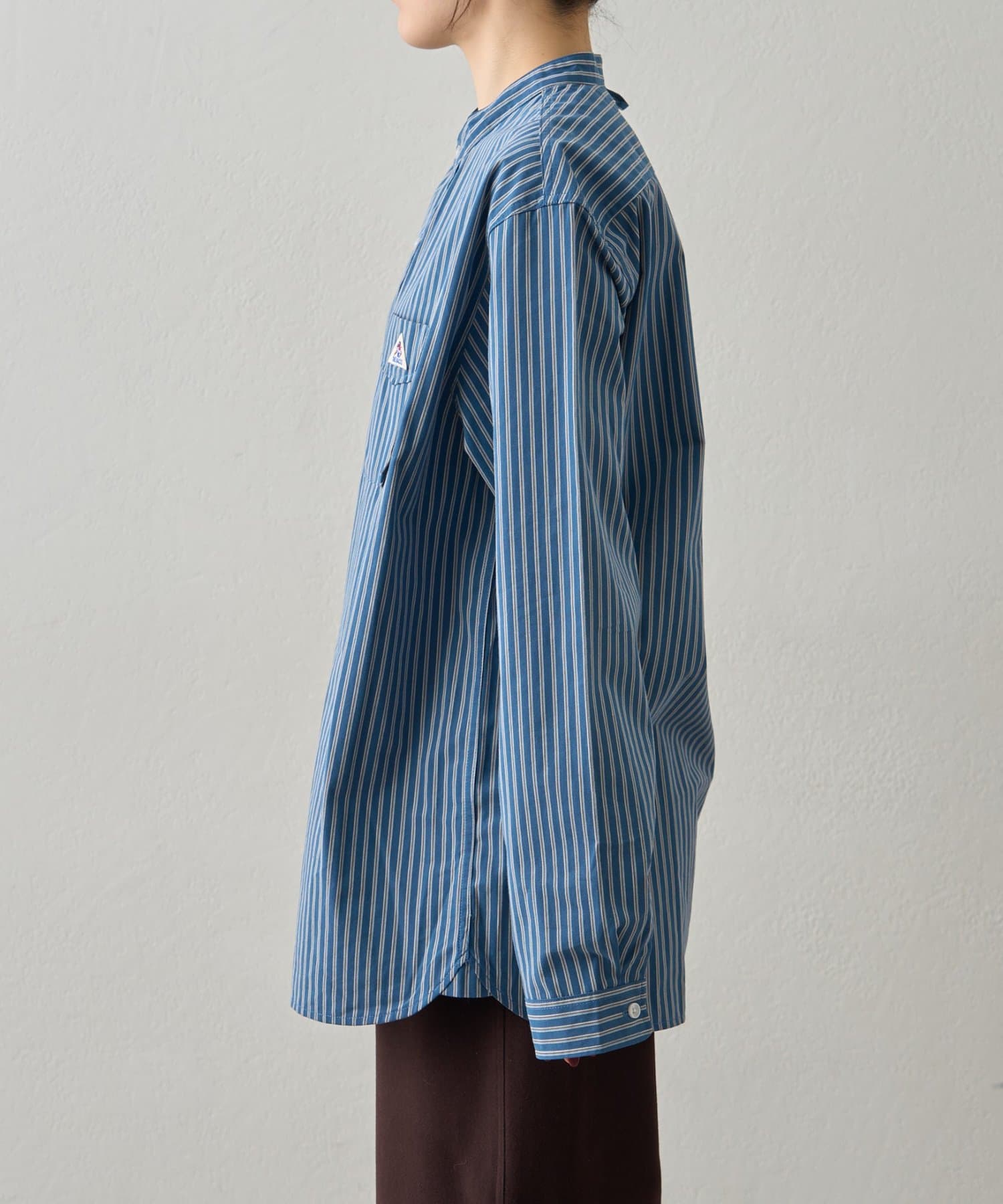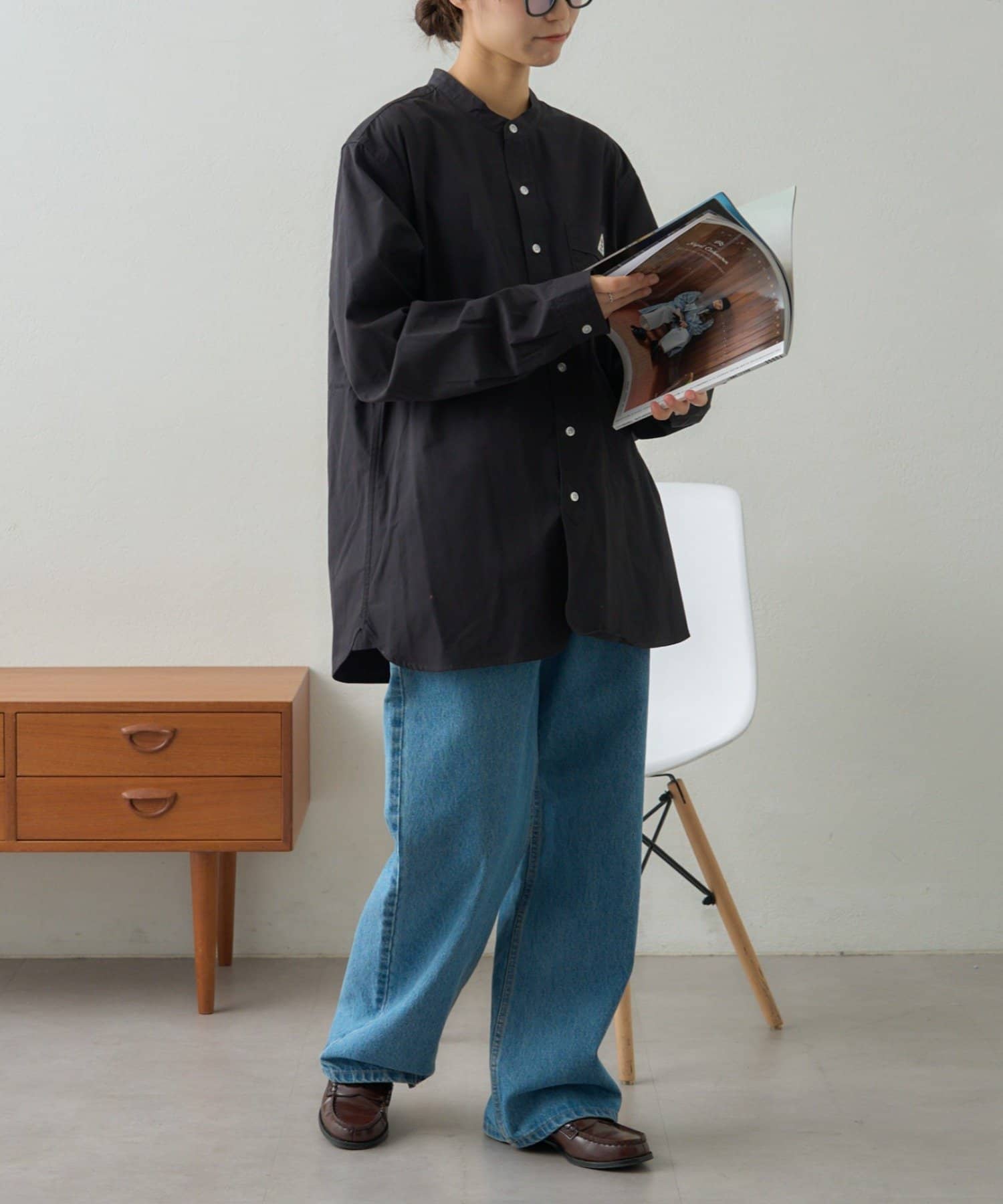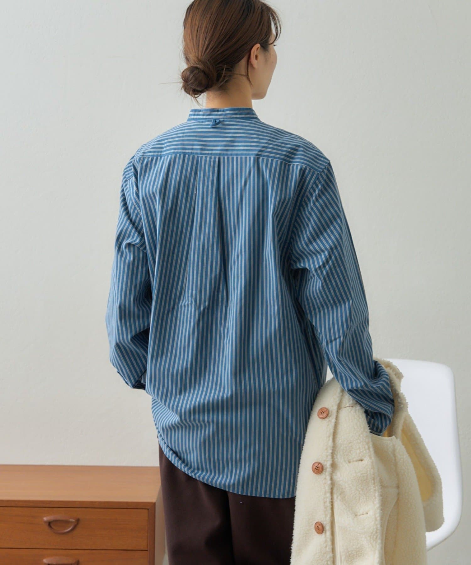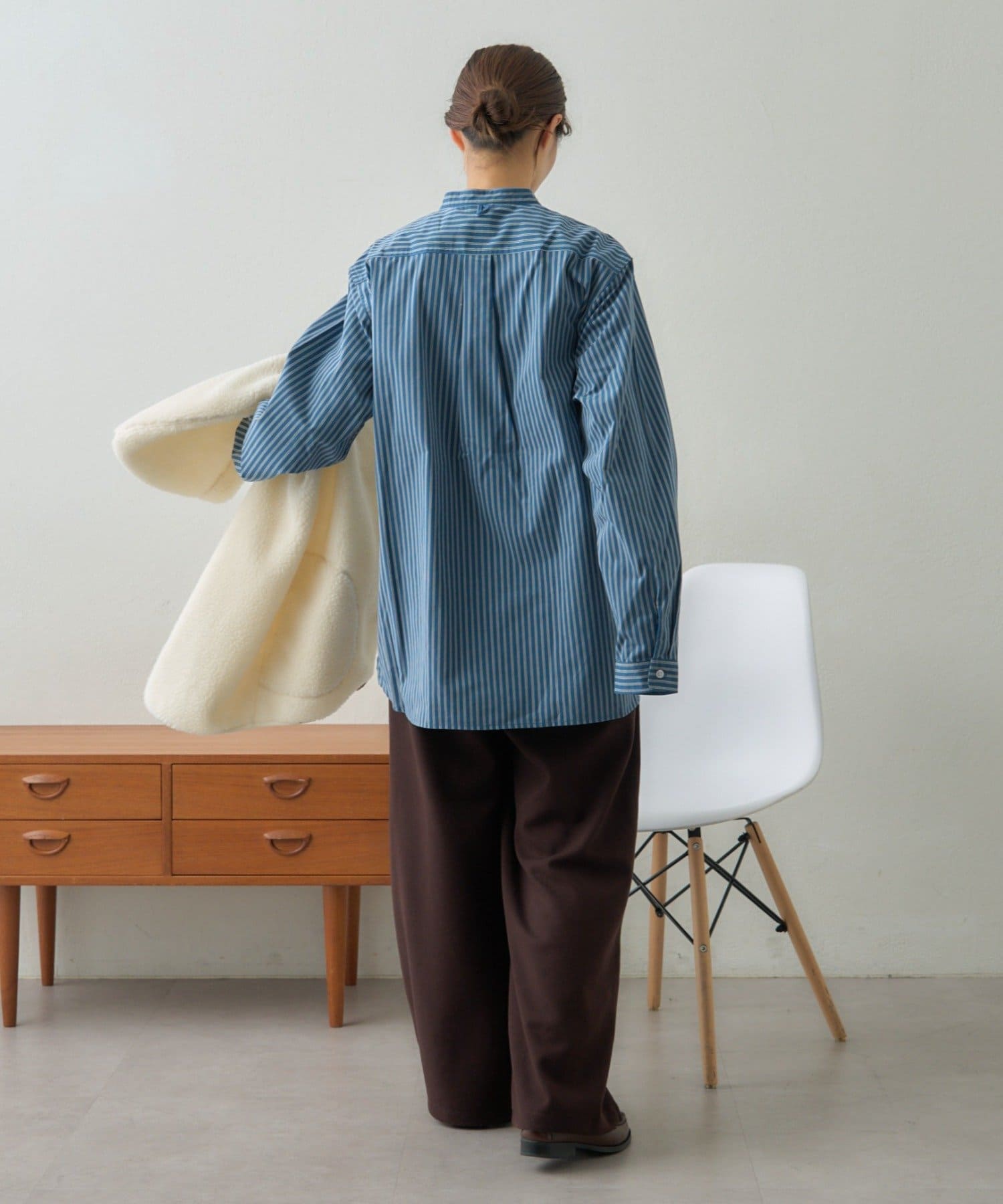 首元はすっきり見えするバンドカラーで、スタイリングにより馴染む仕様。