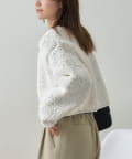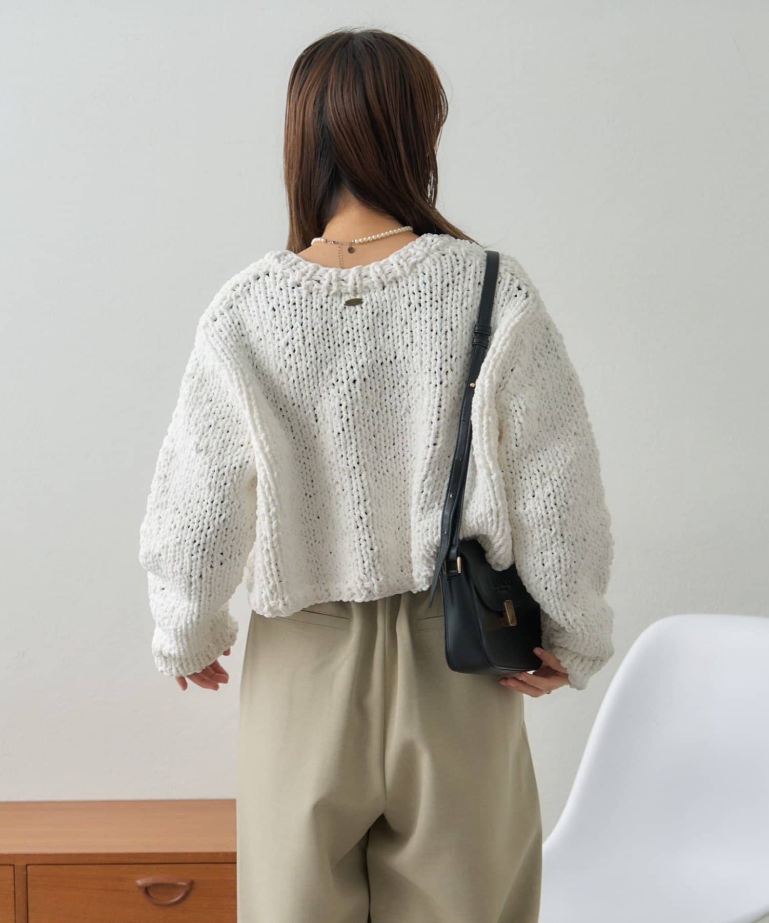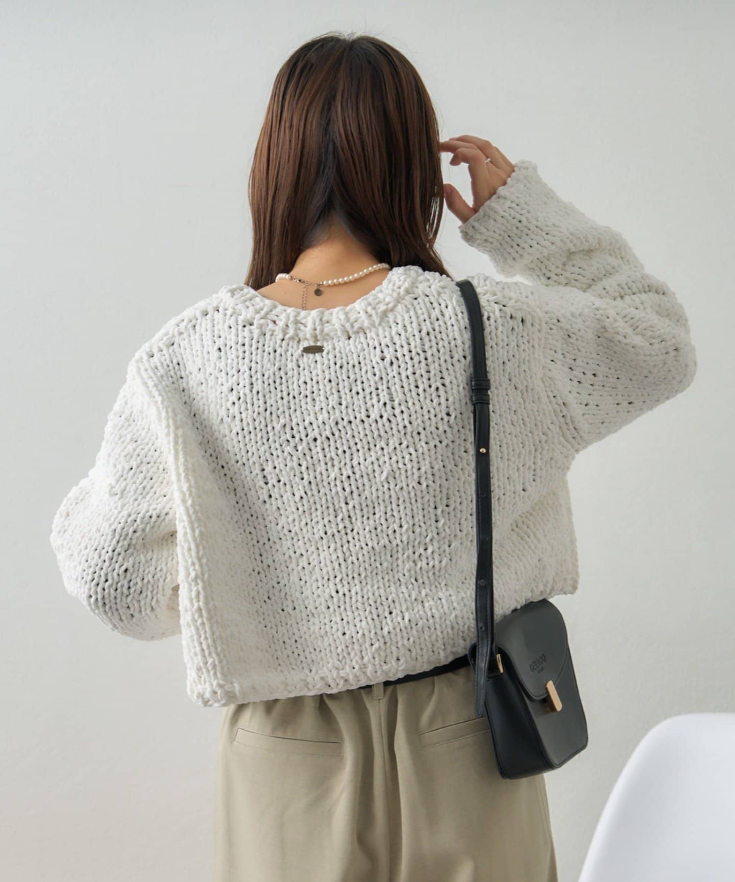 ざっくりとした太めの糸で編み立てた、存在感たっぷりのニットボレロ。