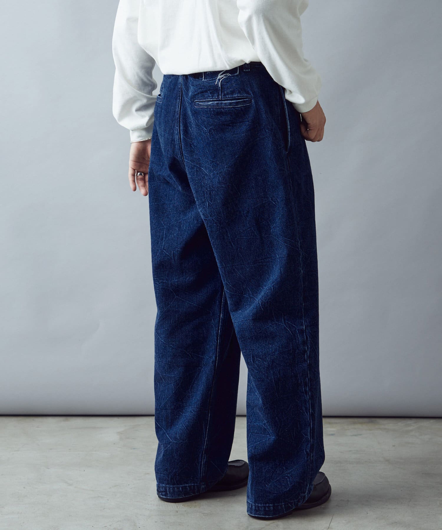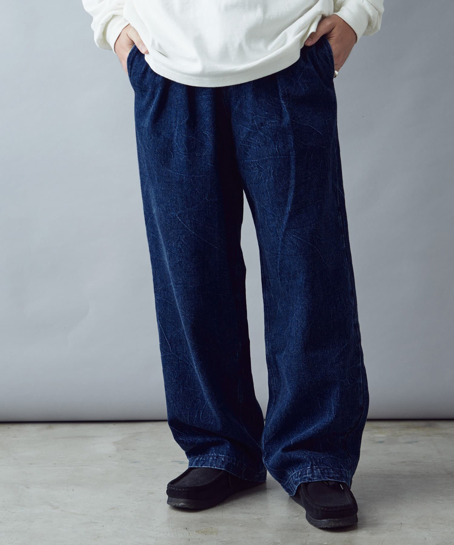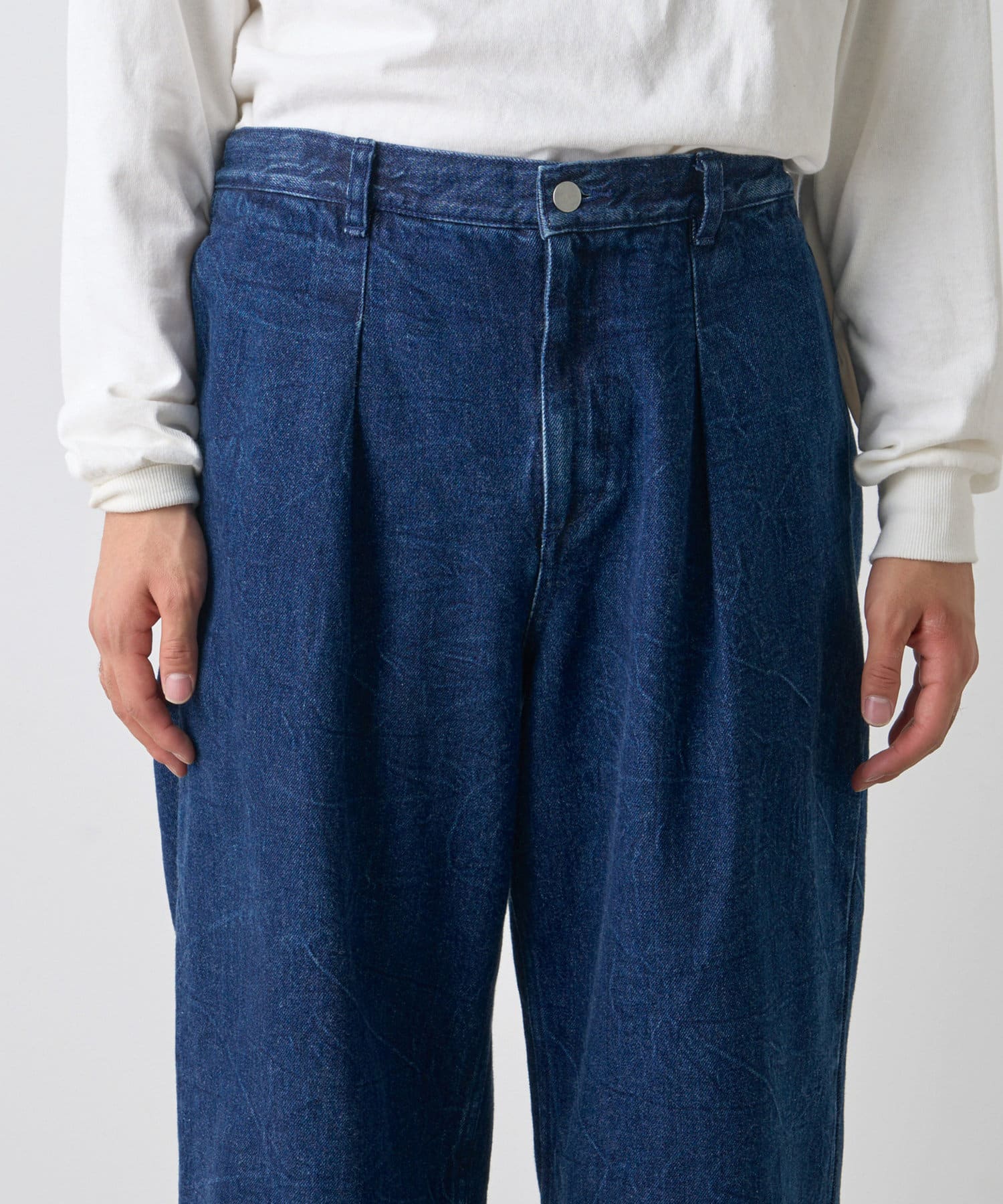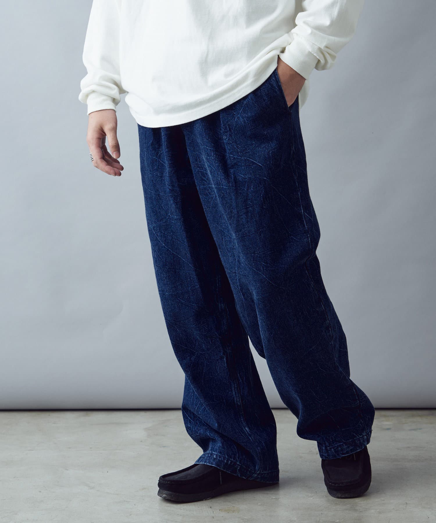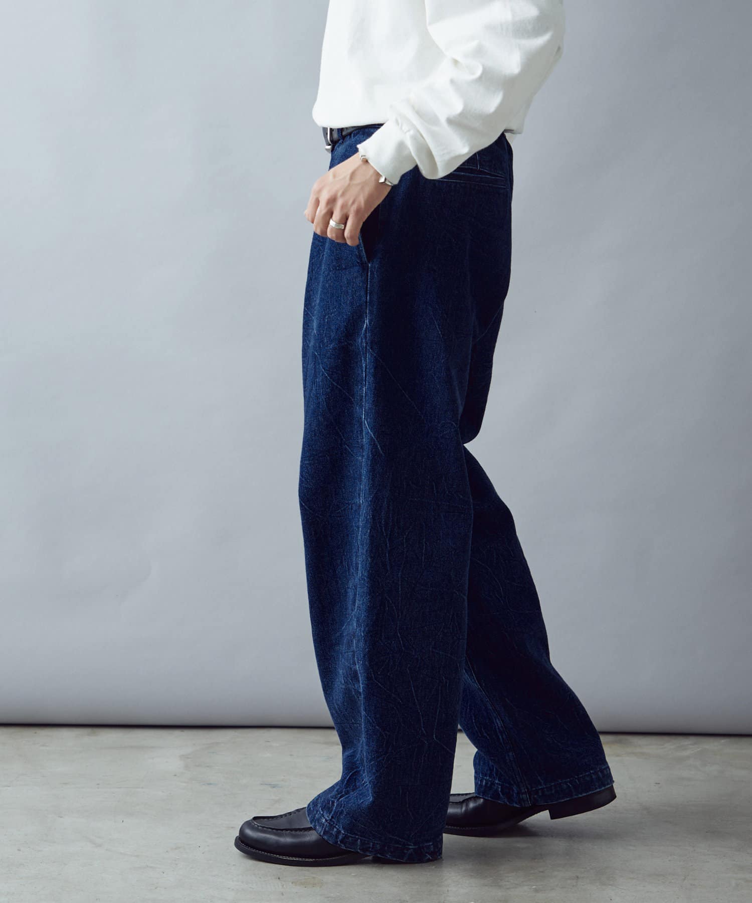 絶妙なヒビ加工のワイドデニム