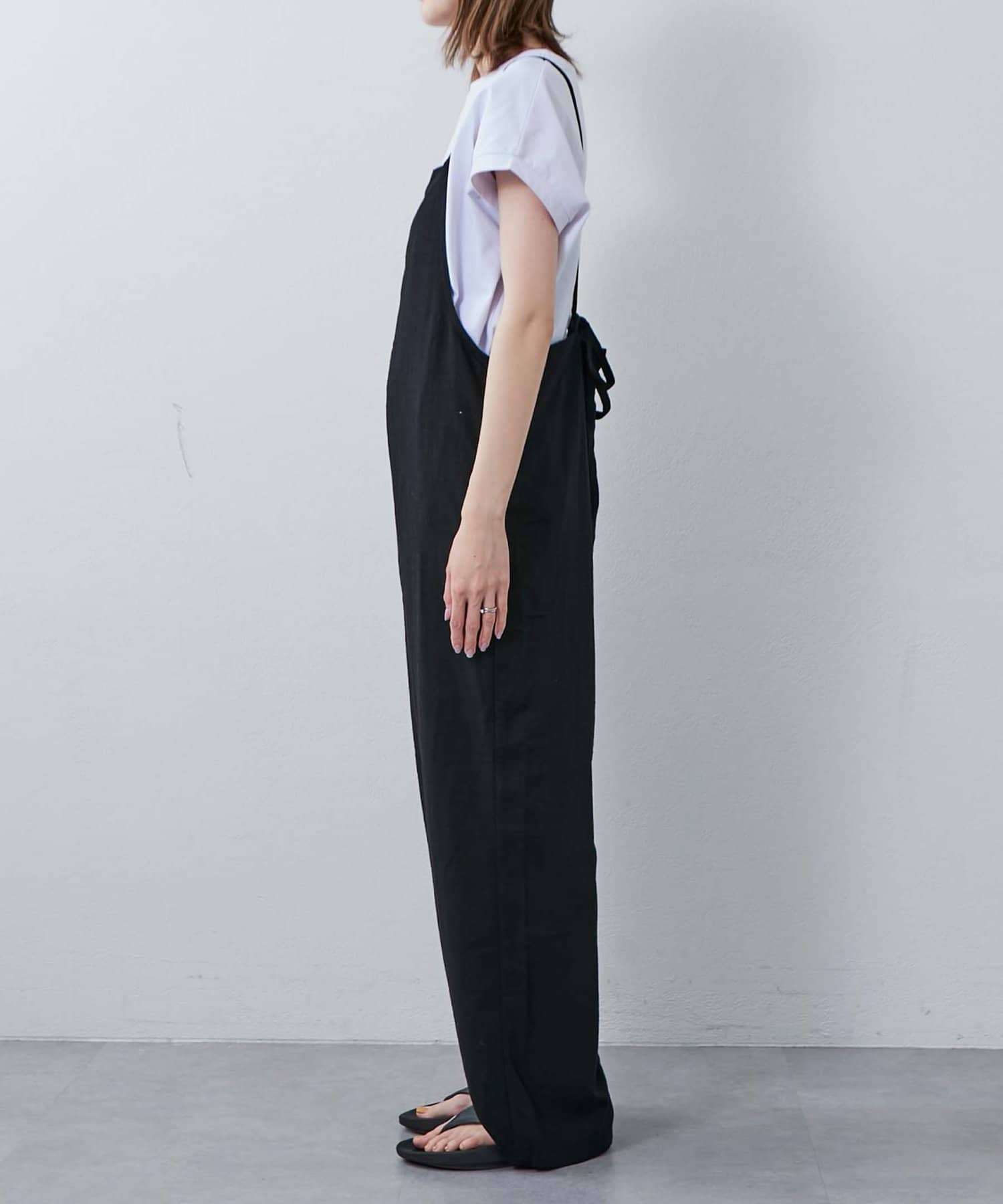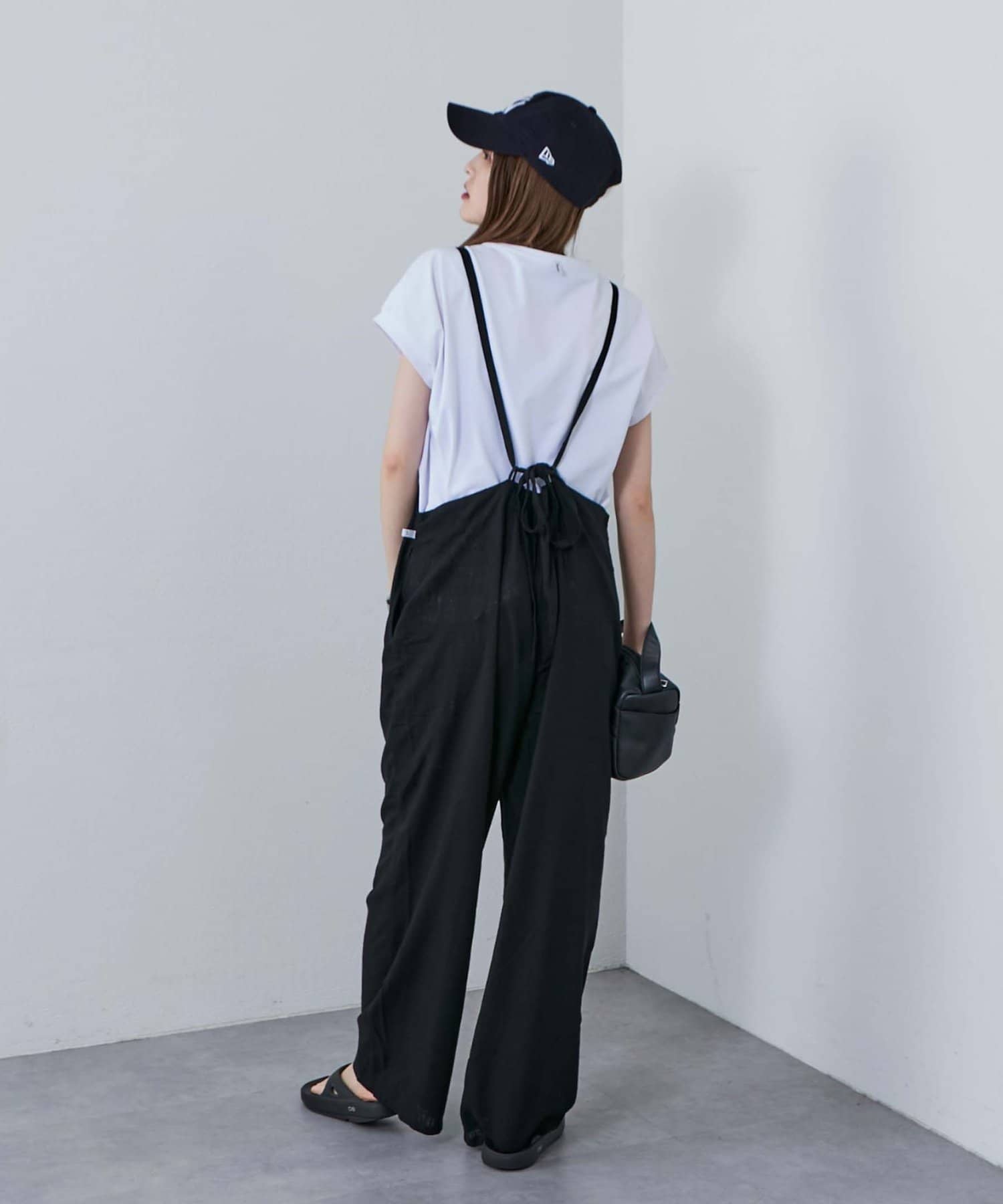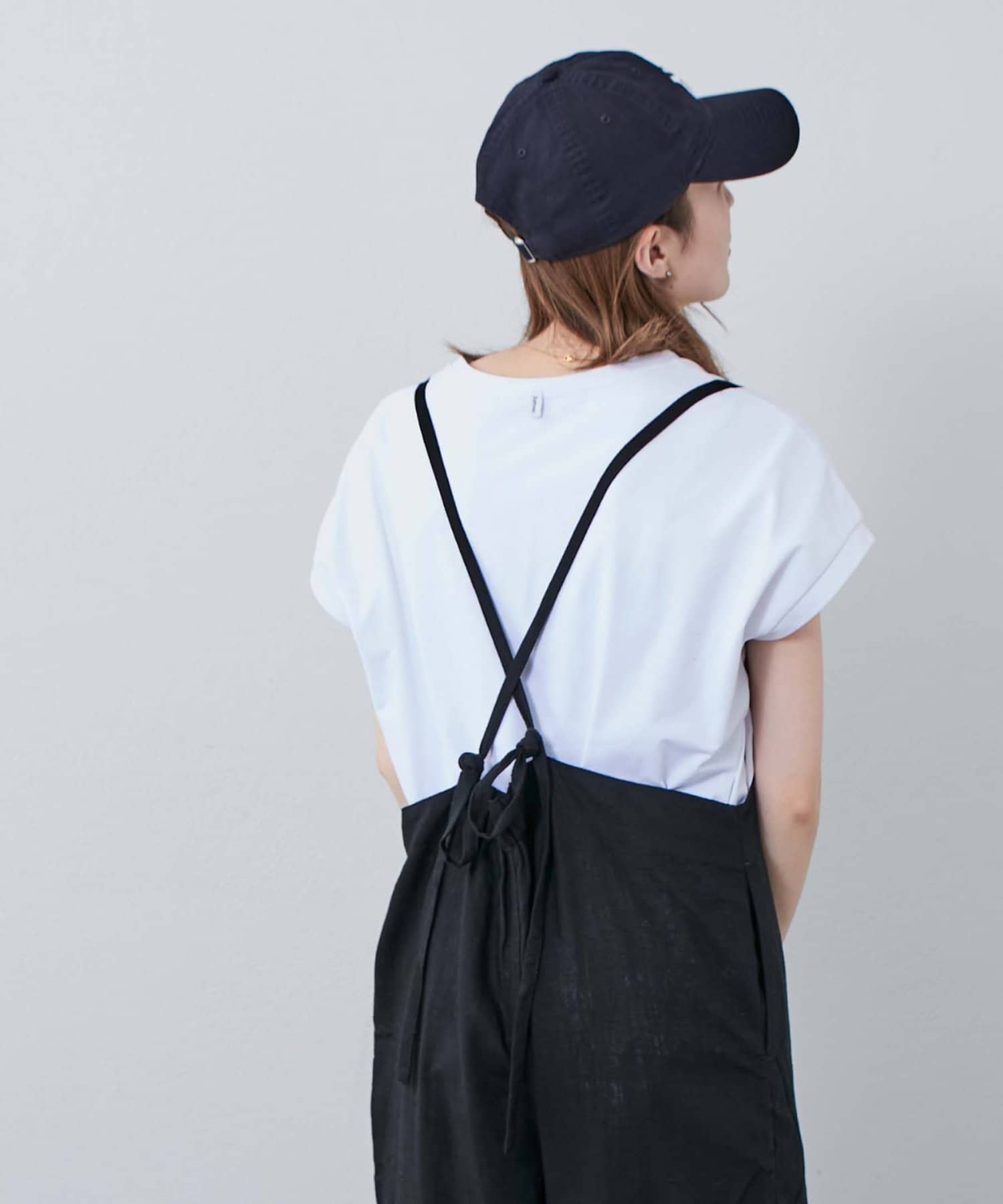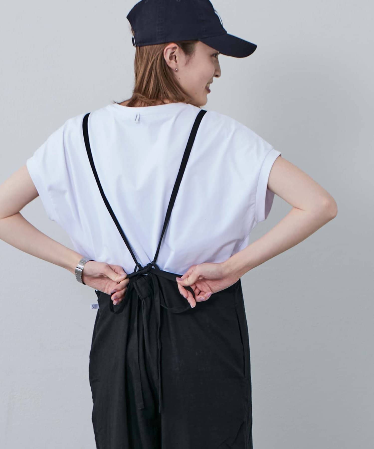 後ろの紐をクロスしたり、好みで結び方を変えてマルチに着られるサロペット。