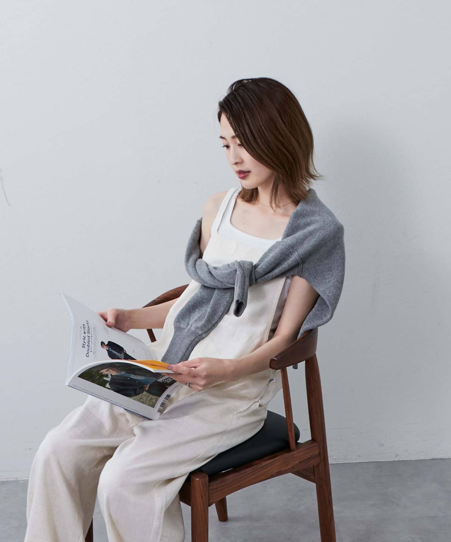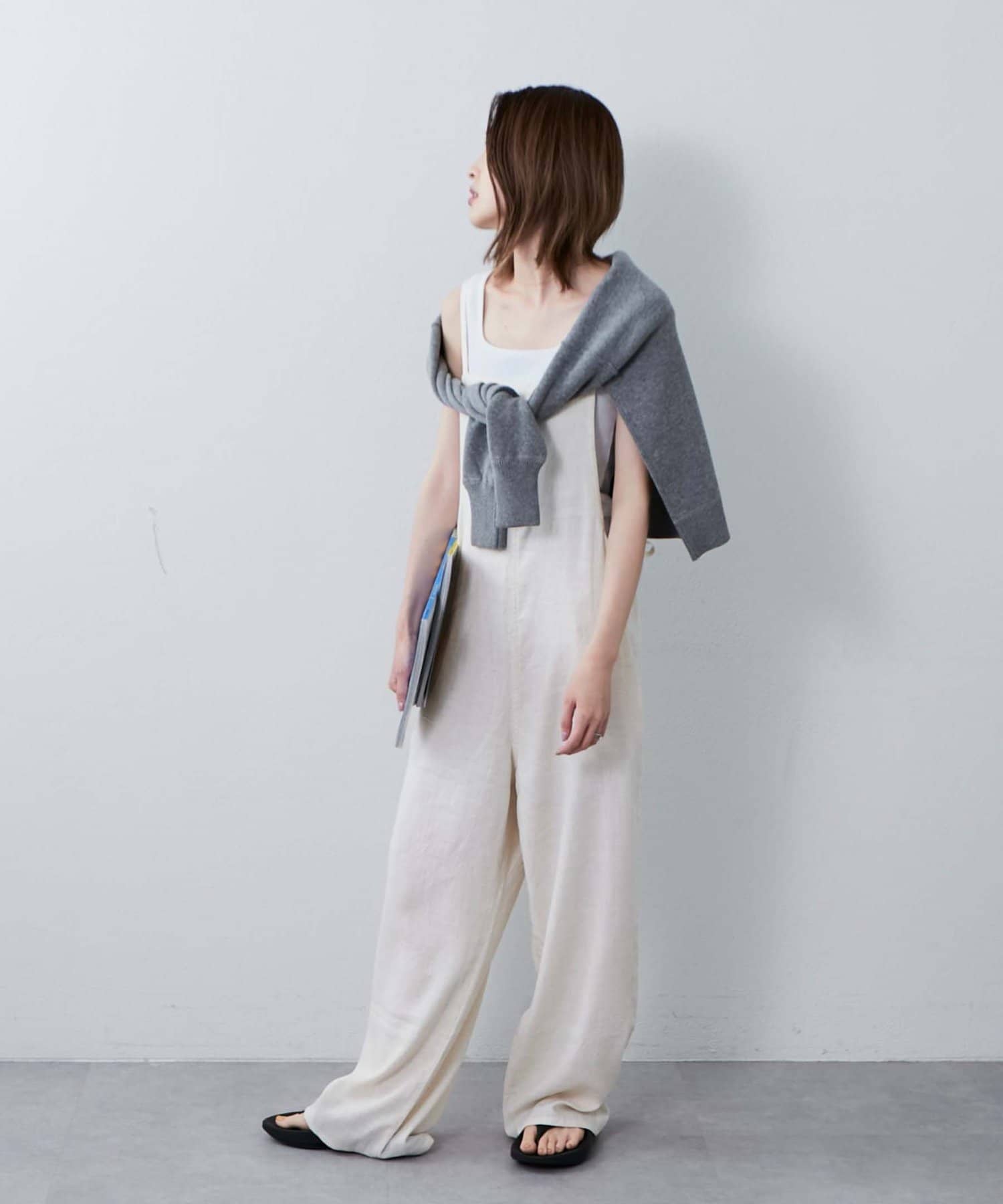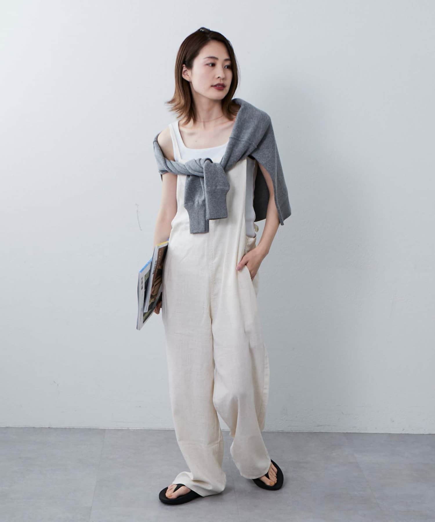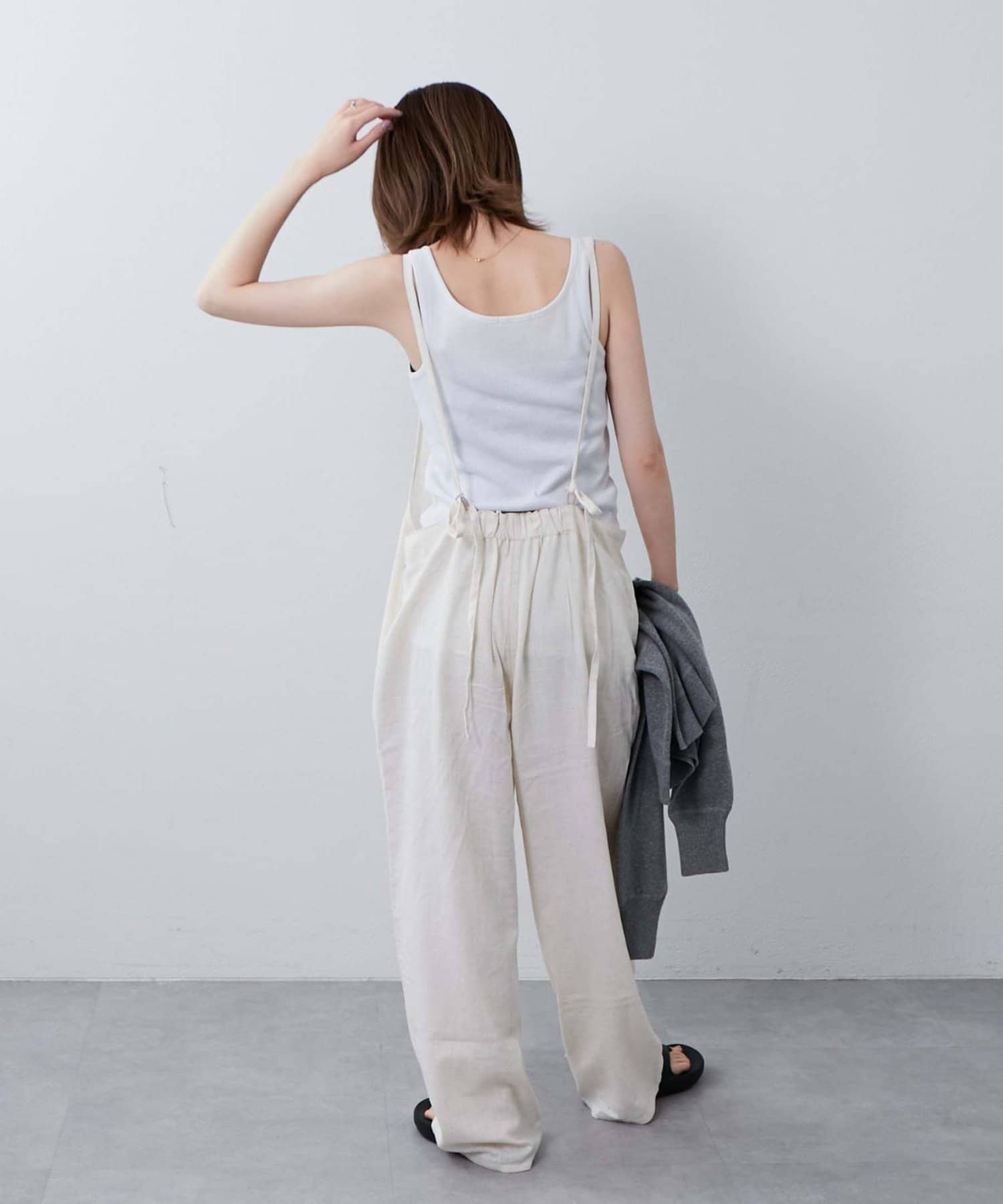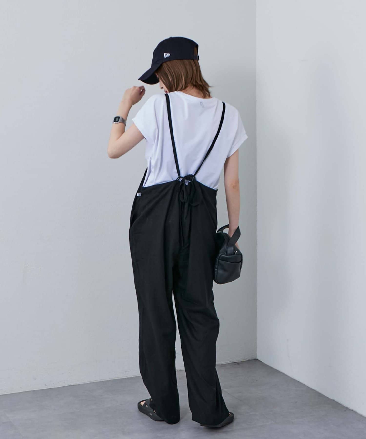 後ろの紐をクロスしたり、好みで結び方を変えてマルチに着られるサロペット。