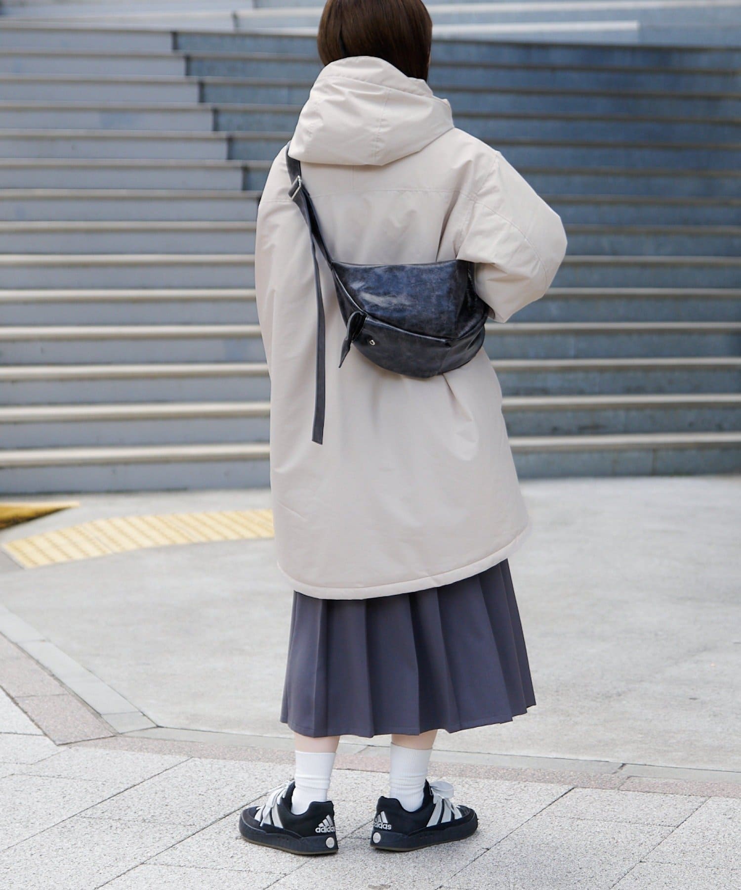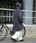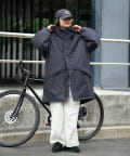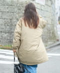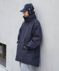 ネック部分にはフードが収納されており、天候やスタイリングに合わせてお使いいただけます。